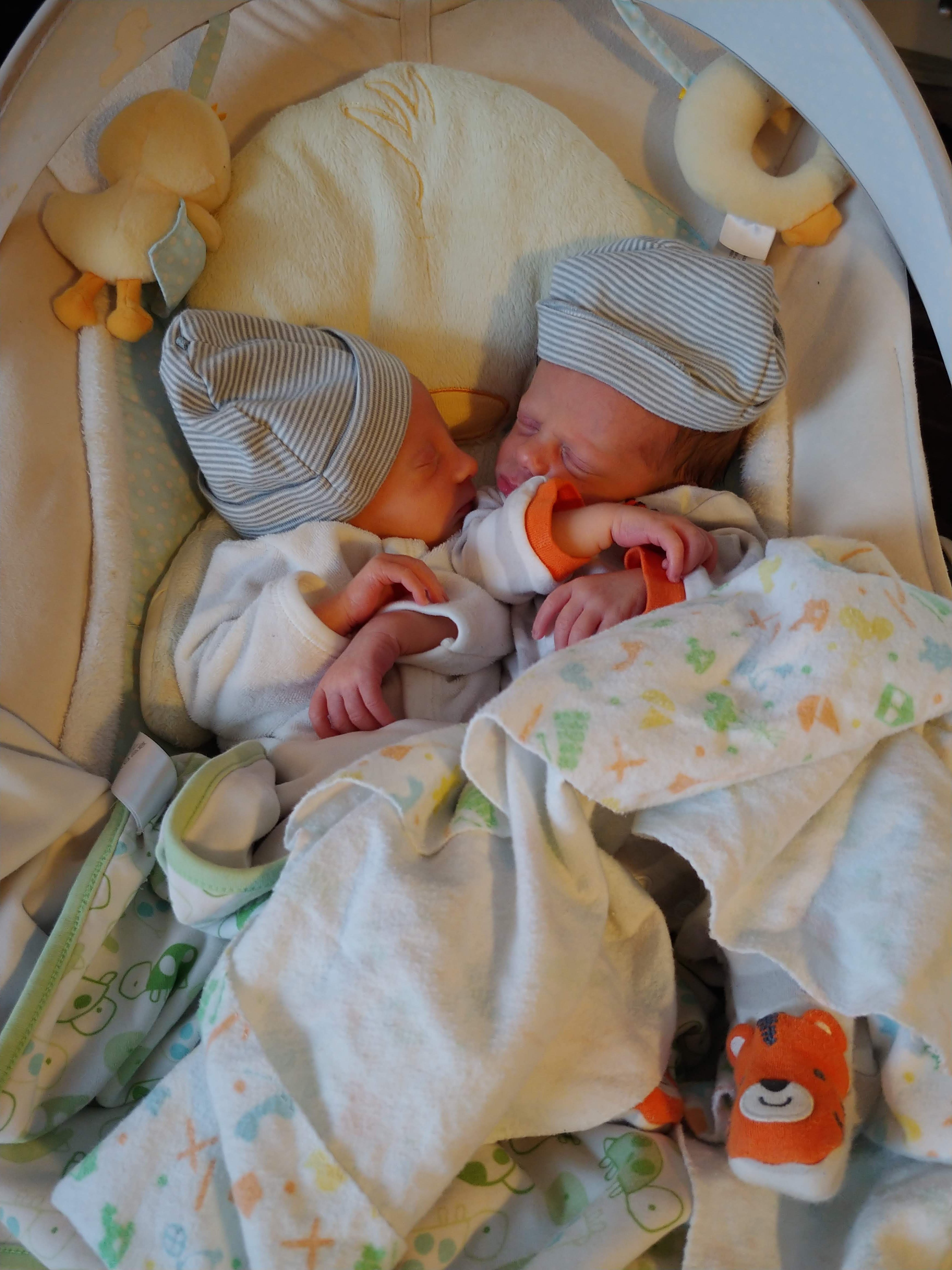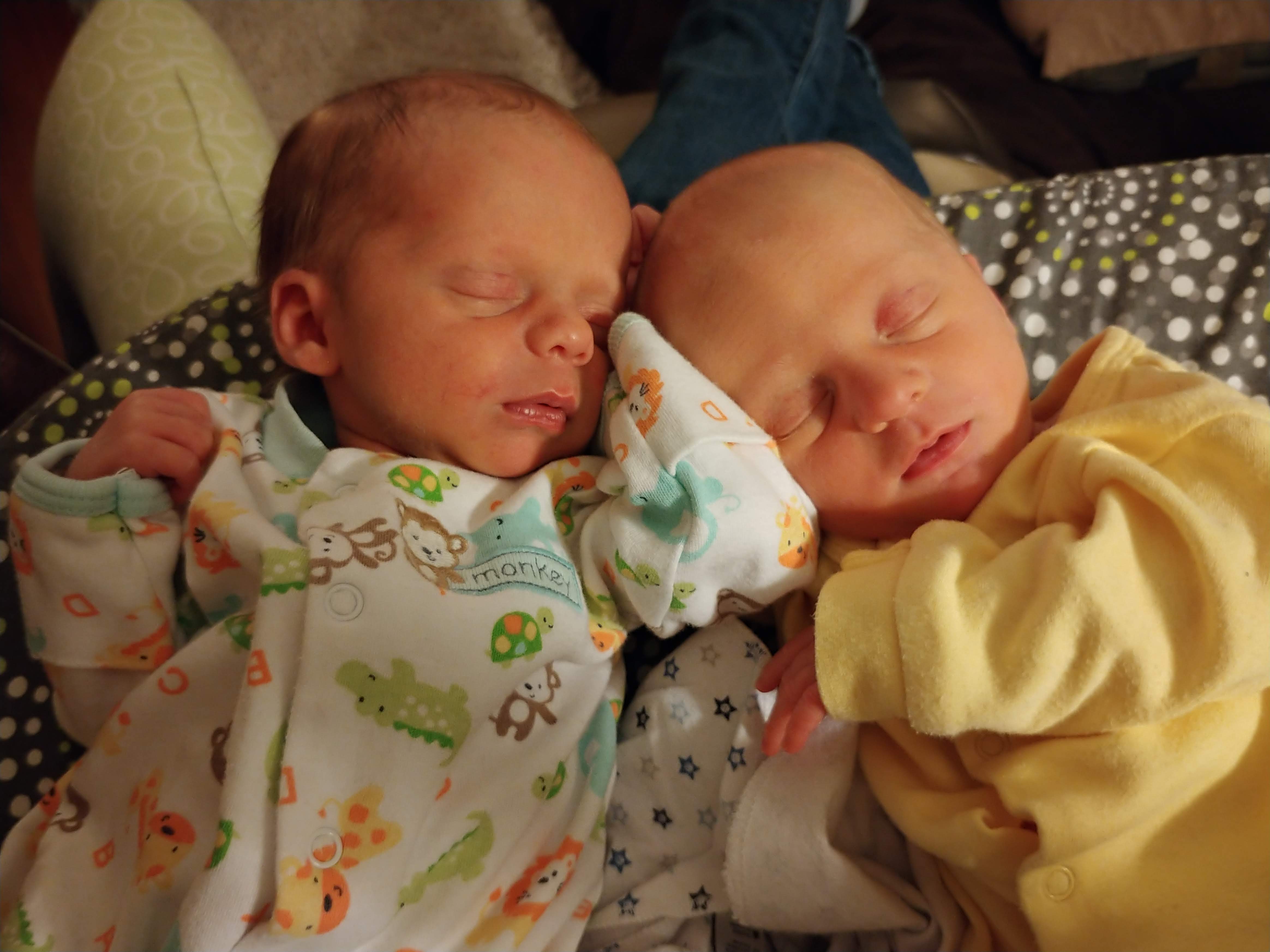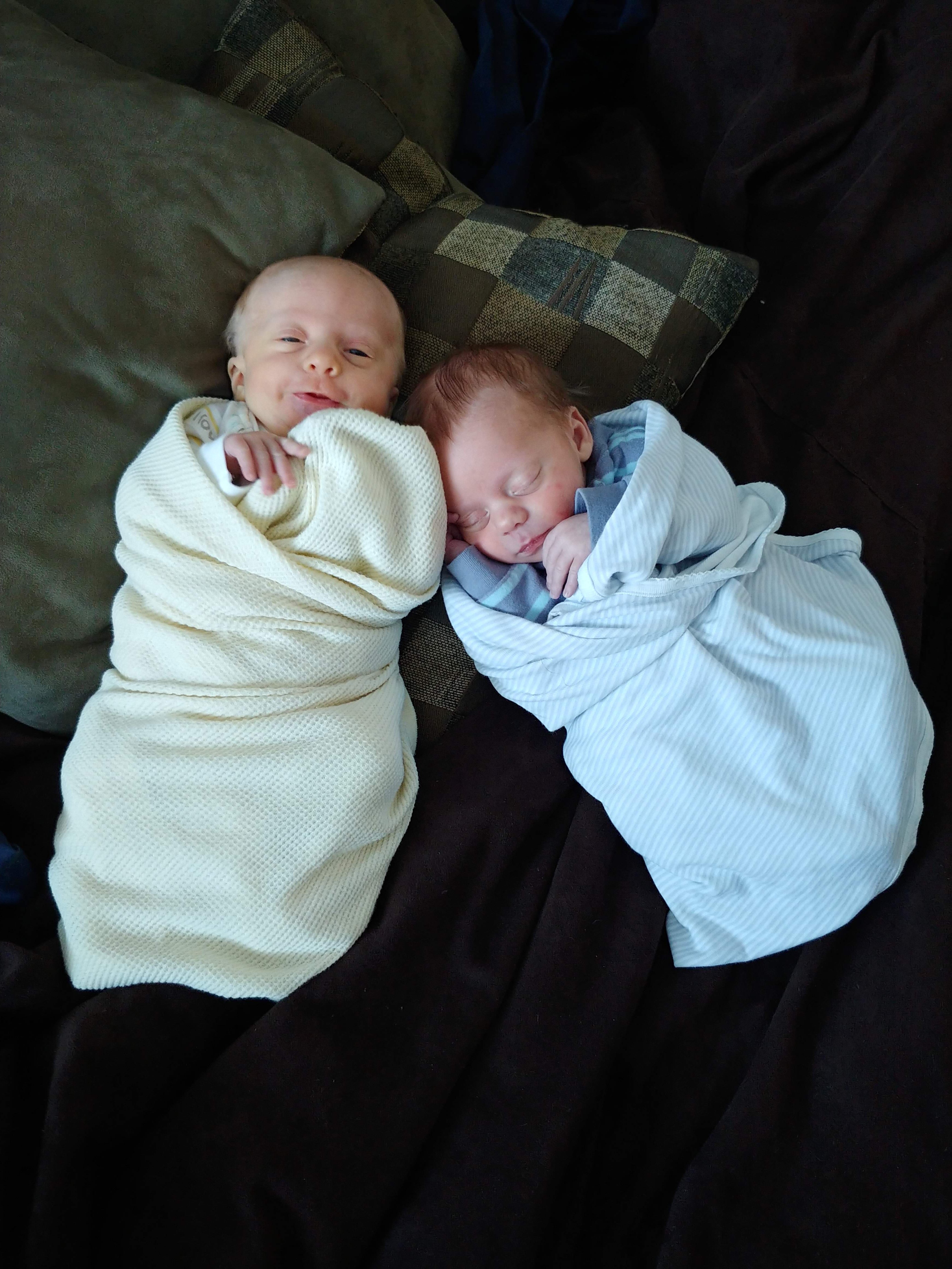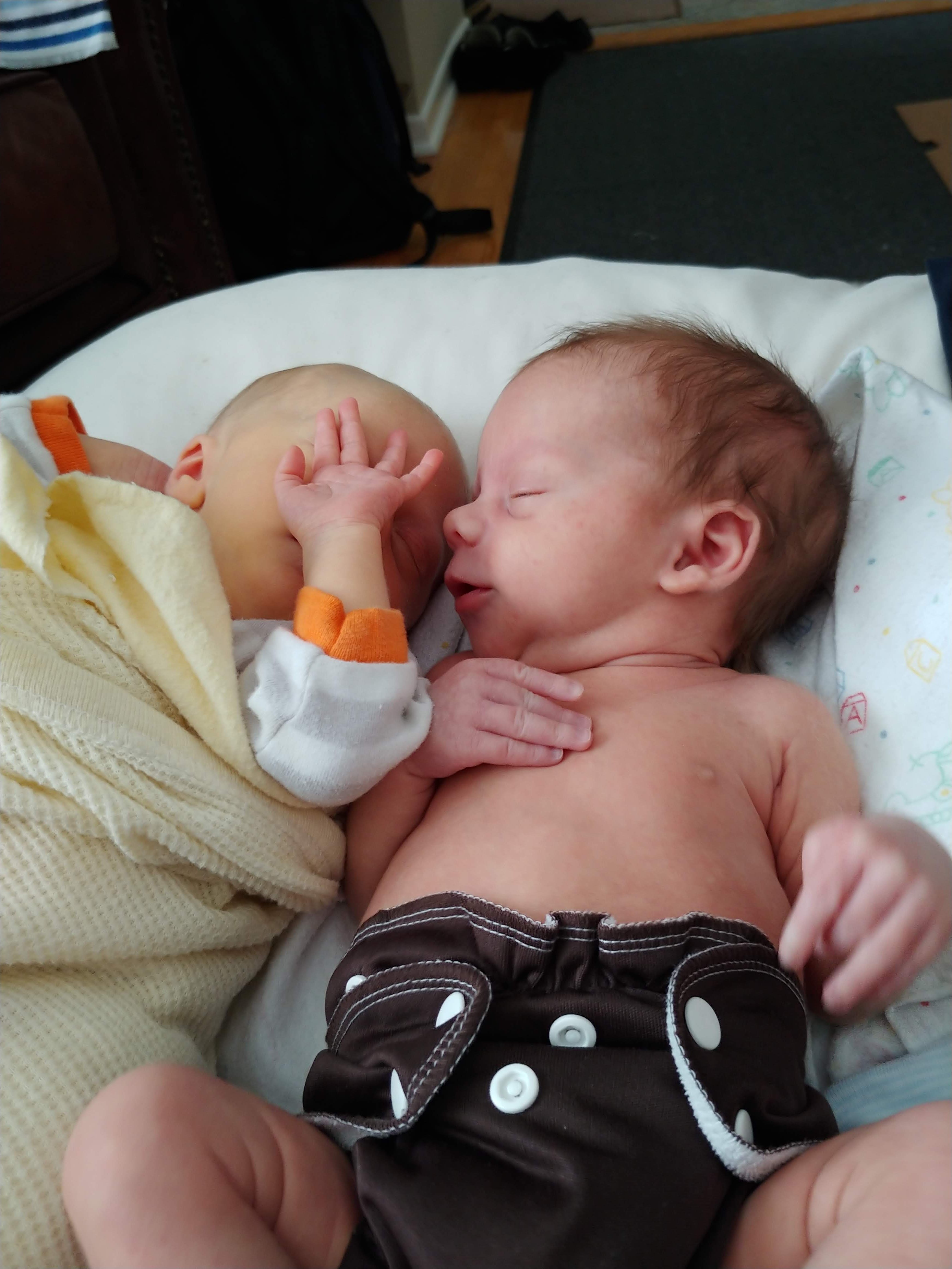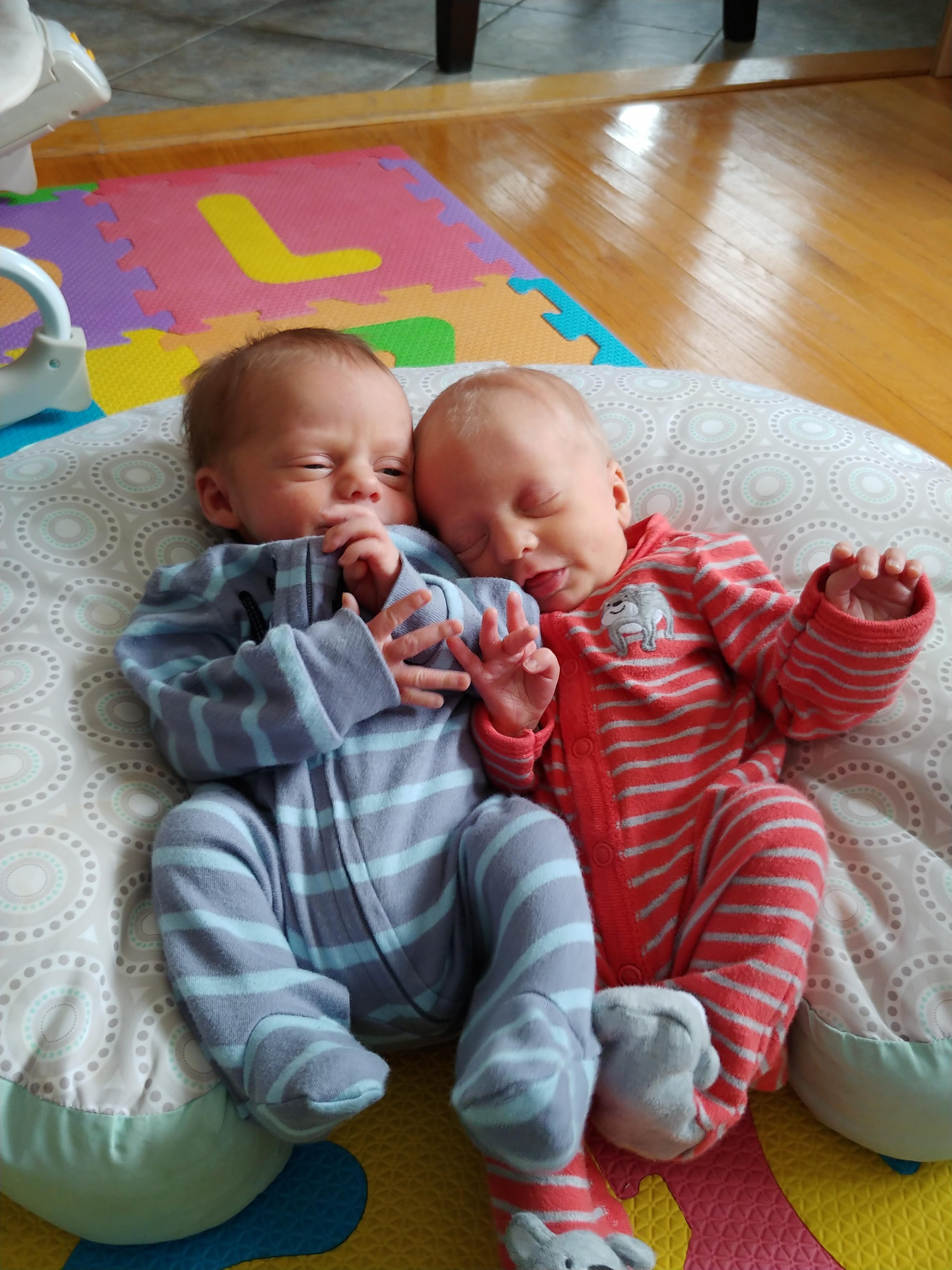 The babies are growing well and have outgrown a few sleepers already. They are now just over 7lbs, with Cadence in the lead at 7lbs 5oz. She remains more stretched out and sturdy, while Asher is always curled up and often snuggles up close to Cadence. There have been a few smiles and they are starting to spend more time awake. We are still camped in the livingroom with no expected end in sight, but it often feels more like a barn with the little lamb and goat noises coming from the crib…