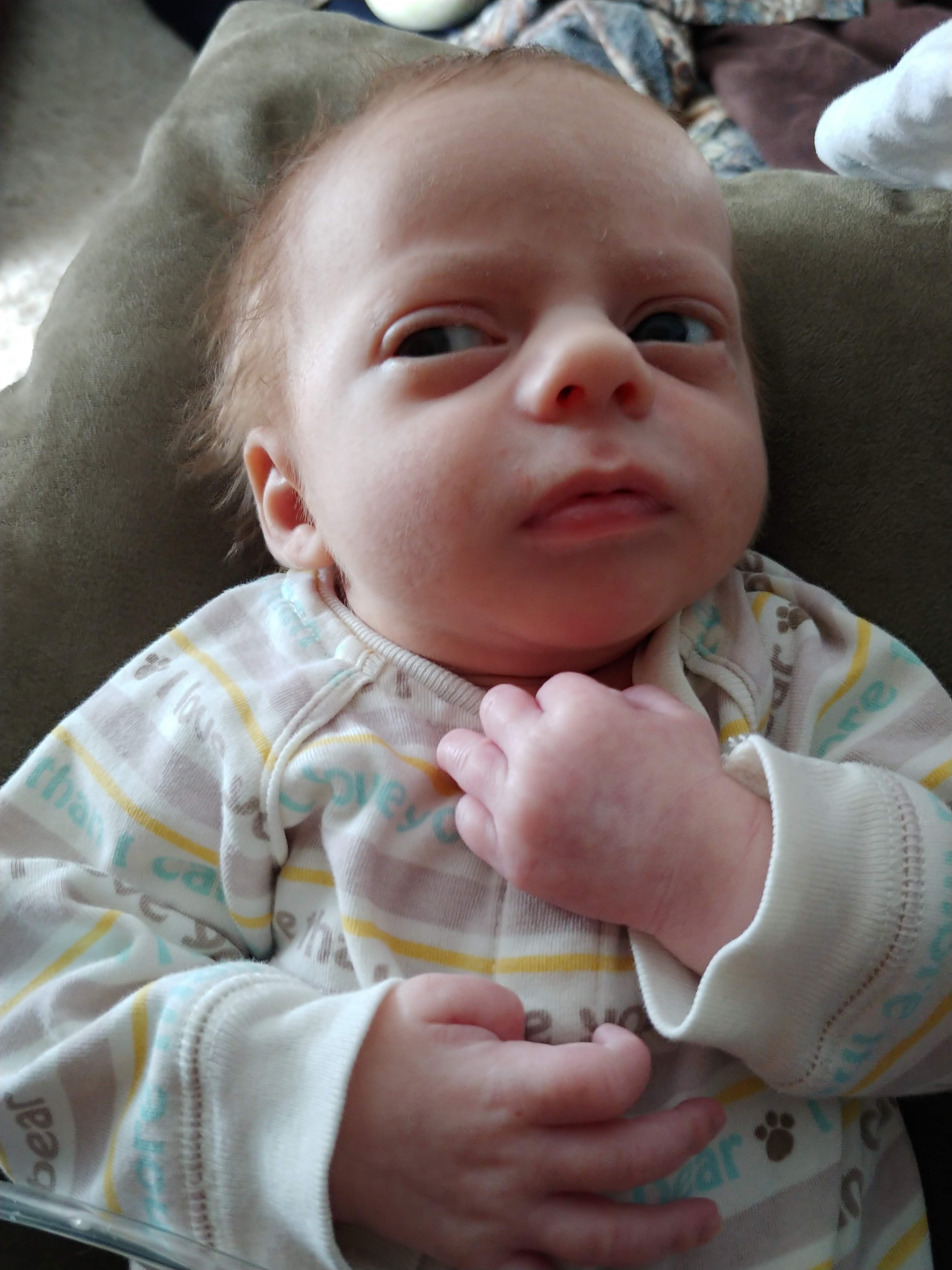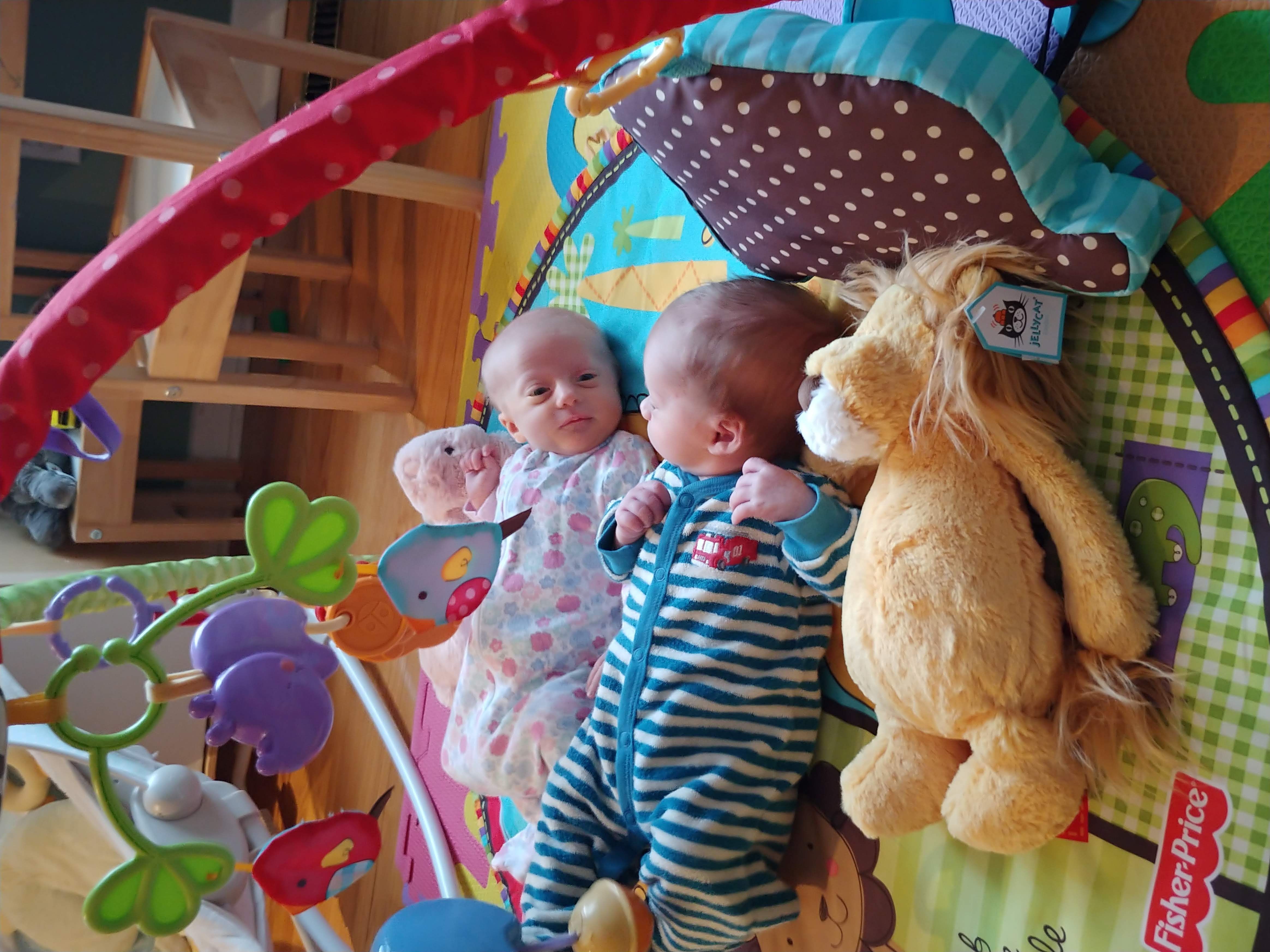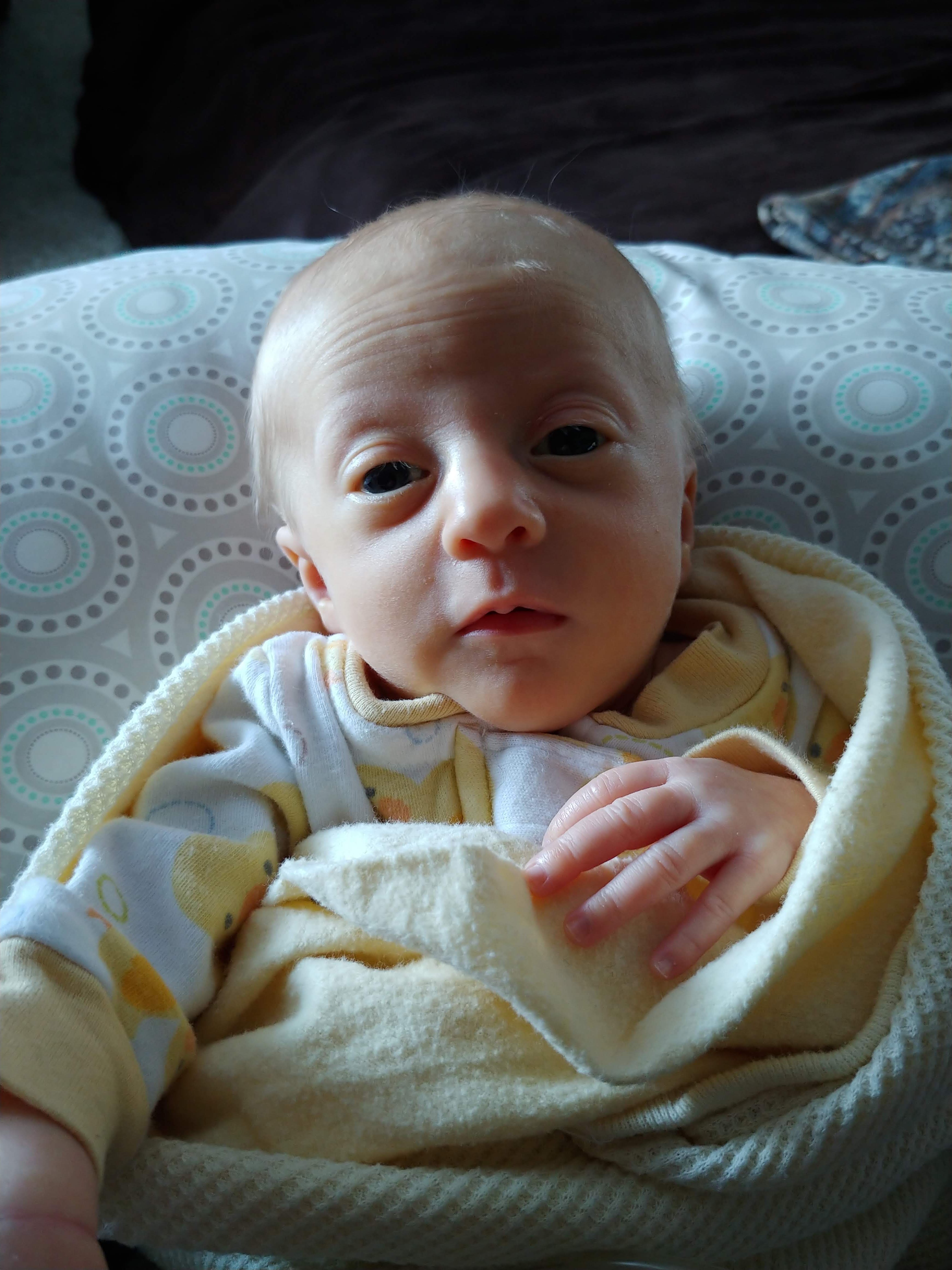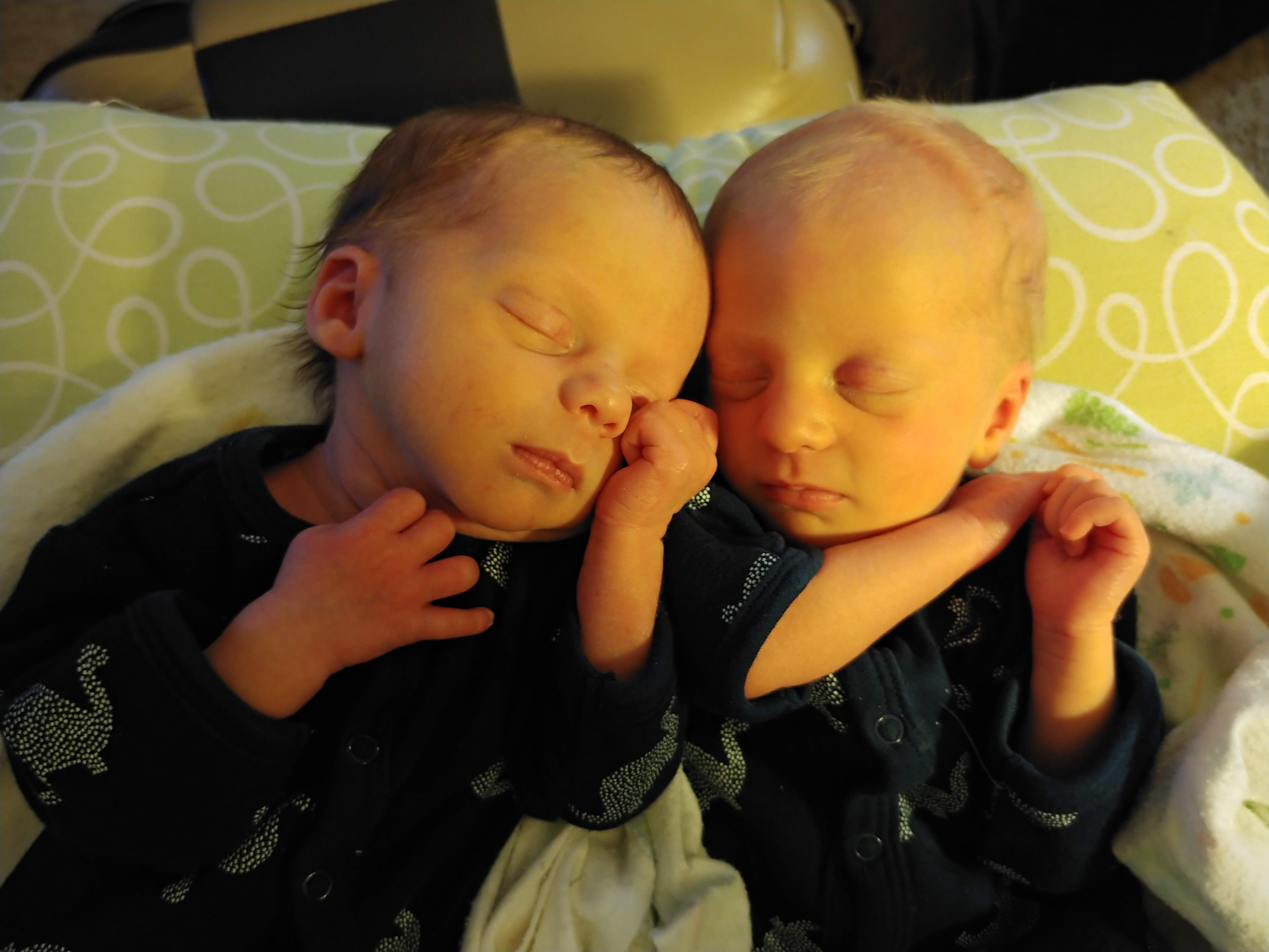 The babies are growing well and have outgrown a few sleepers already. They are now just over 7lbs, with Cadence in the lead at 7lbs 5oz. She remains more stretched out and sturdy, while Asher is always curled up and often snuggles up close to Cadence. There have been a few smiles and they are starting to spend more time awake. We are still camped in the livingroom with no expected end in sight, but it often feels more like a barn with the little lamb and goat noises coming from the crib…