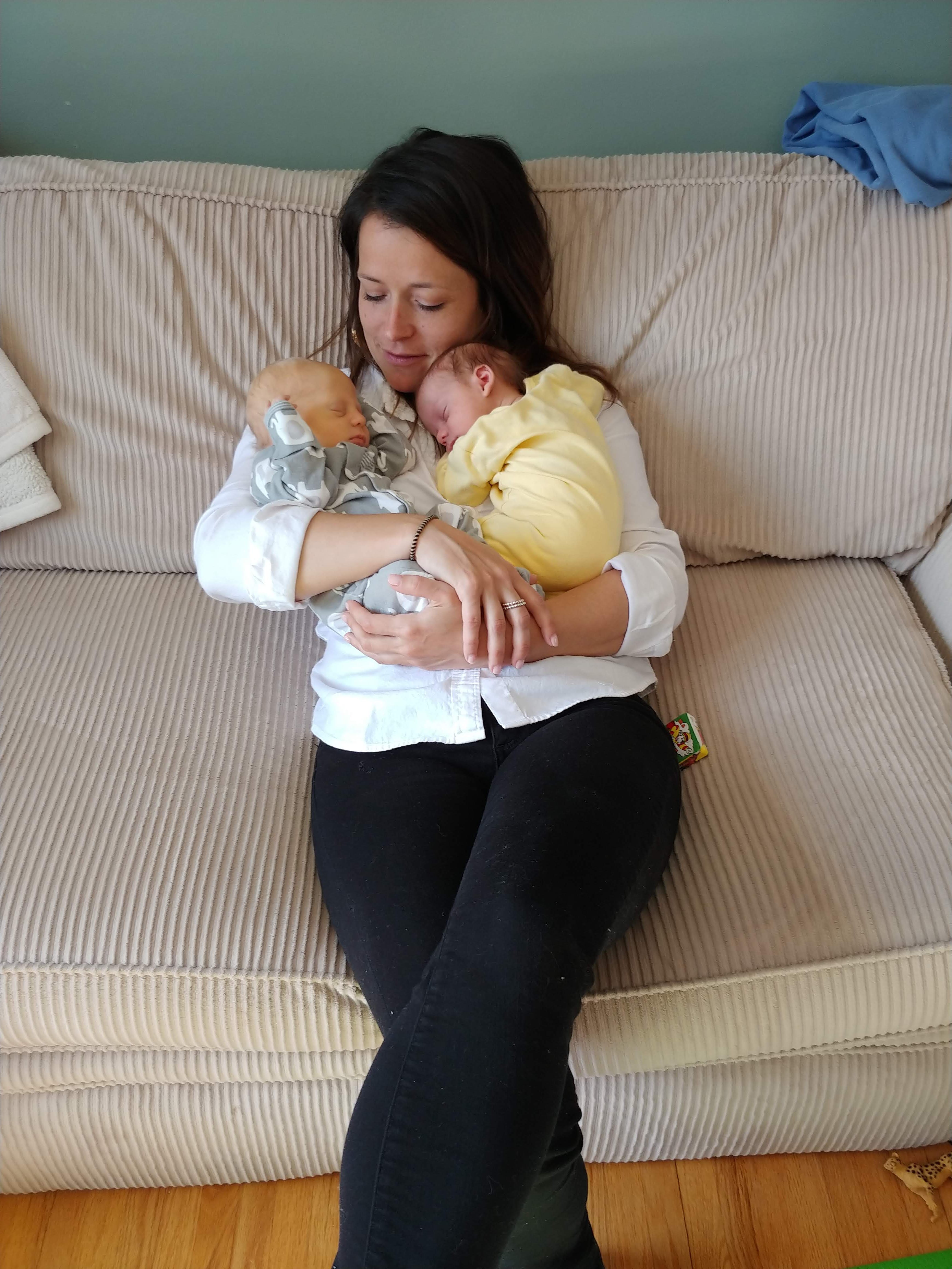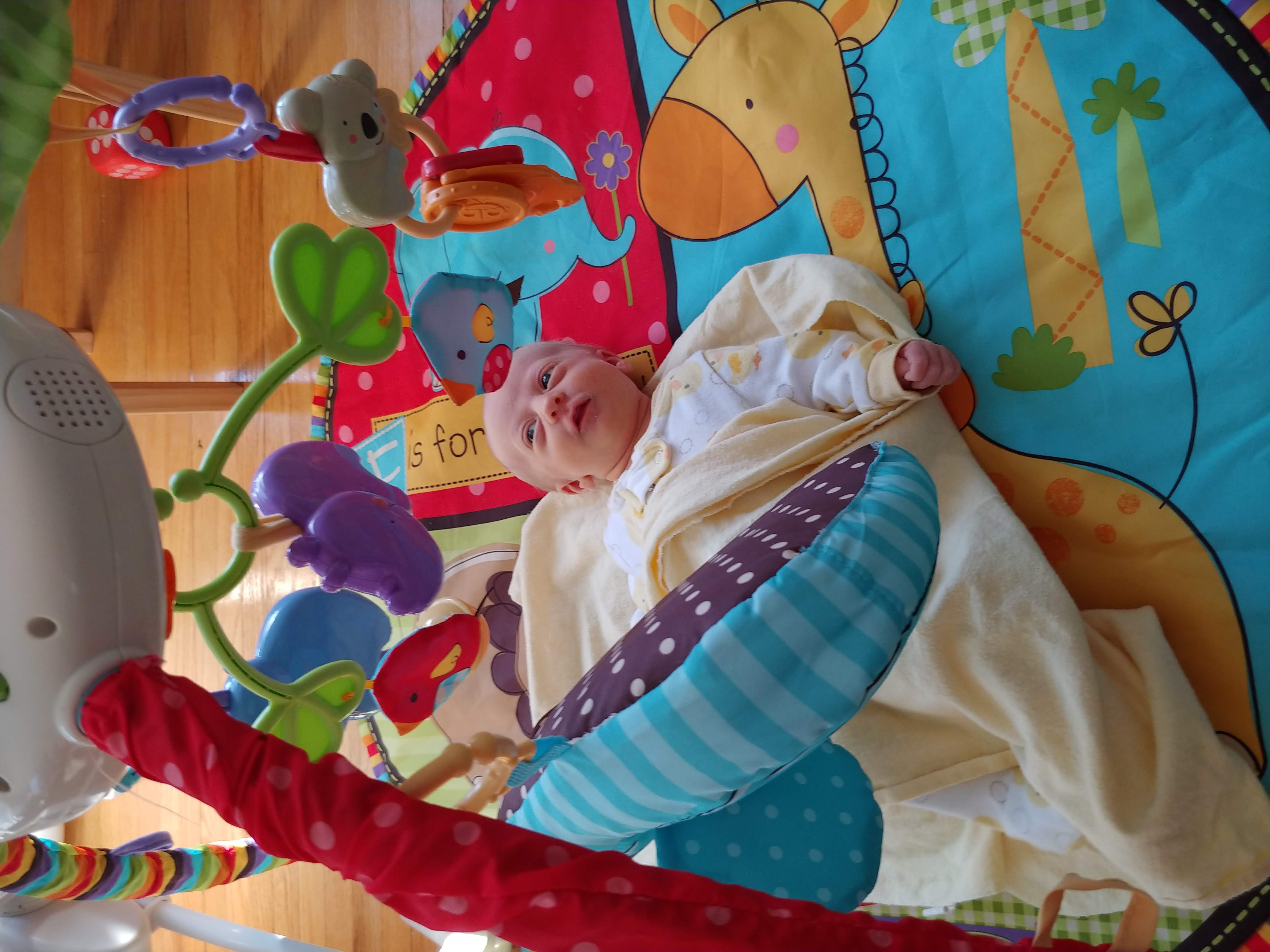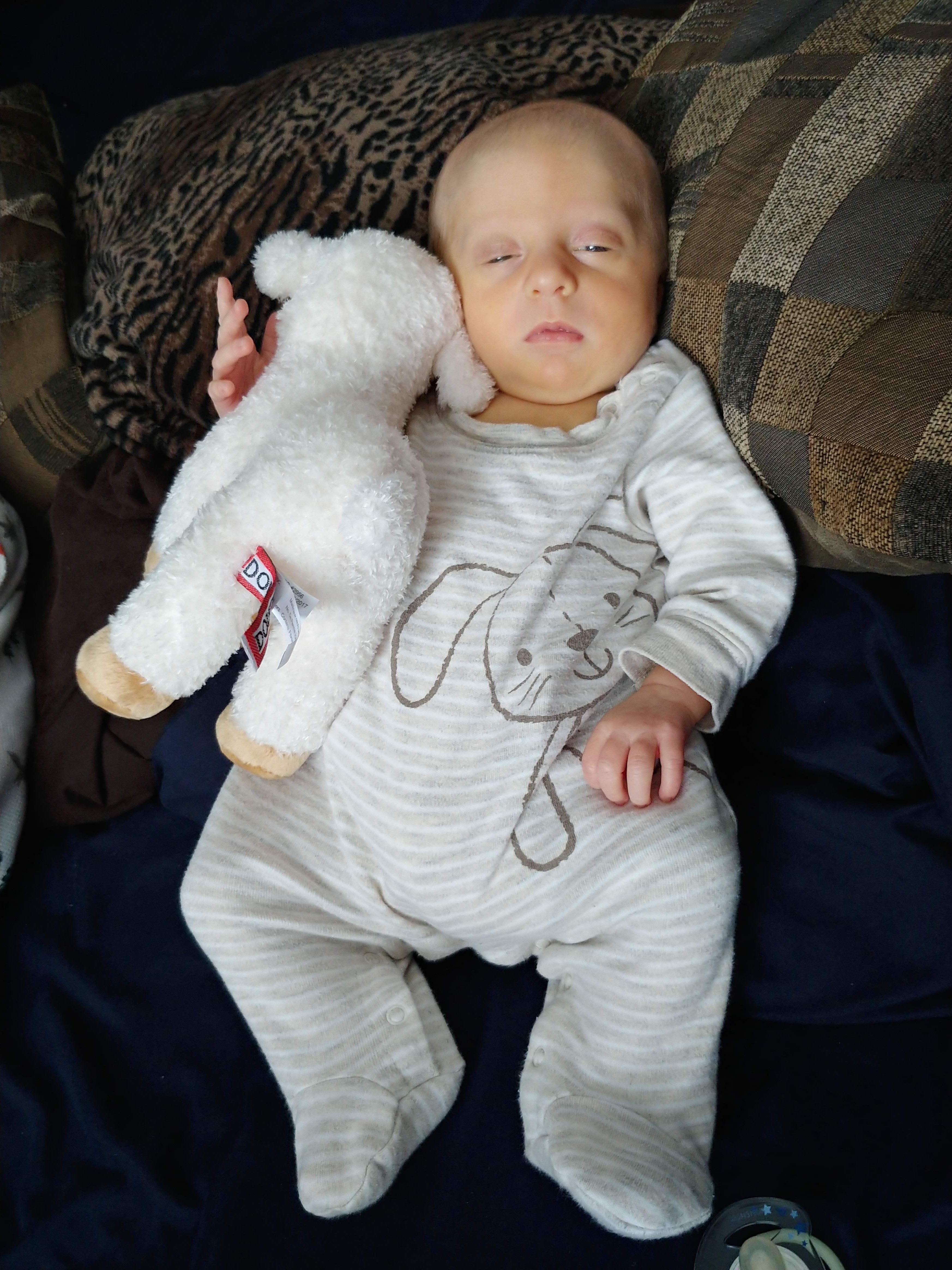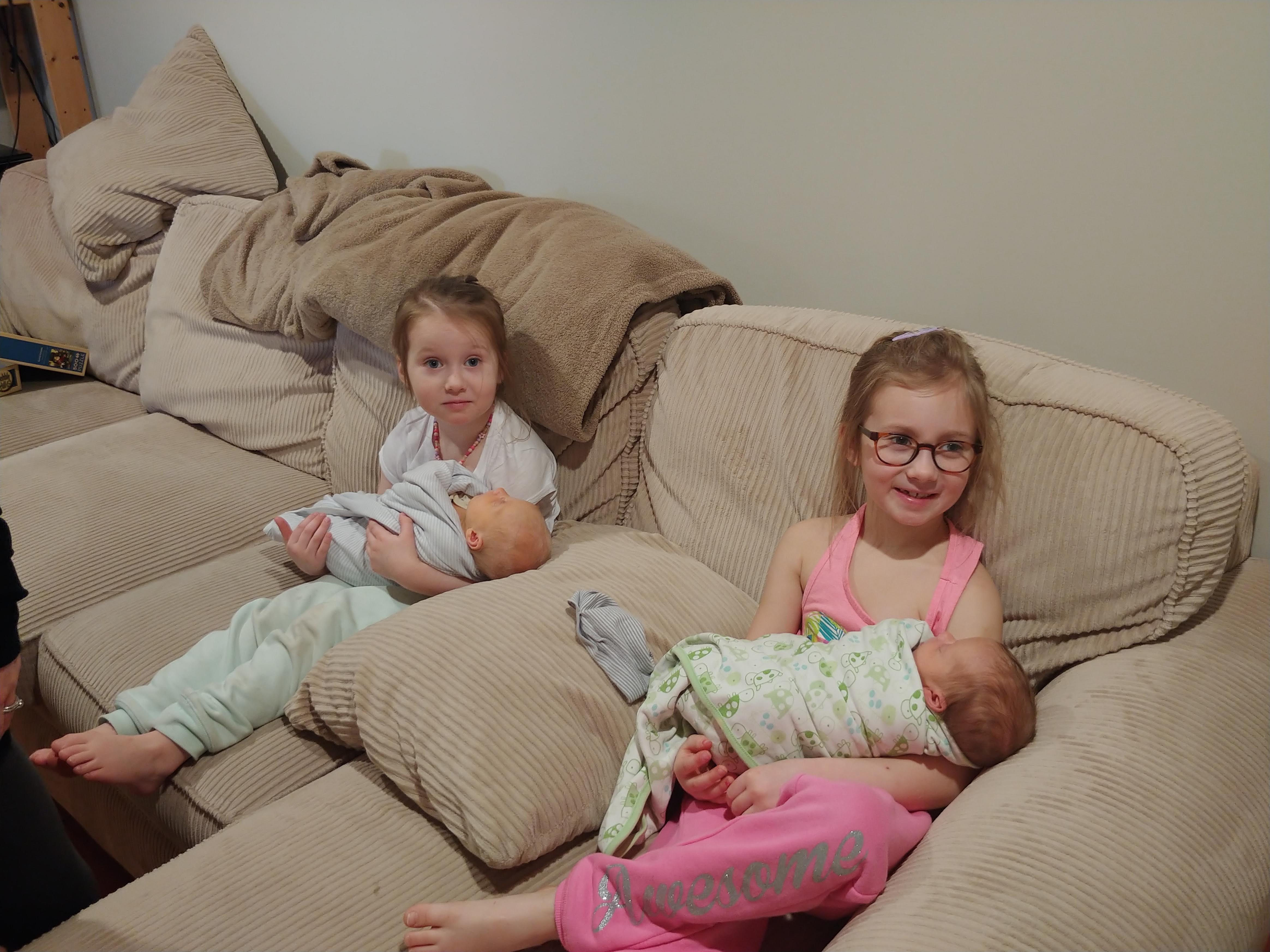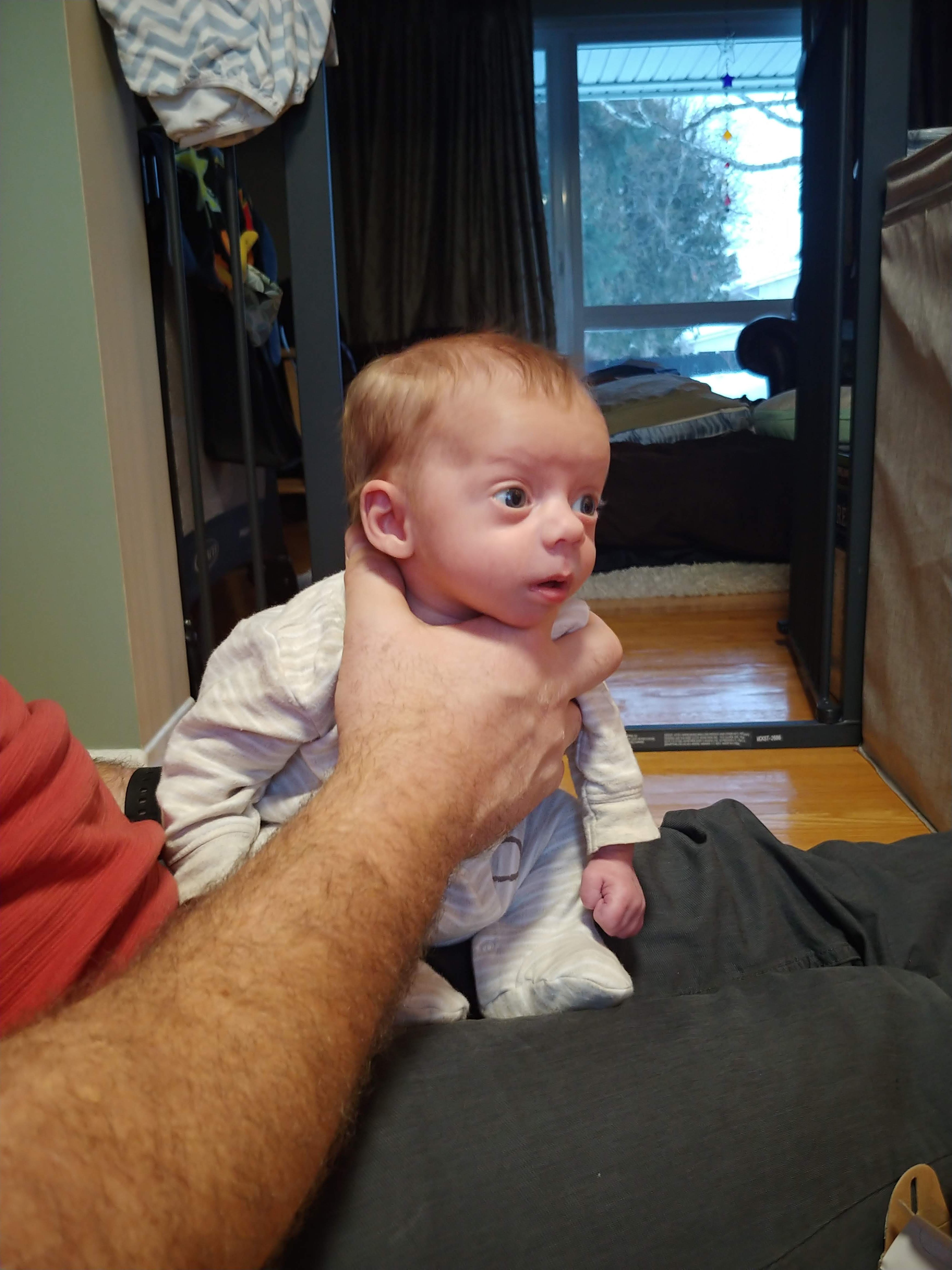 The babies are growing well and have outgrown a few sleepers already. They are now just over 7lbs, with Cadence in the lead at 7lbs 5oz. She remains more stretched out and sturdy, while Asher is always curled up and often snuggles up close to Cadence. There have been a few smiles and they are starting to spend more time awake. We are still camped in the livingroom with no expected end in sight, but it often feels more like a barn with the little lamb and goat noises coming from the crib…