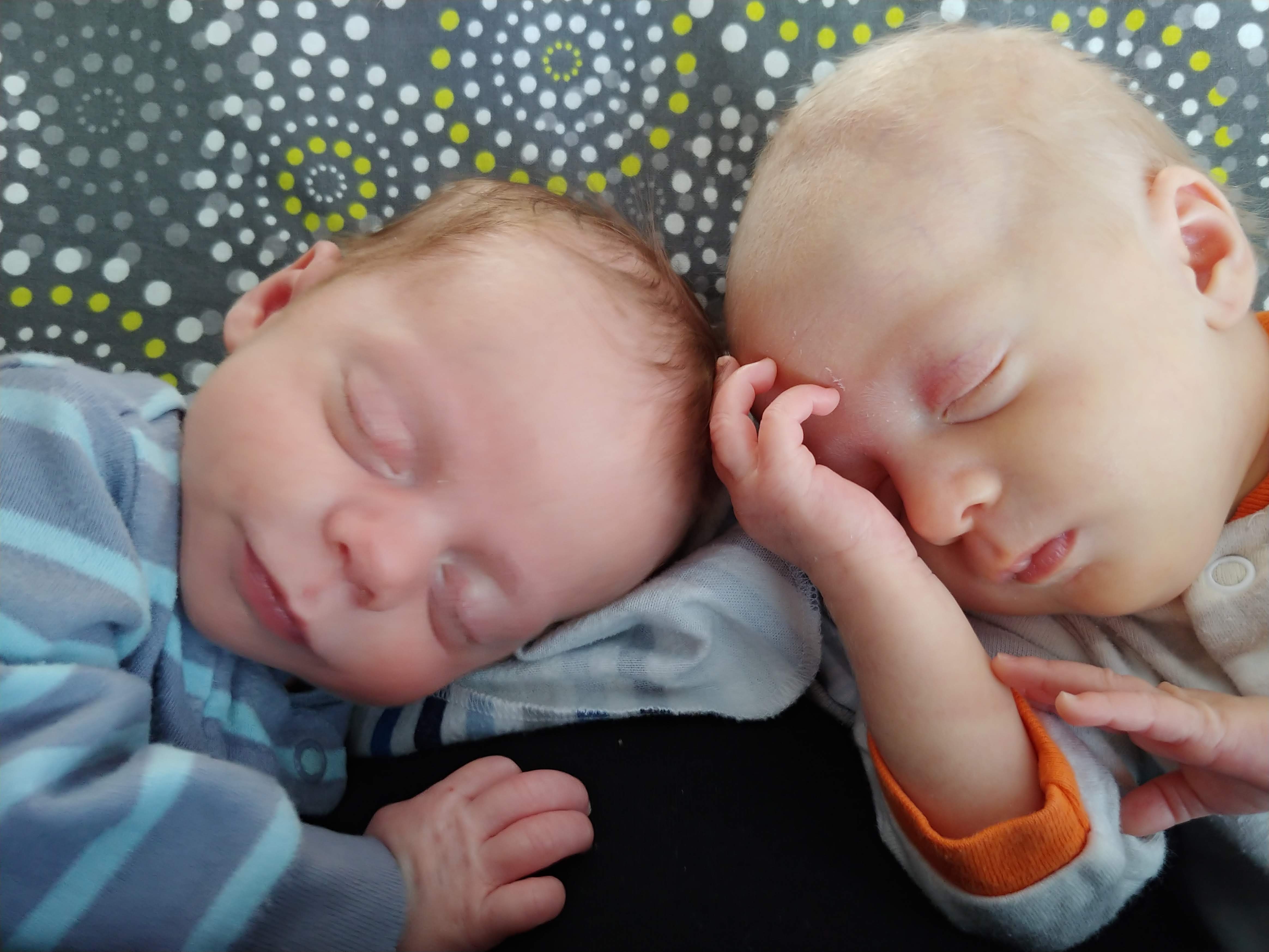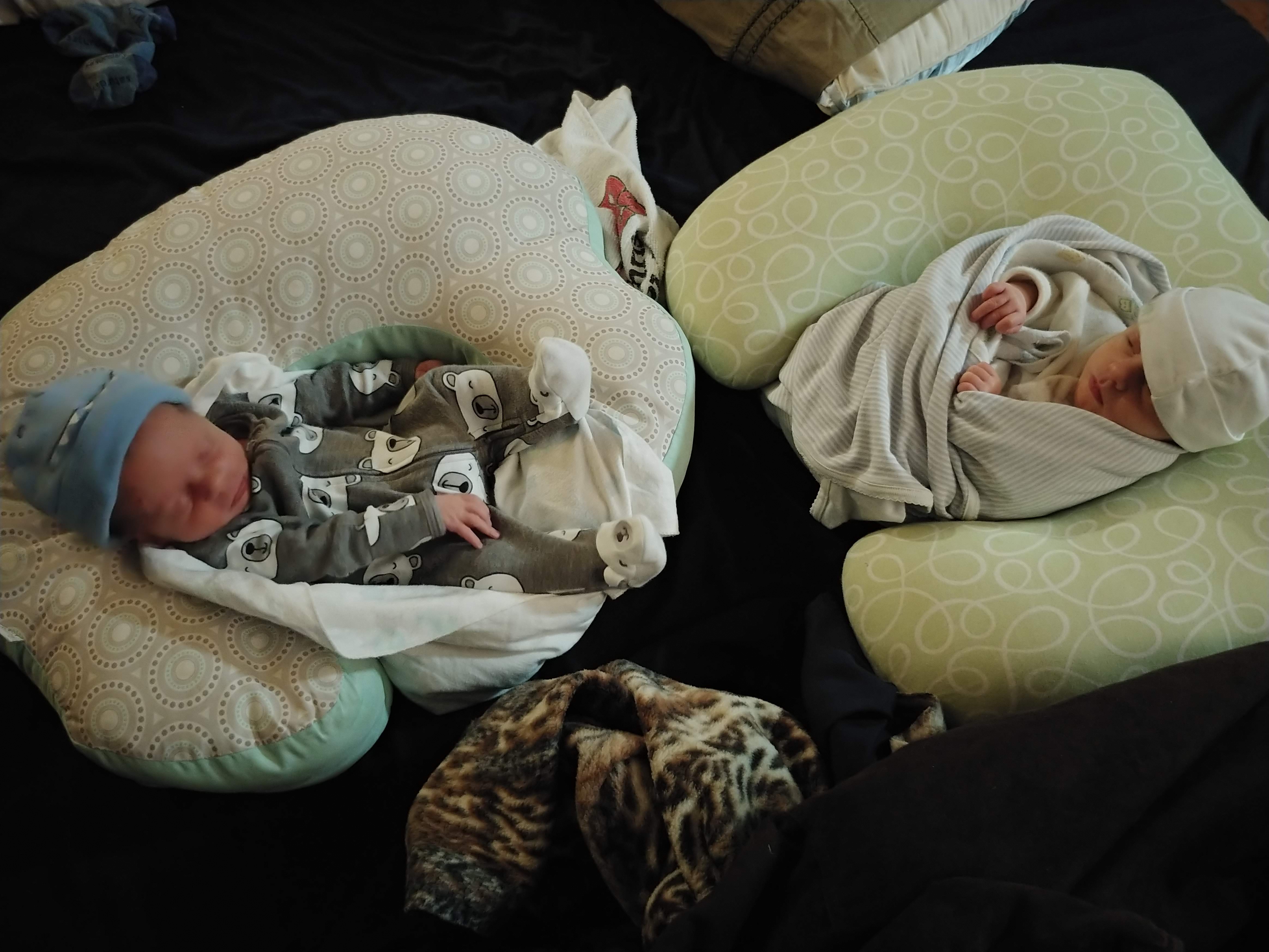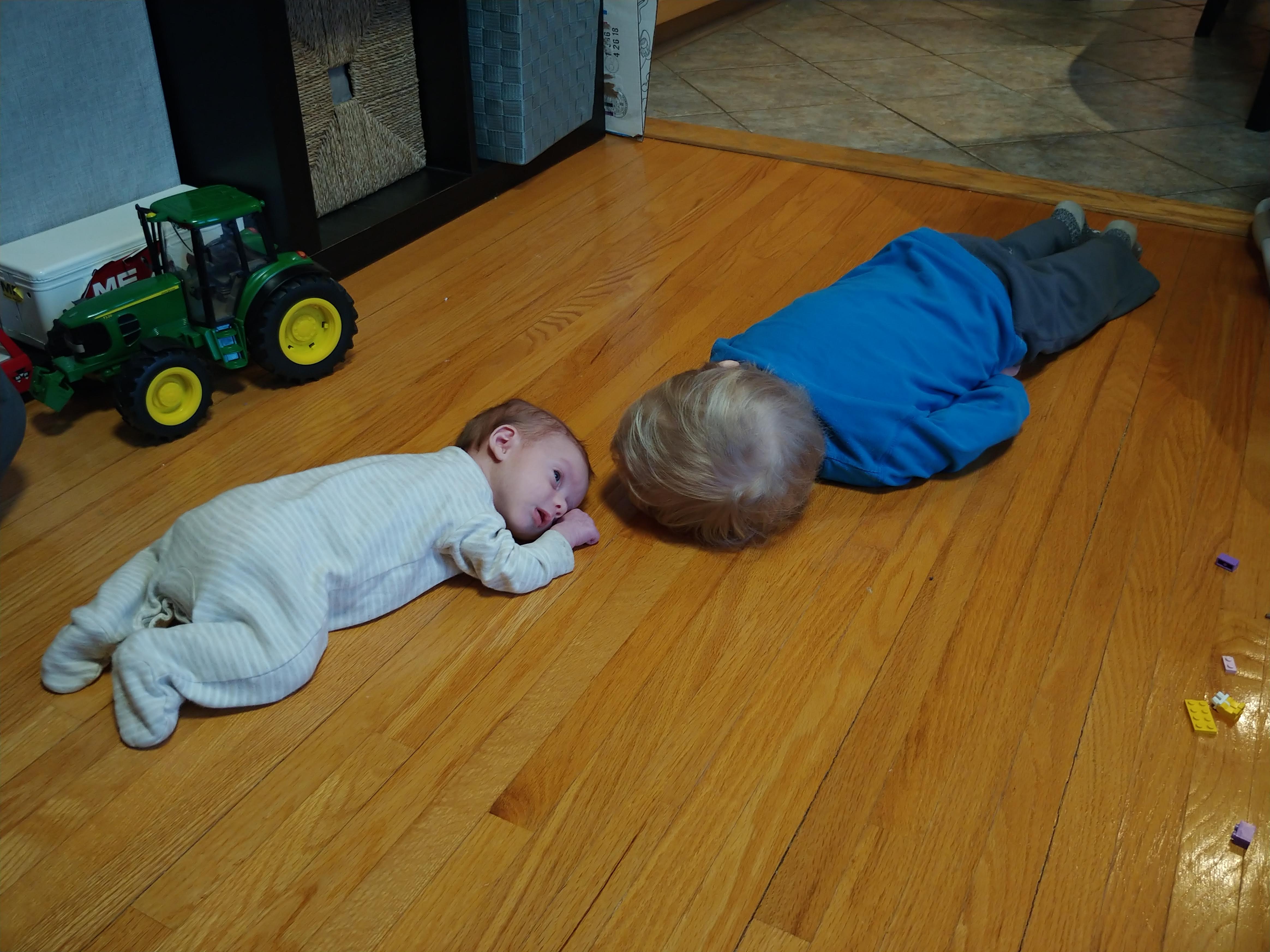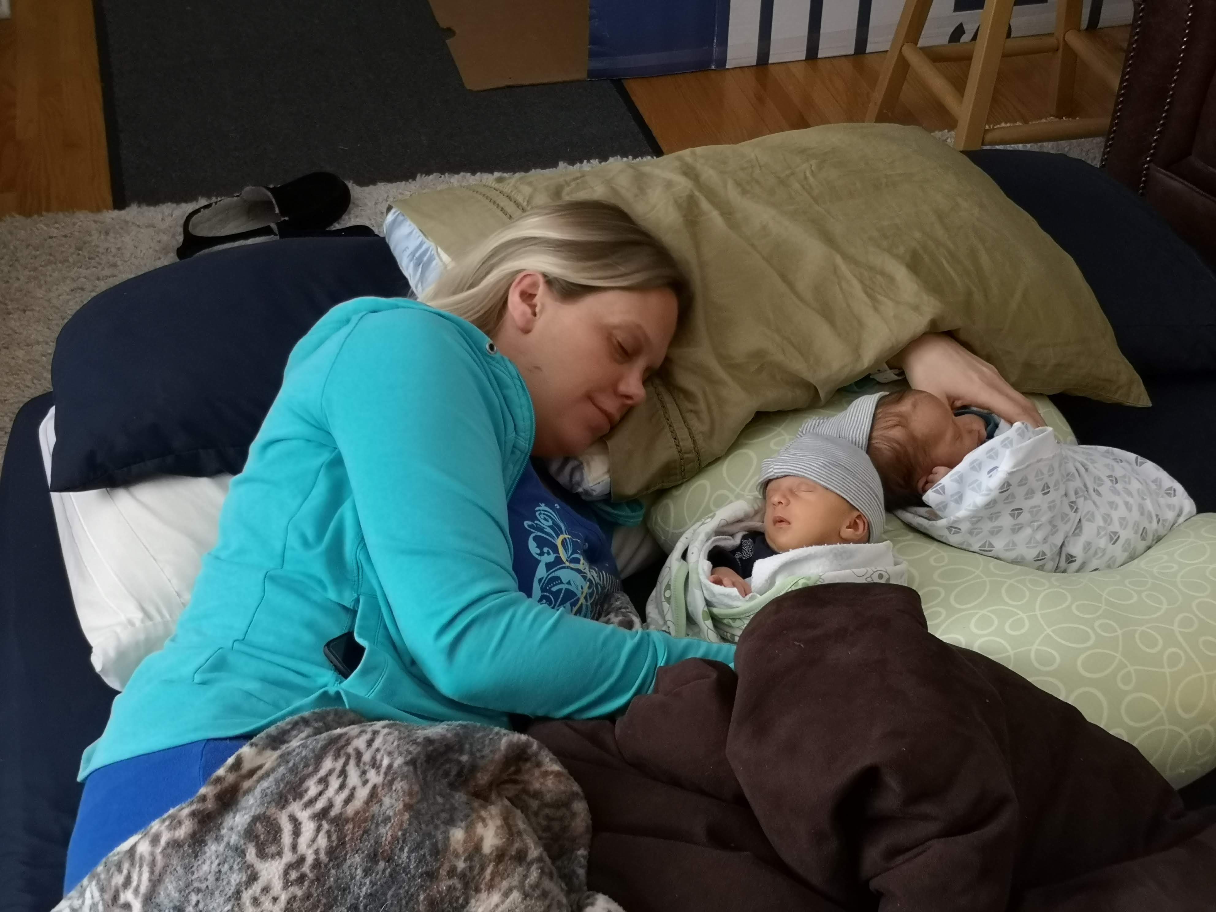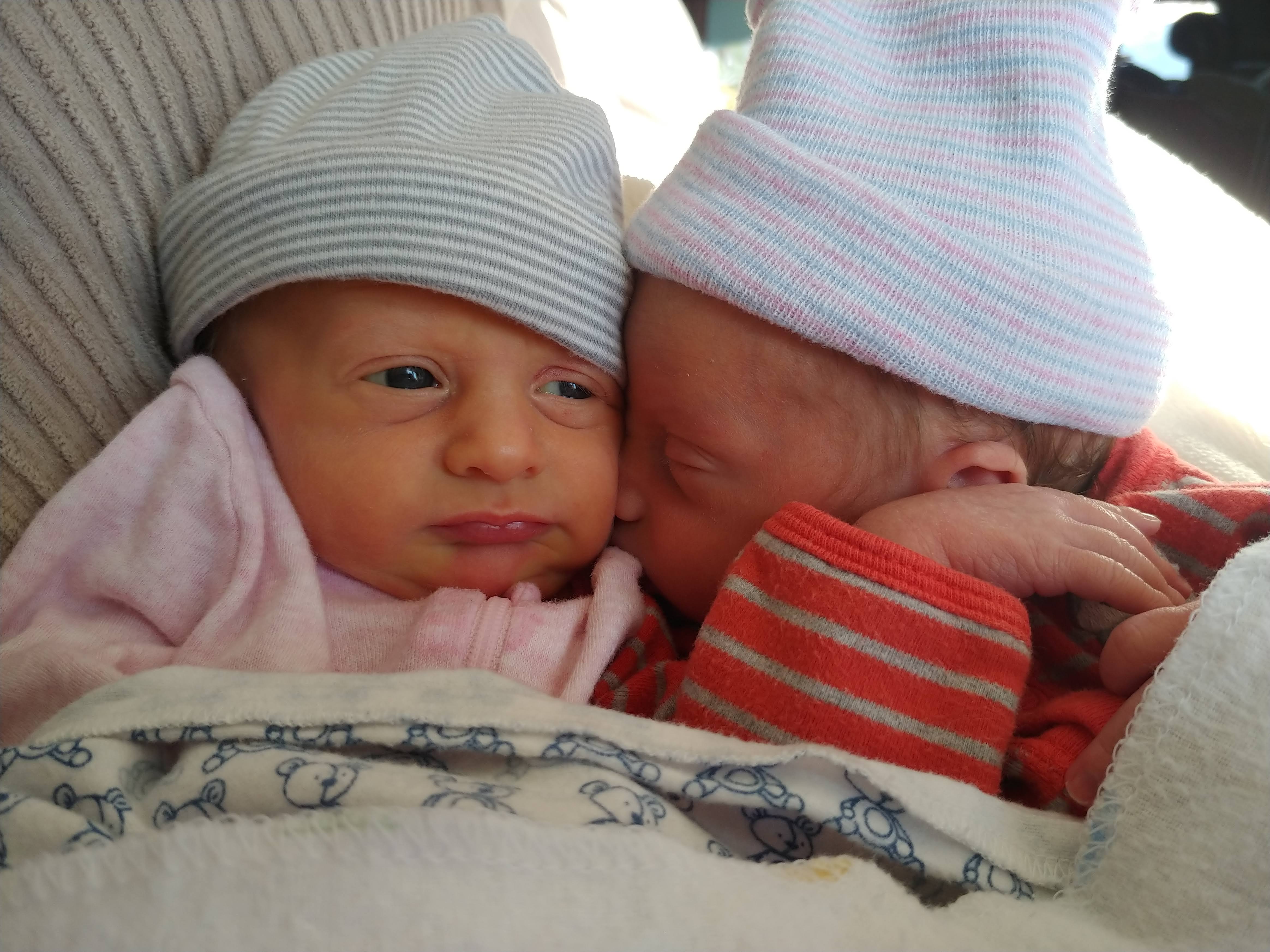 The babies are growing well and have outgrown a few sleepers already. They are now just over 7lbs, with Cadence in the lead at 7lbs 5oz. She remains more stretched out and sturdy, while Asher is always curled up and often snuggles up close to Cadence. There have been a few smiles and they are starting to spend more time awake. We are still camped in the livingroom with no expected end in sight, but it often feels more like a barn with the little lamb and goat noises coming from the crib…