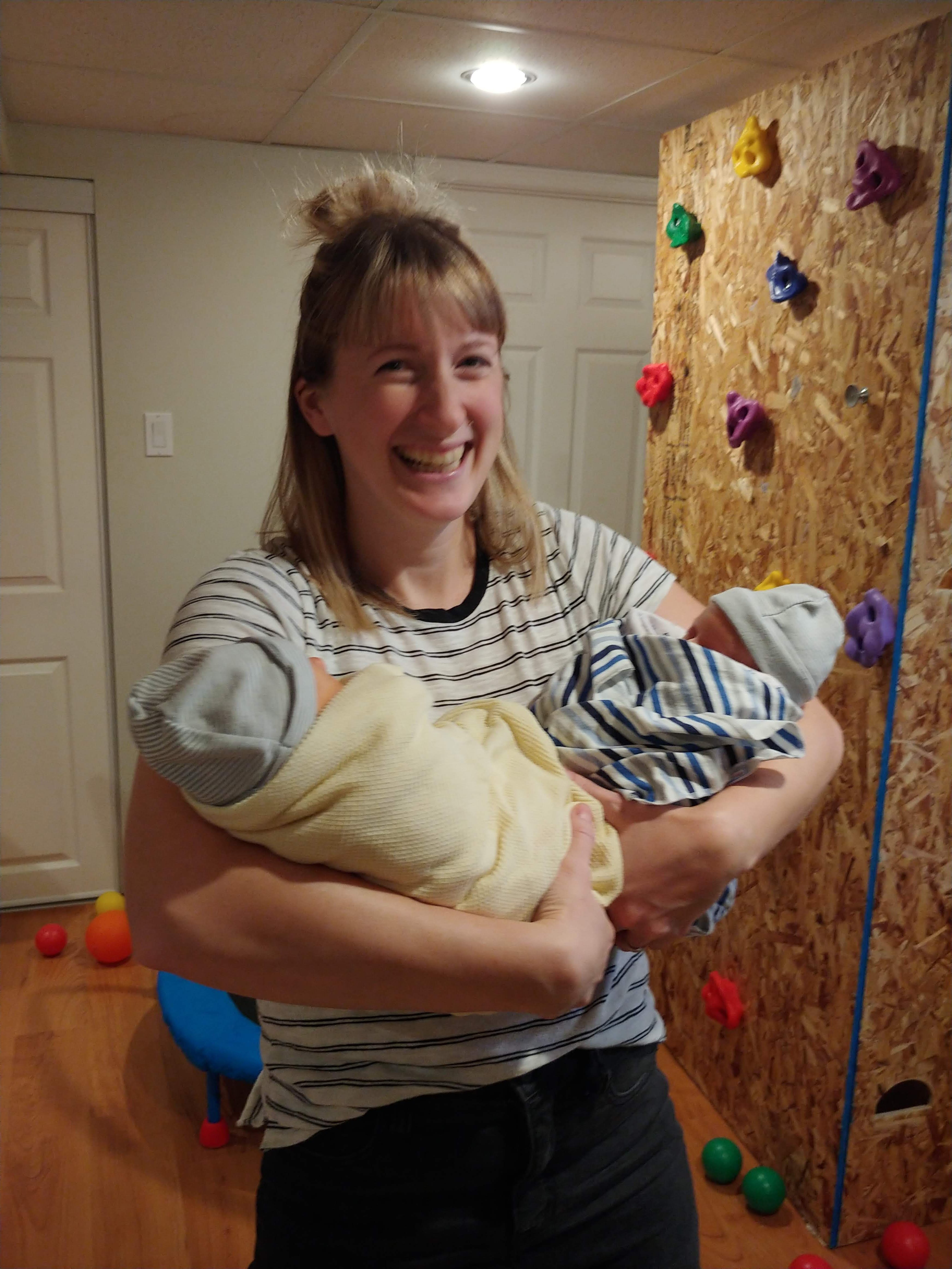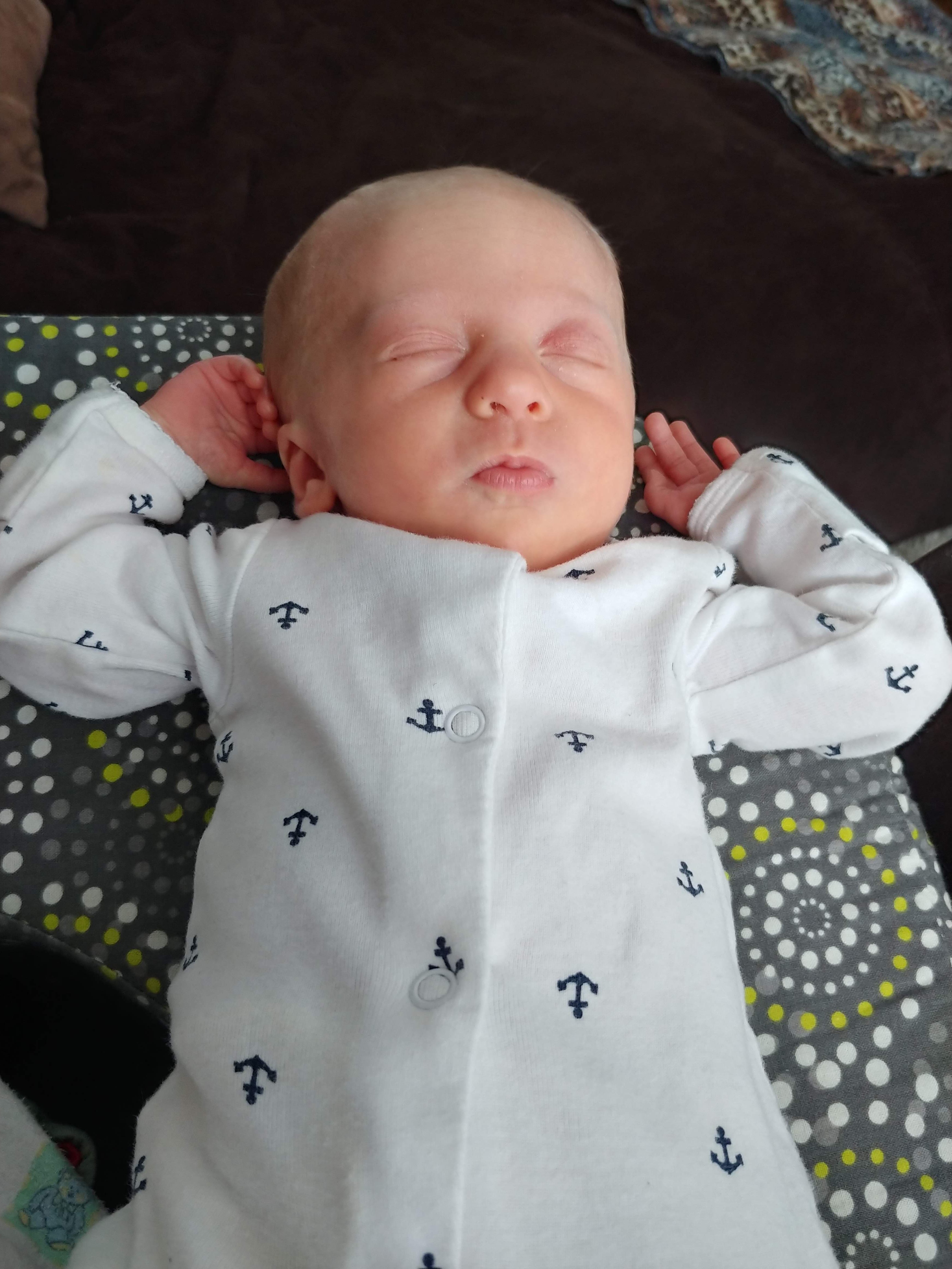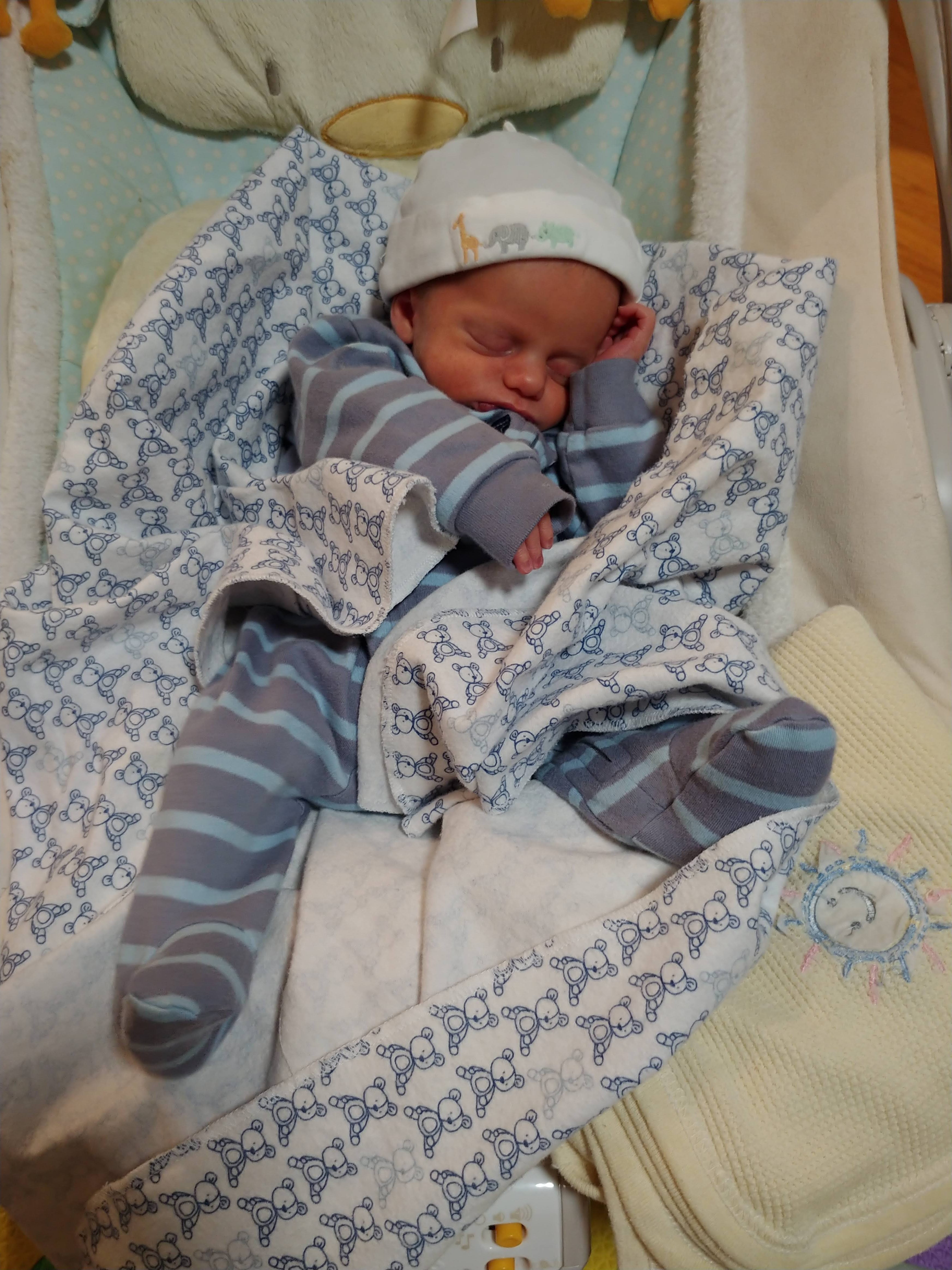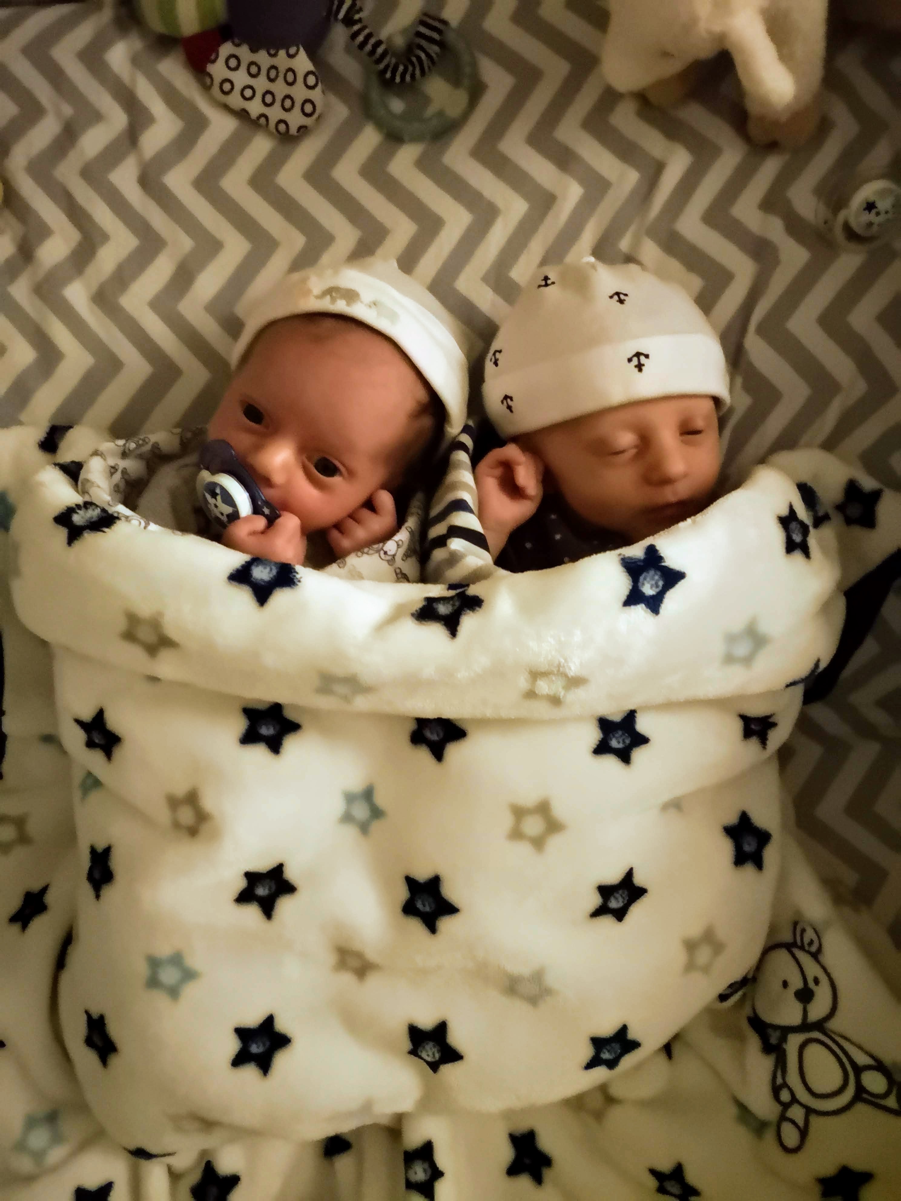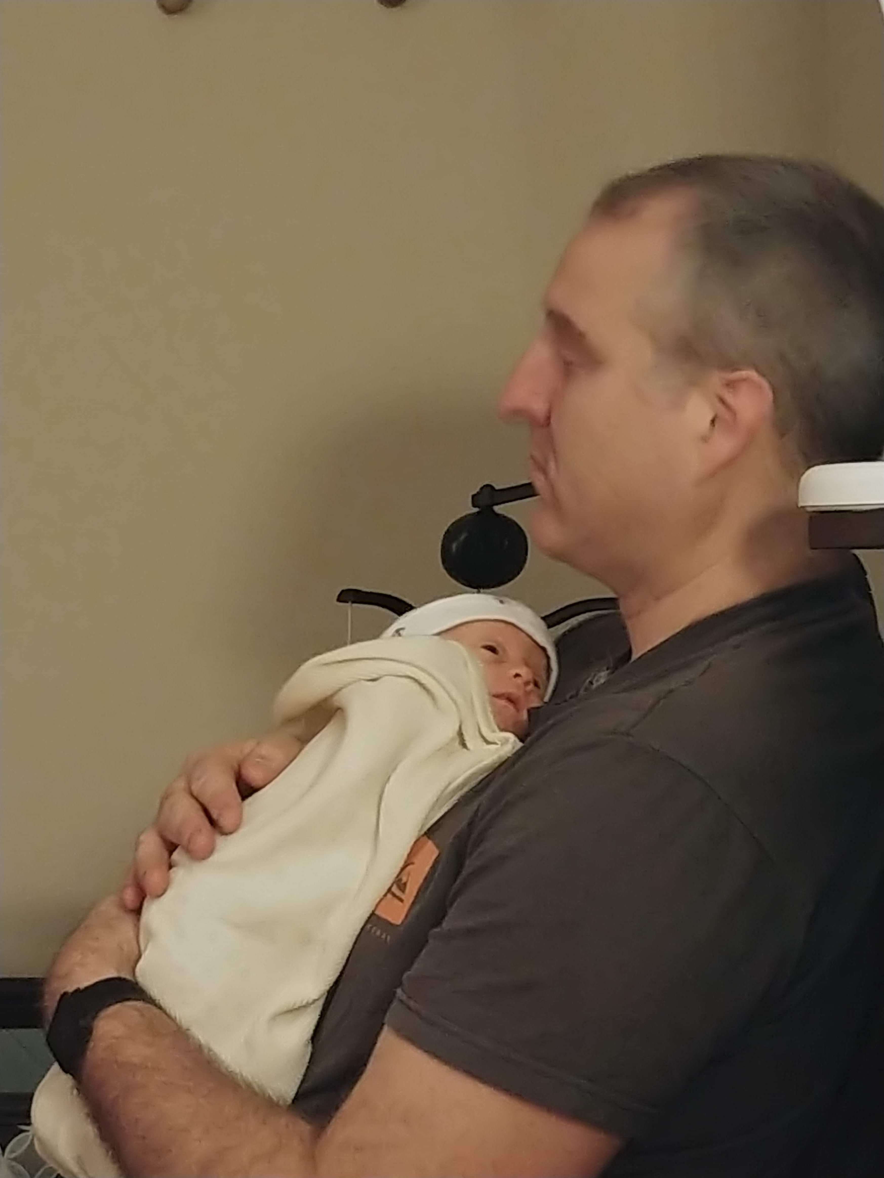 The babies are growing well and have outgrown a few sleepers already. They are now just over 7lbs, with Cadence in the lead at 7lbs 5oz. She remains more stretched out and sturdy, while Asher is always curled up and often snuggles up close to Cadence. There have been a few smiles and they are starting to spend more time awake. We are still camped in the livingroom with no expected end in sight, but it often feels more like a barn with the little lamb and goat noises coming from the crib…