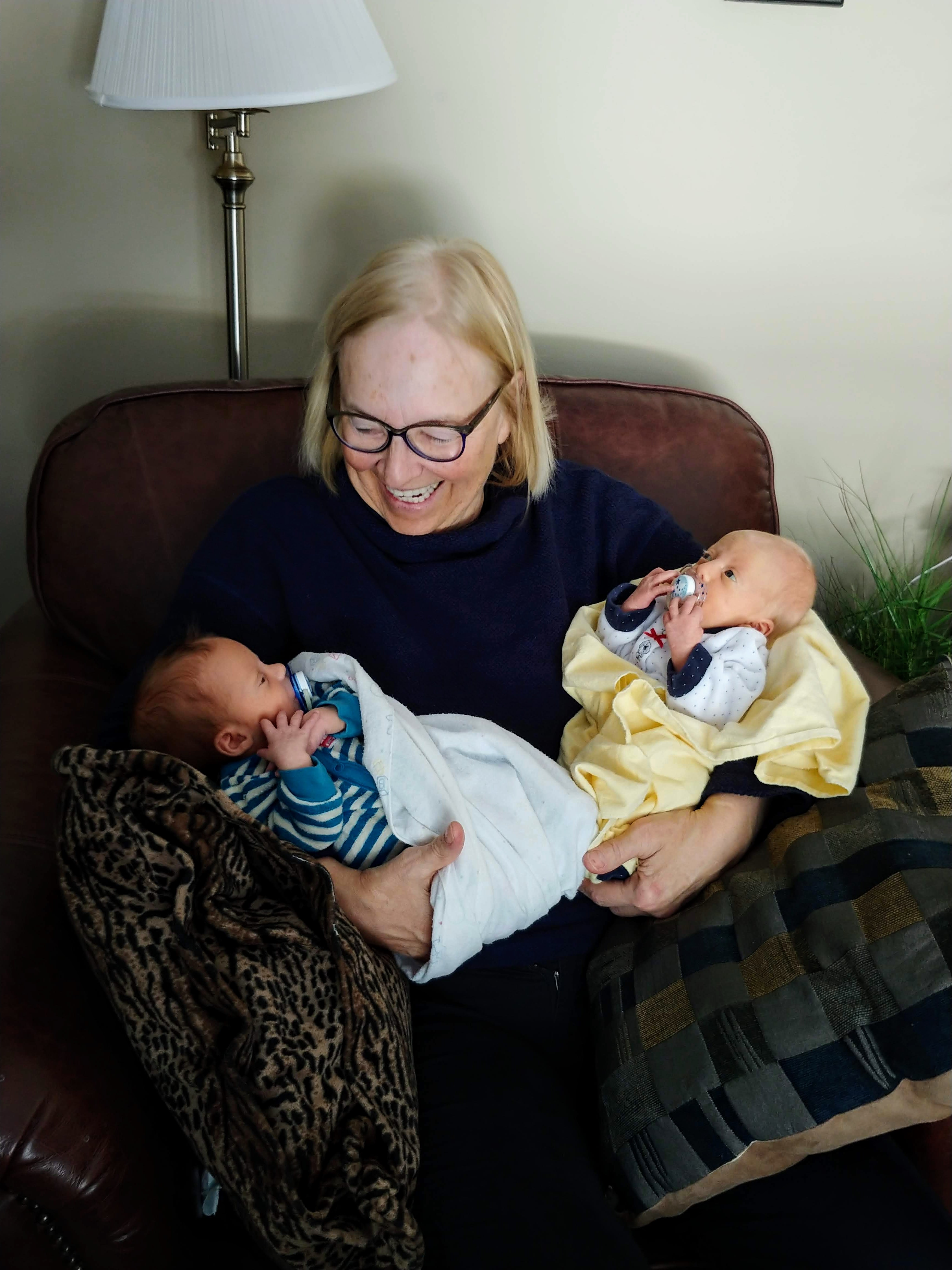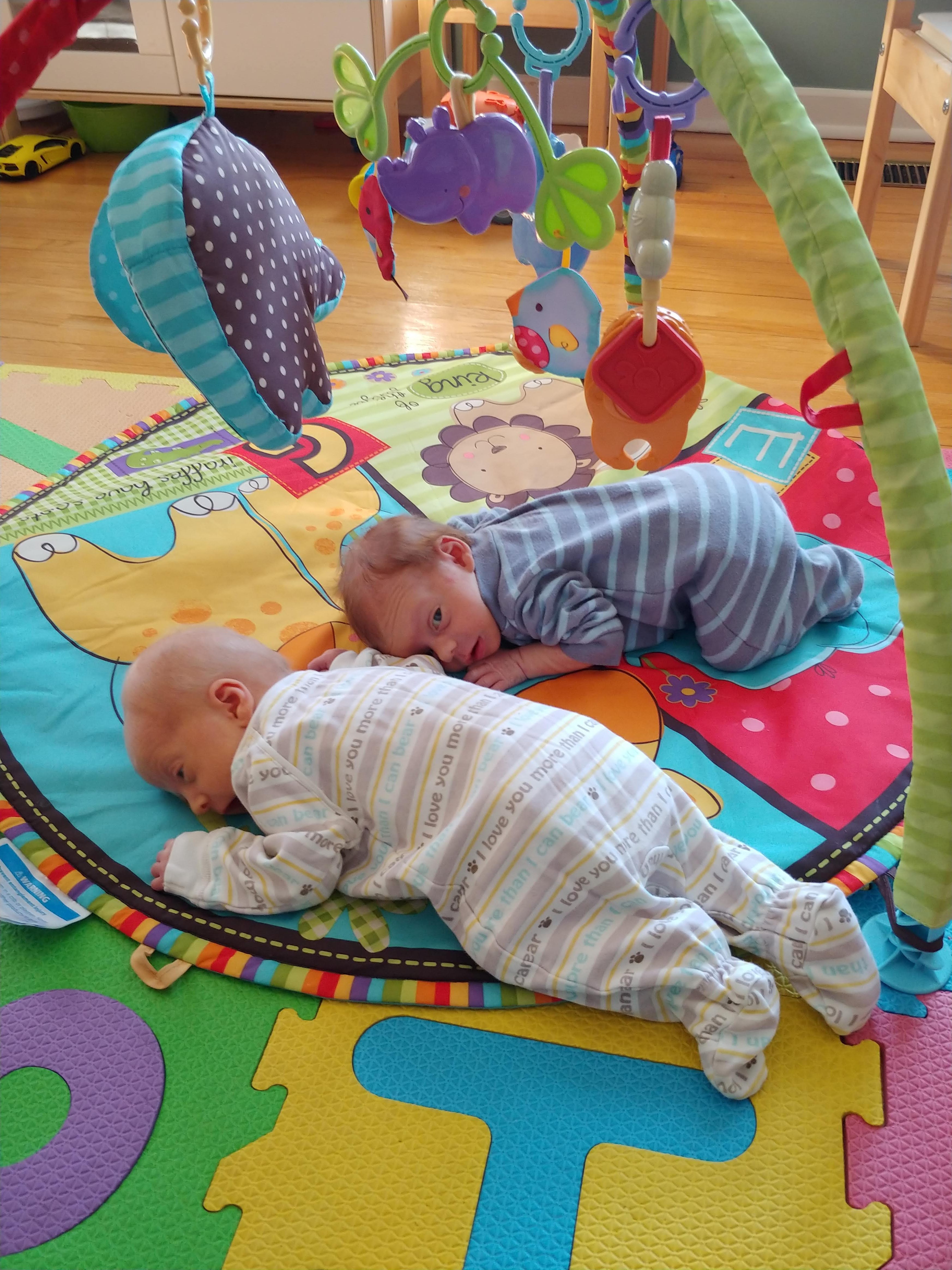 Lindy continues to struggle with nursing and low milk supply, getting lots of different advice from various sources. The feeding routine still takes up most of her time, leaving very little time to do anything else. So Lindy goes out to various breastfeeding clinics and support groups to “hang out with boobs out” with other new moms, and some other twin moms too. Otherwise, there have been a few mall walks with Noelia and her baby Olivia, a couple sushi excursions, and various visits and playdates at the house.