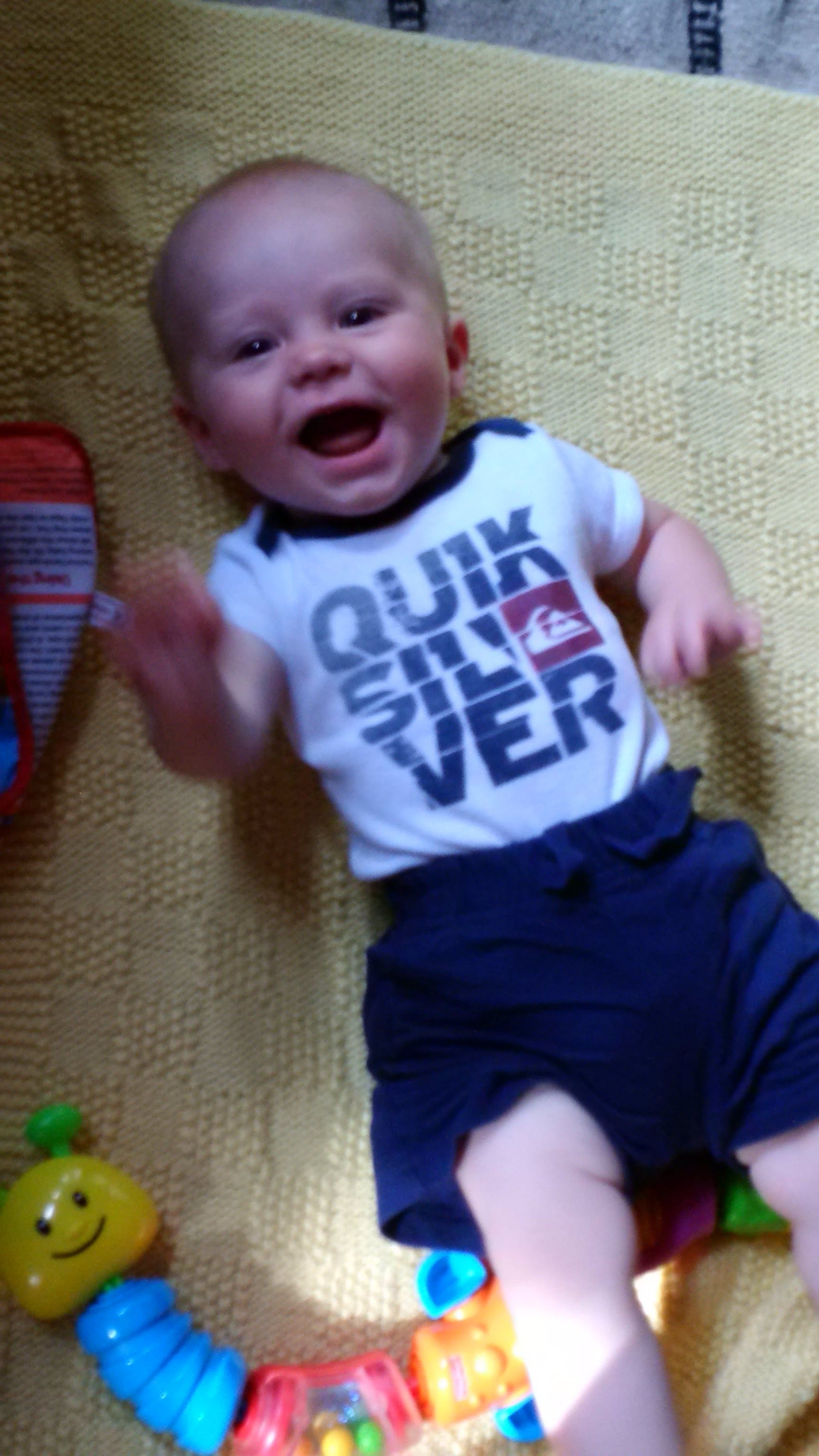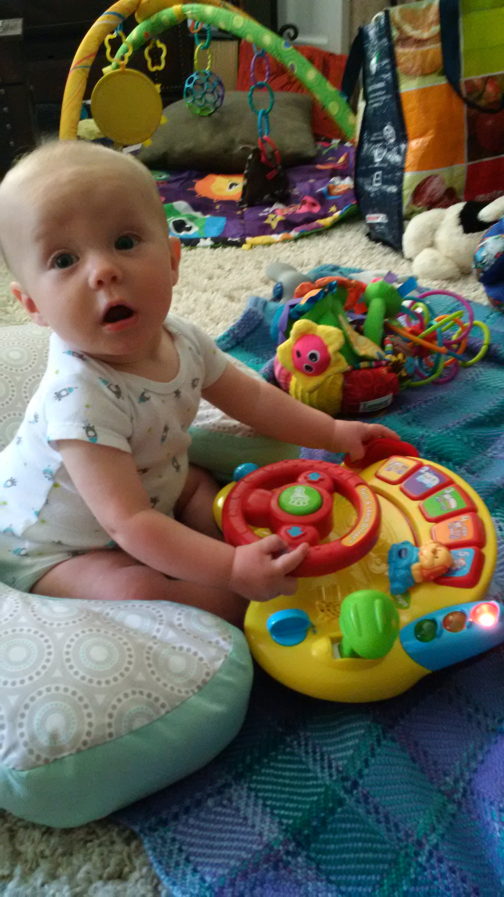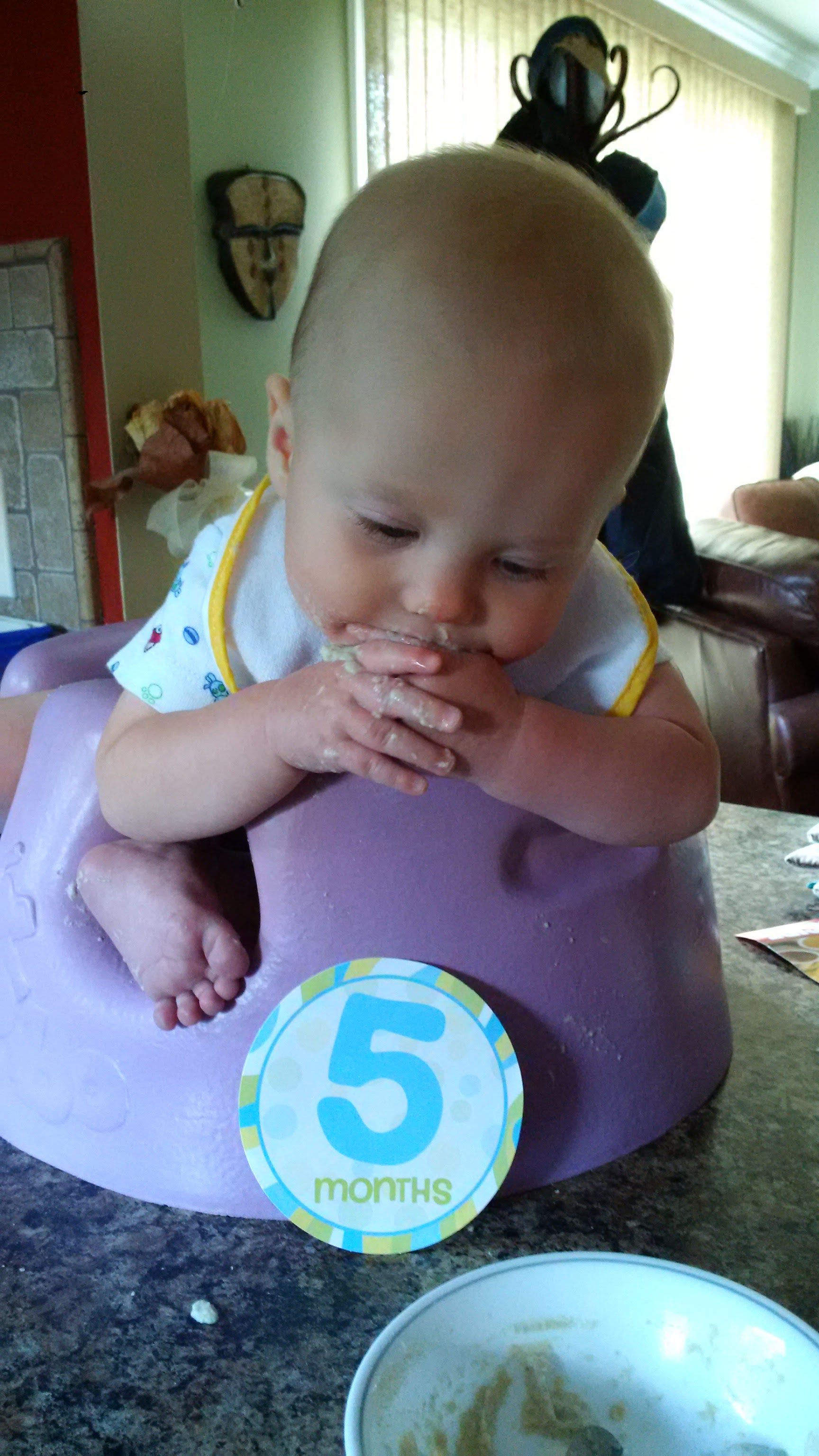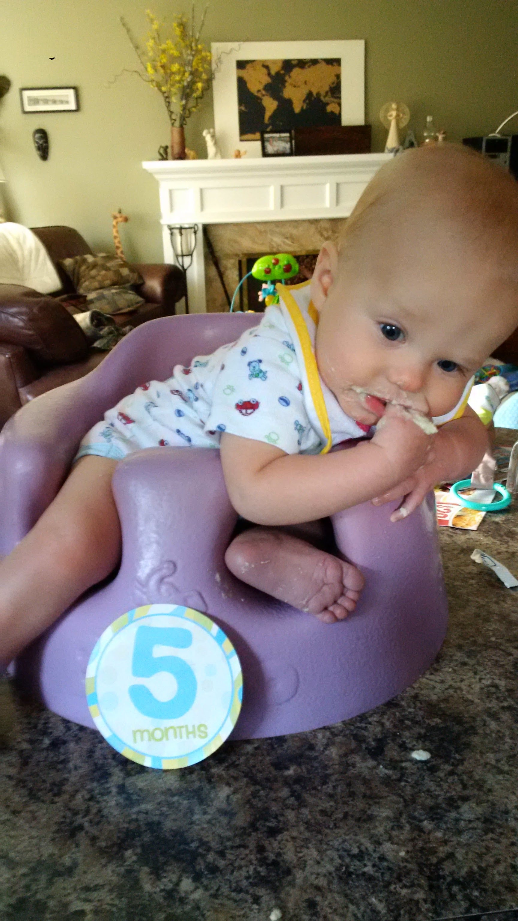 Mr. Squirmy-Wormy is now 5 months old…and getting wigglier and wigglier. While his good core strength makes him more portable, his curiosity and grip strength make him more difficult to handle – he’s constantly shifting around in our arms to see what’s making noise, and grabs at everything and pulls…Lindy’s hair out! He’s not quite crawling but now that he’s able to move around so easily in his crib, he’s become increasingly difficult to put down for naps which he flat out refuses most days. We’re only a few days into the fifth month, but so far it is the most difficult. Dealing with our own lack of sleep is one thing – but an overtired cranky baby on top of our own lack of sleep is entirely another story!! Lindy is looking forward to her first night away next weekend…