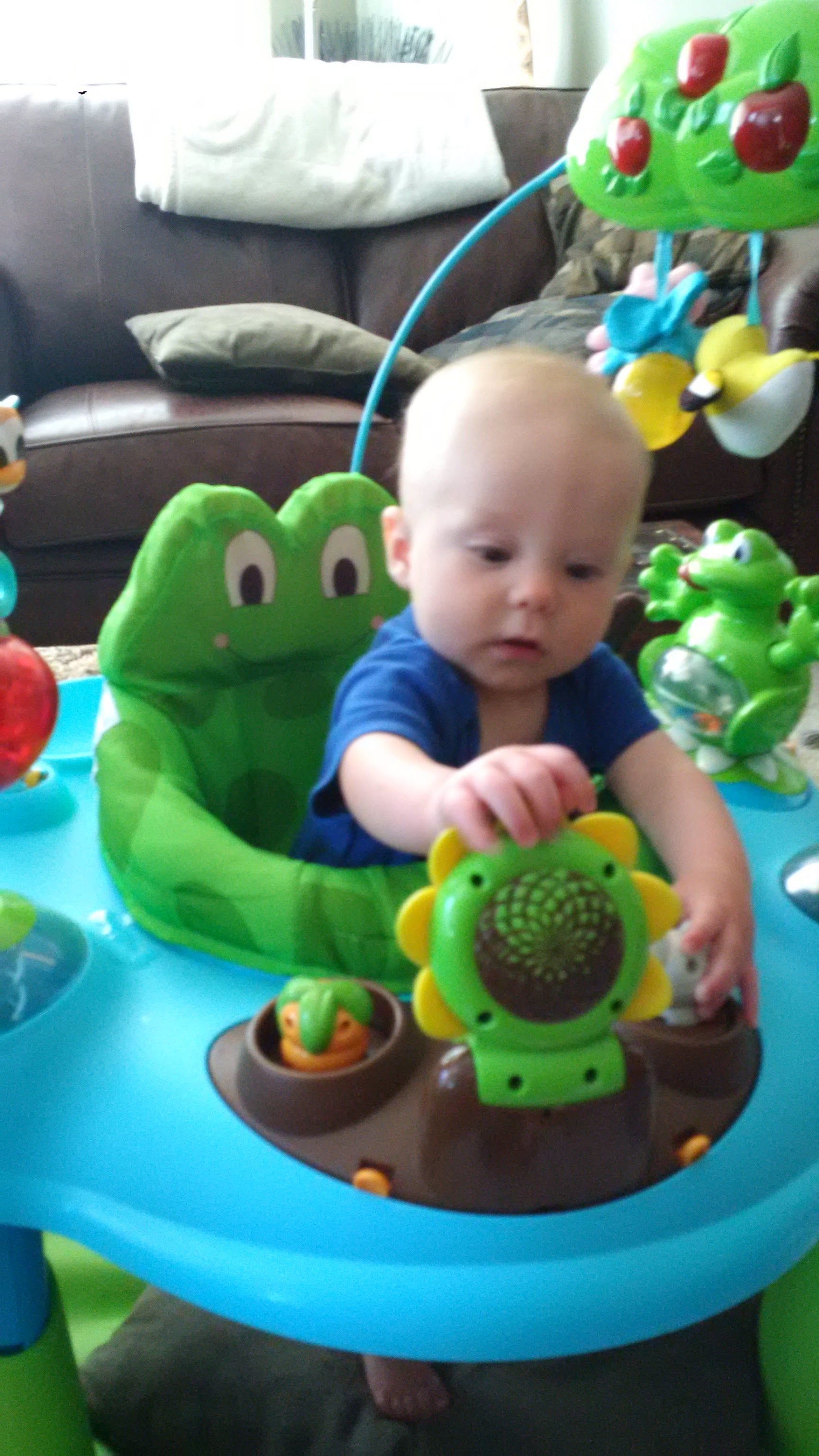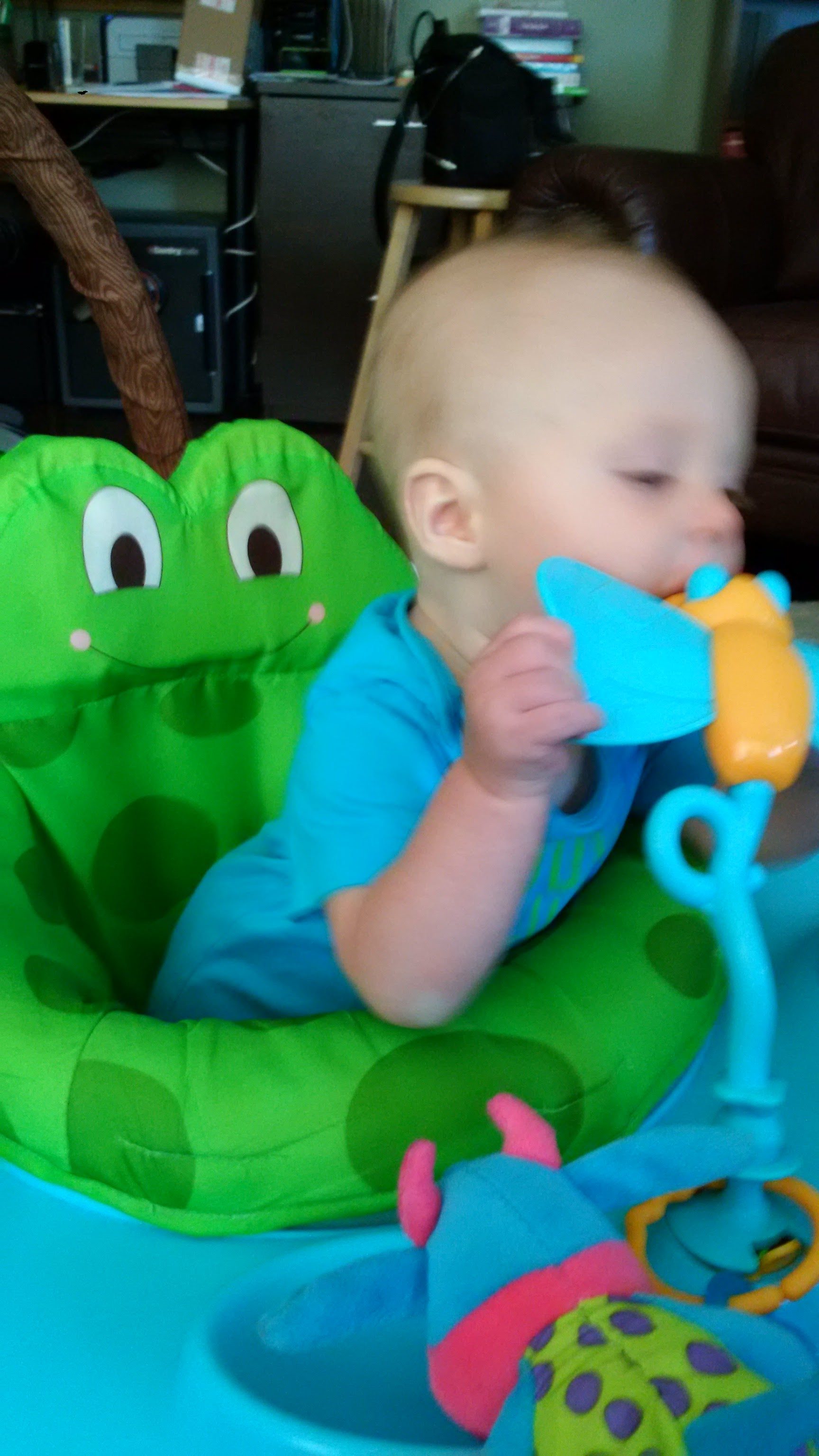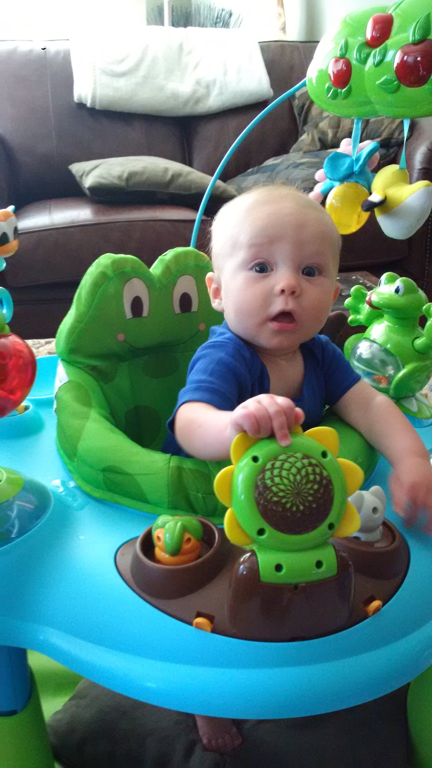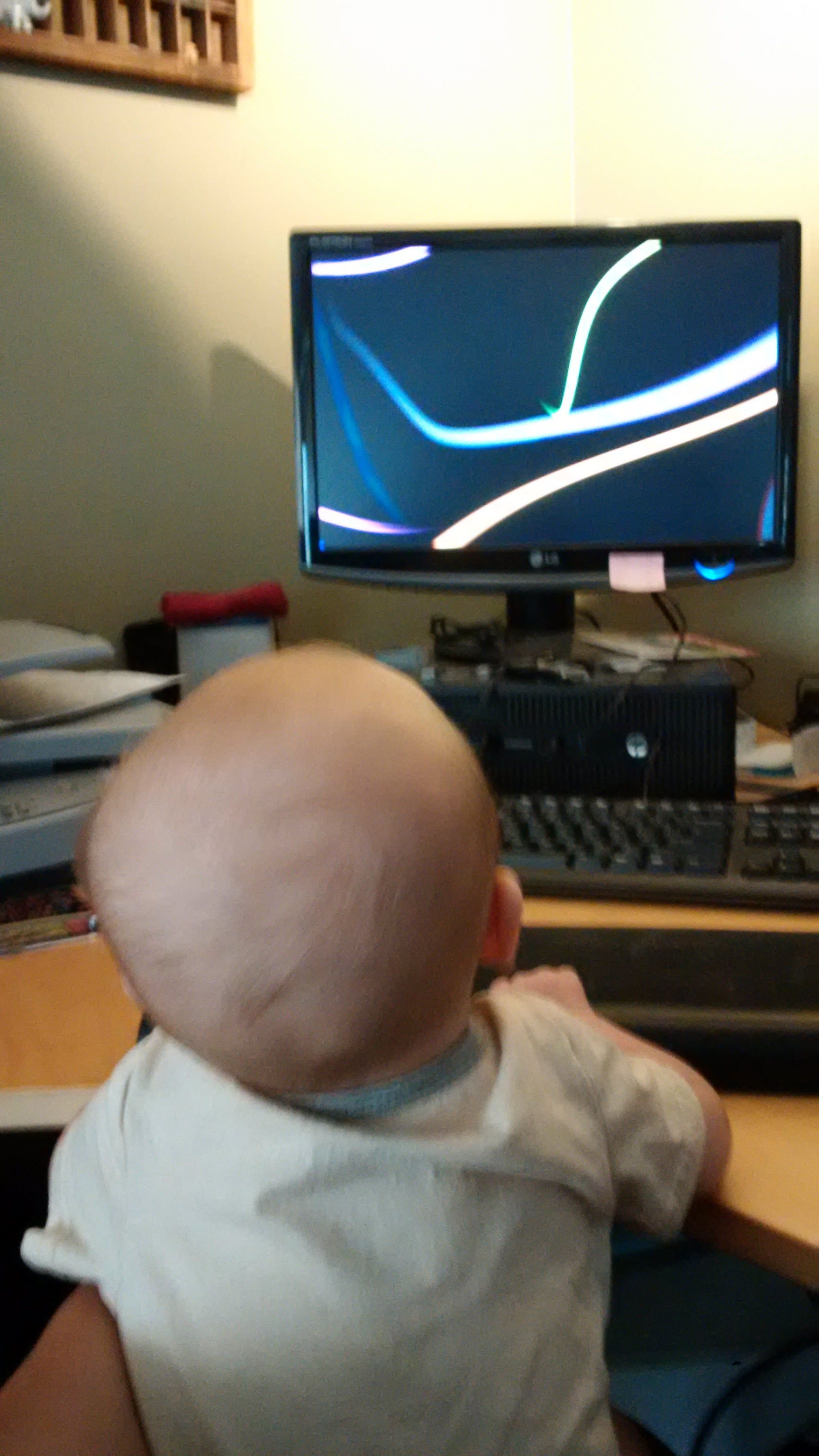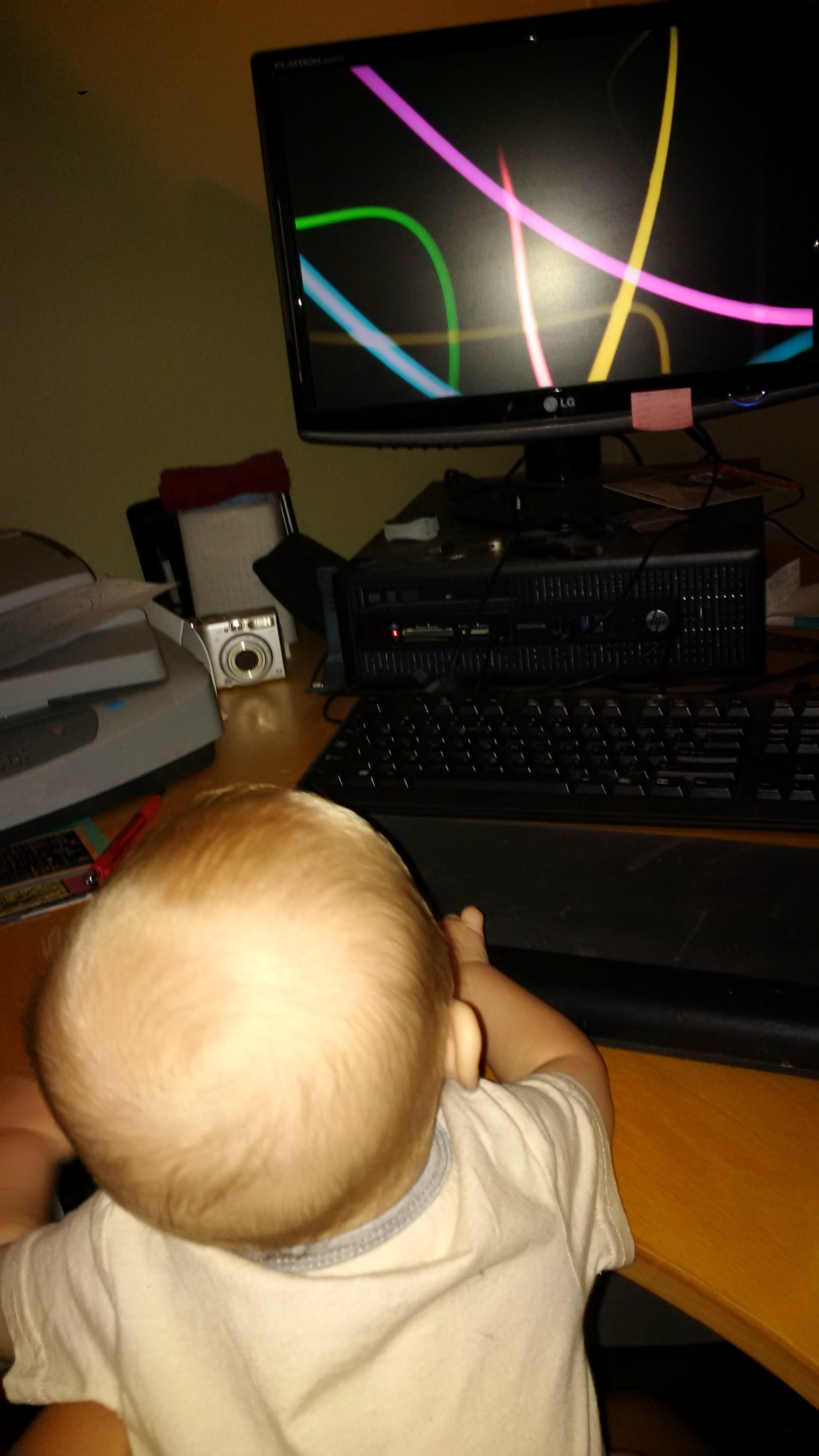 He’s definitely following in his daddy’s footsteps with a strong curiosity in technology. He loves Lindy’s phone (always out taking pictures of him), and especially likes to watch the colourful lines of the living room computer screen saver and will sit mesmerized by it for quite a while.