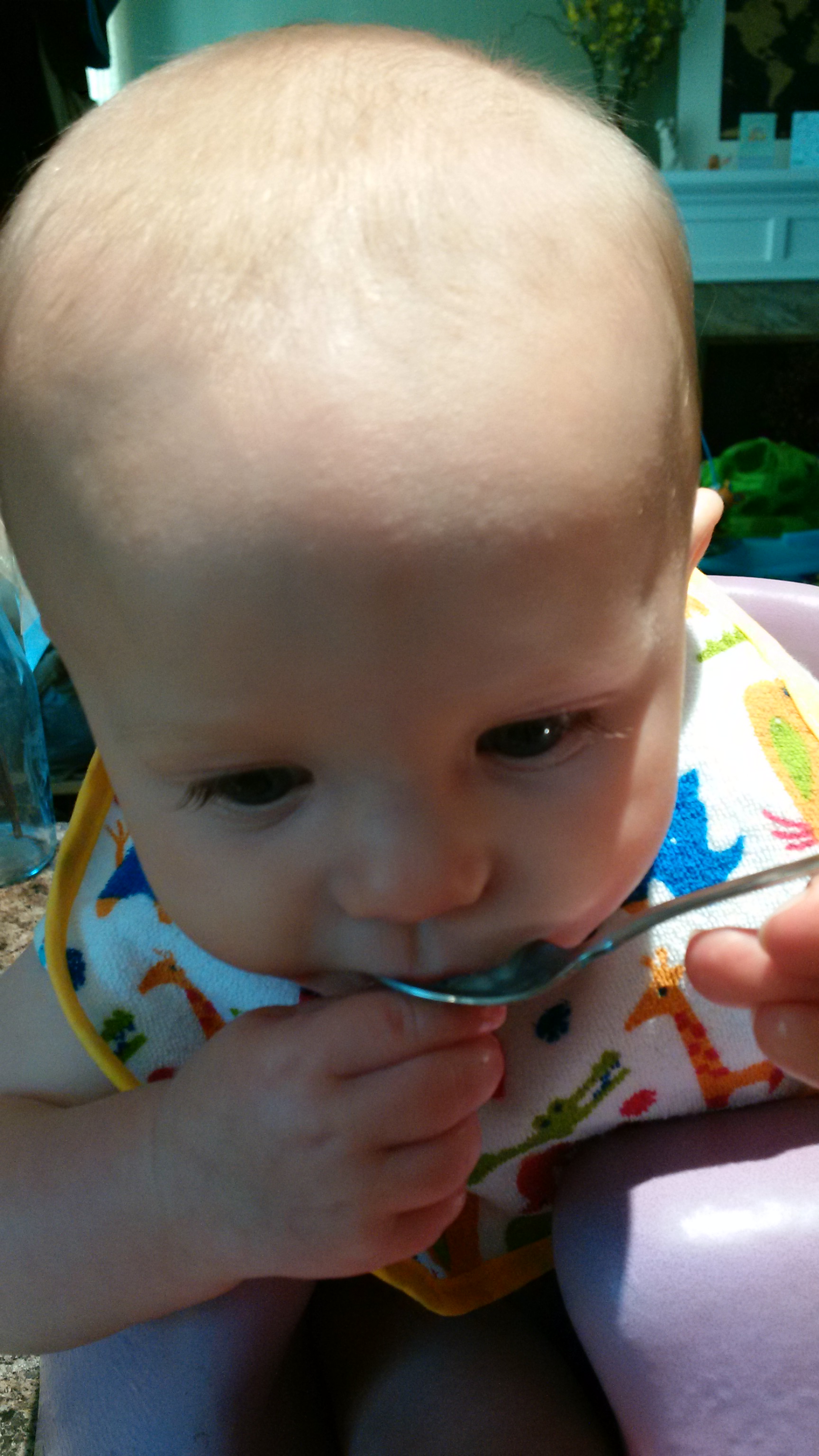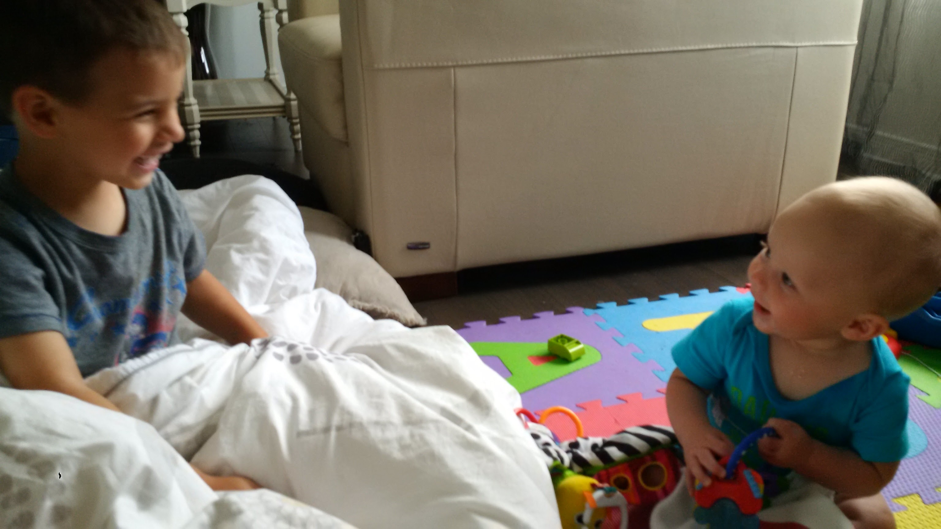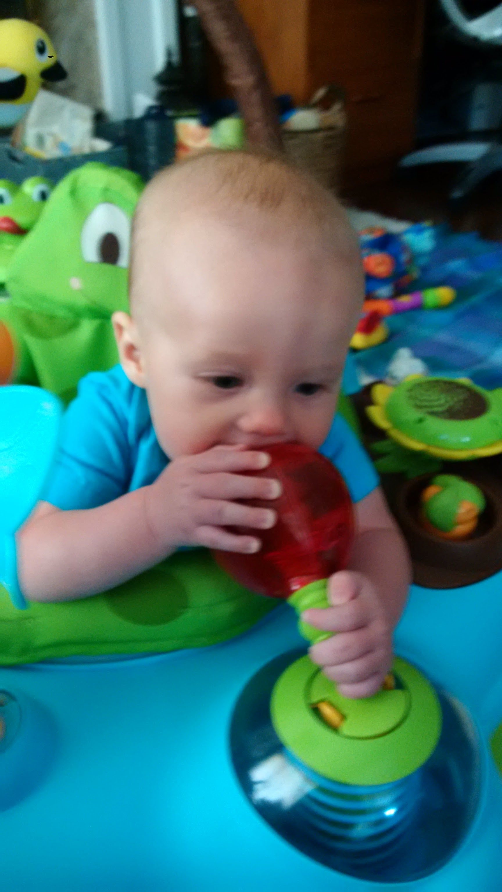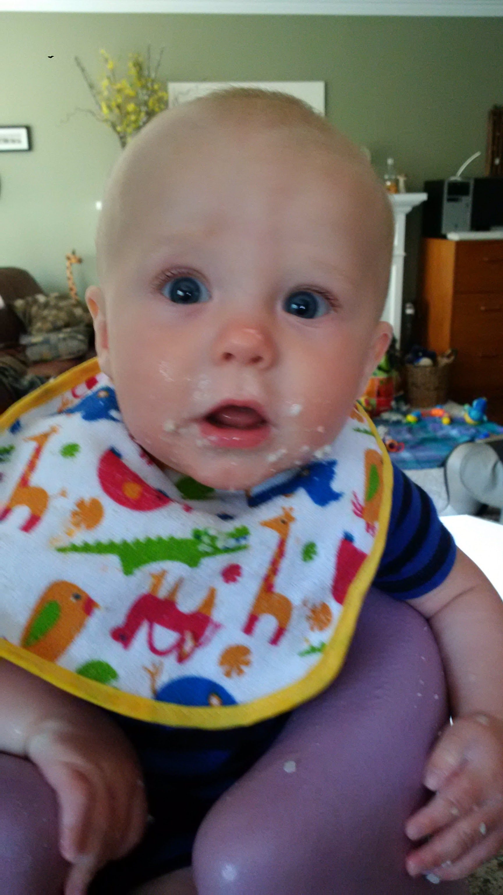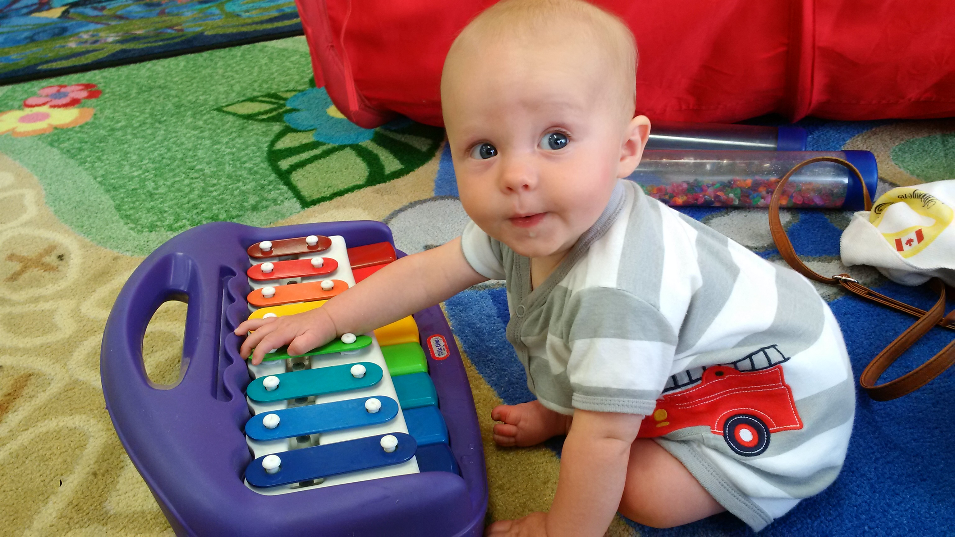 He’s definitely following in his daddy’s footsteps with a strong curiosity in technology. He loves Lindy’s phone (always out taking pictures of him), and especially likes to watch the colourful lines of the living room computer screen saver and will sit mesmerized by it for quite a while.