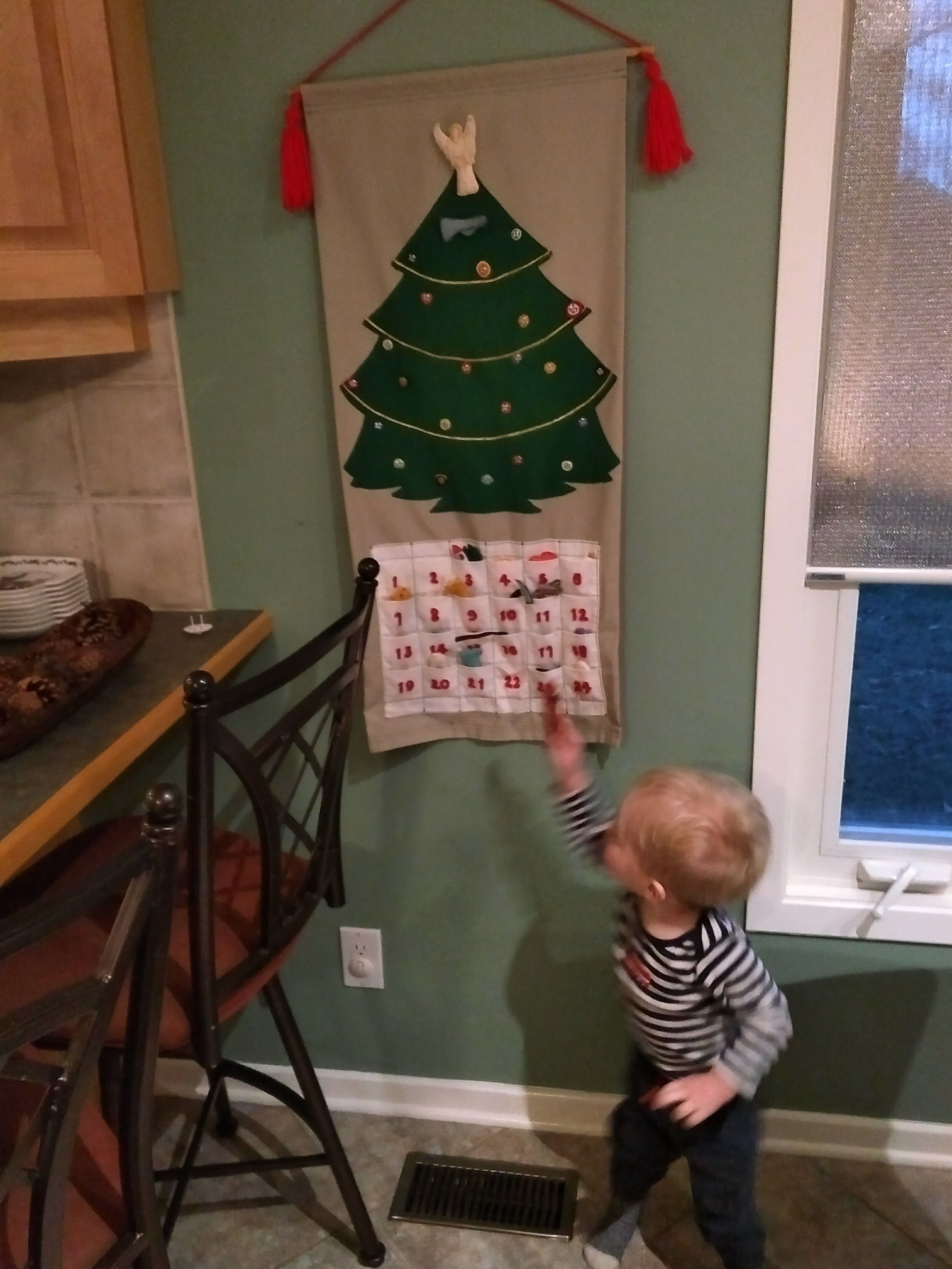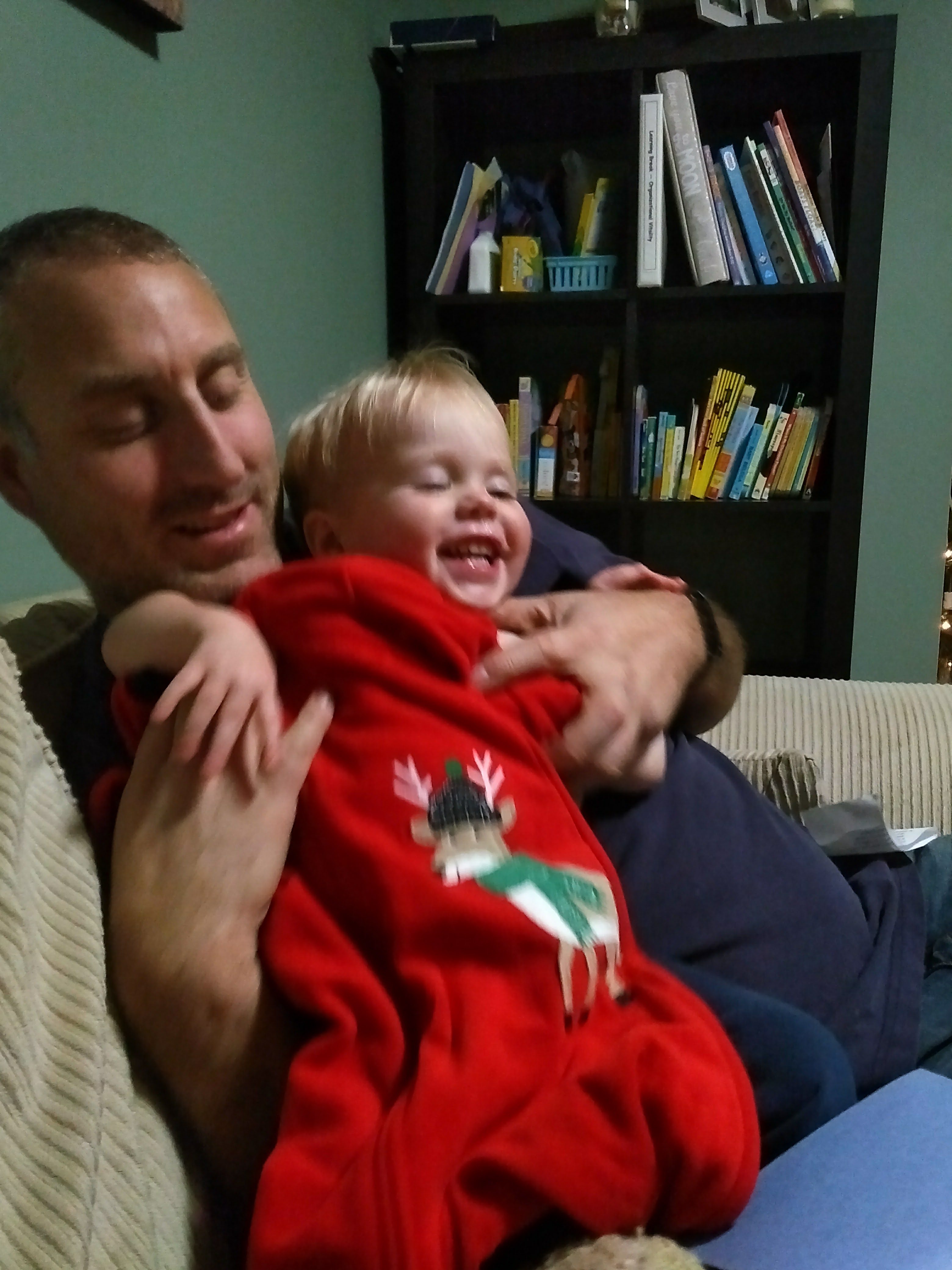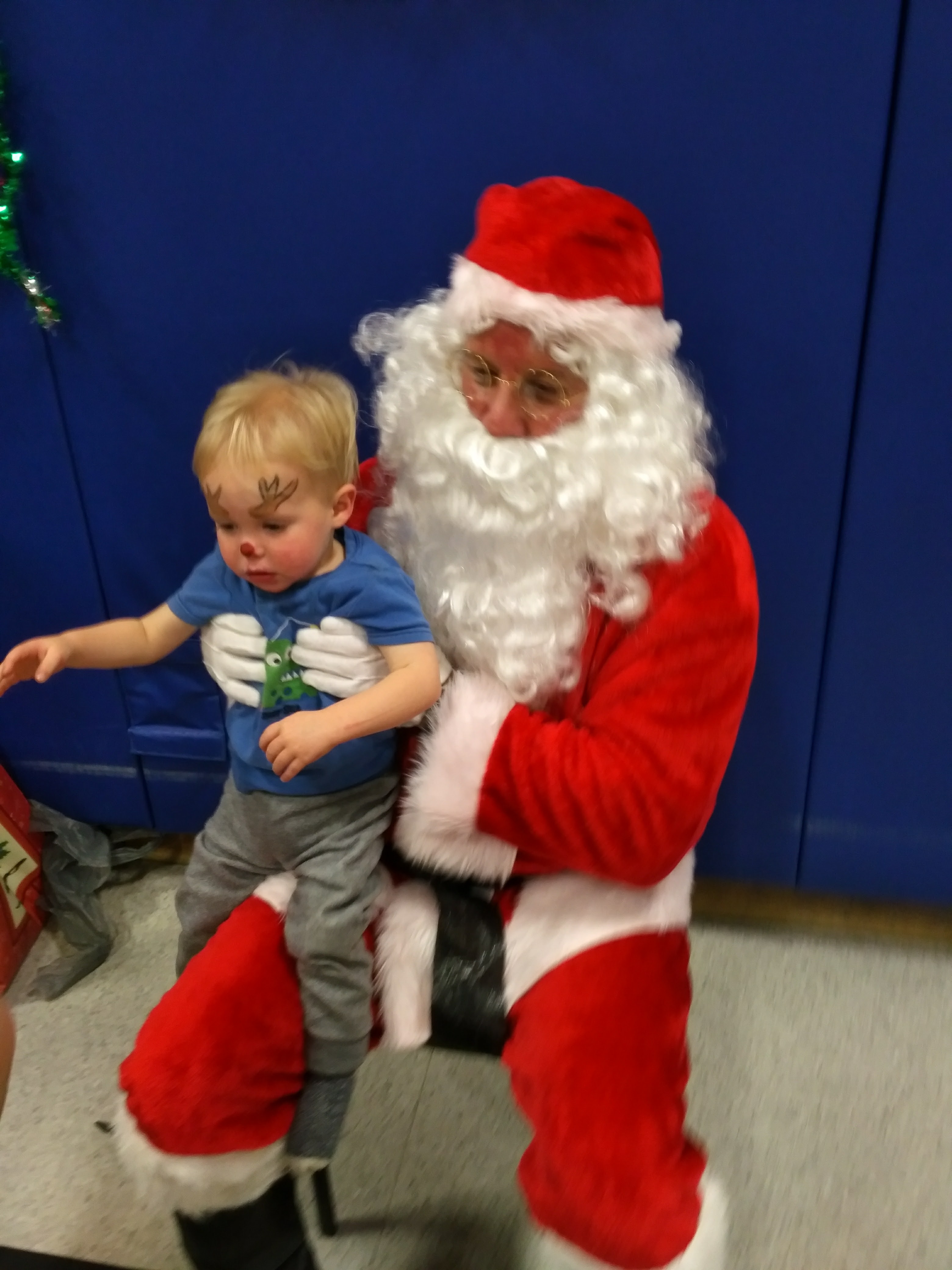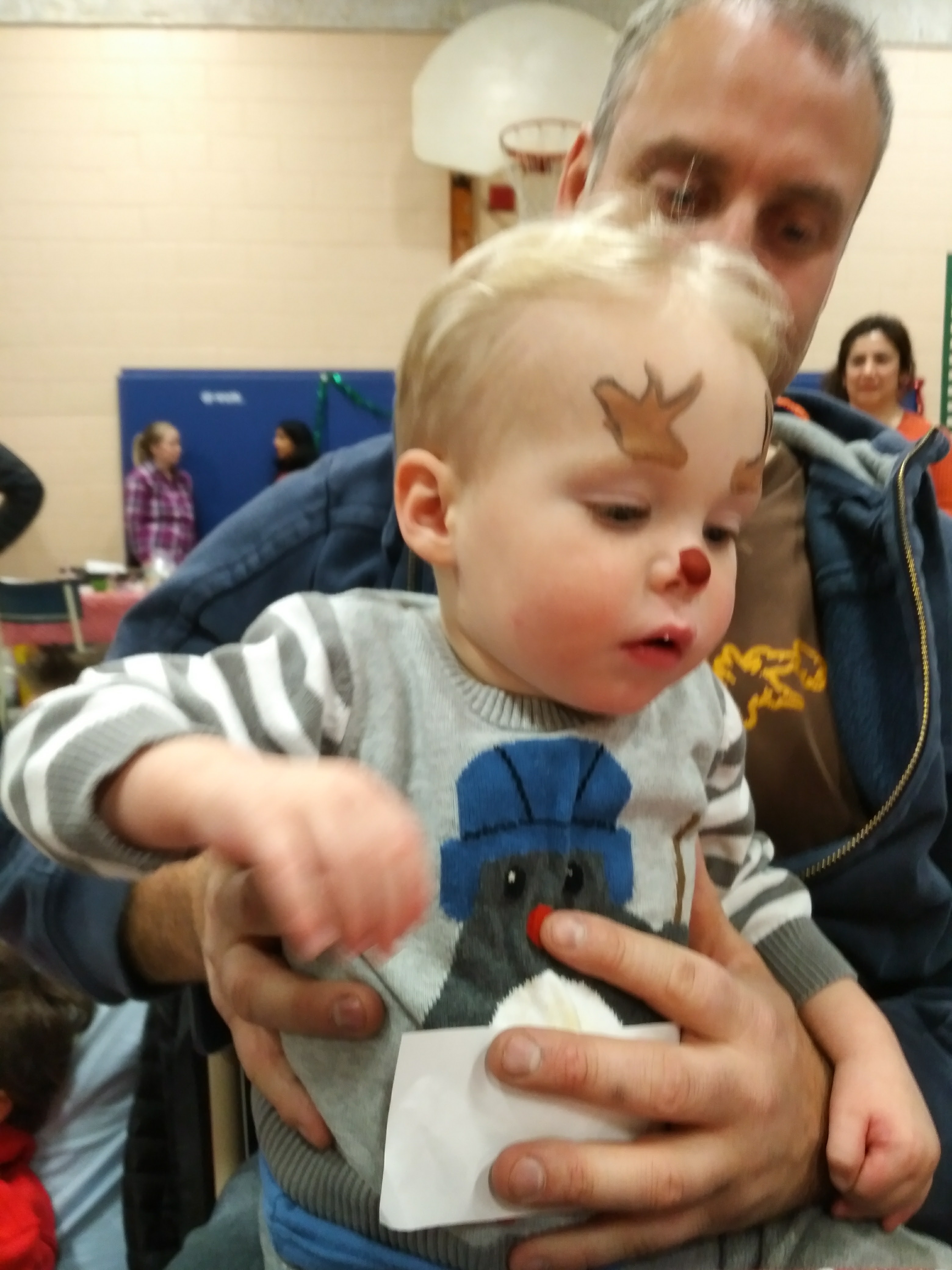 We all got into the holiday spirit early this year – the tree is up and decorated, the Christmas lights are hung, most of the presents are wrapped already… a day off on Black Friday kicked it all off and Isaac kept it going! “Pretty lights!” Isaac loves the decorations, and wanted to read books by the tree lights the first night it was up. Isaac was excited to see Santa at the neighbourhood children’s holiday party, and seemed to know who he was. He didn’t like sitting on Santa’s knee, but he still talks about it. He did surprise us by sitting silently watching the magic show, and also by patiently stringing beads on a pipecleaner.