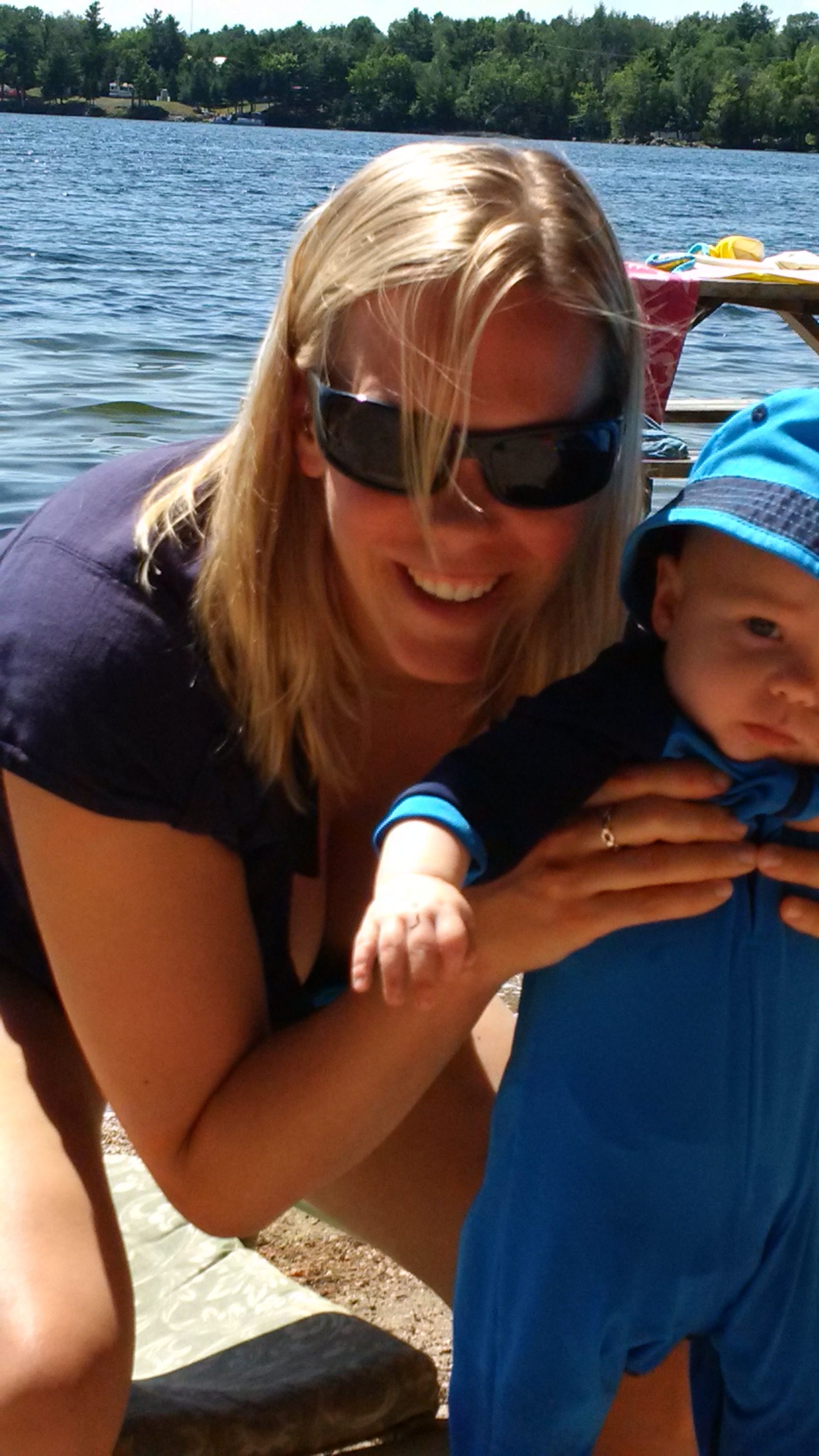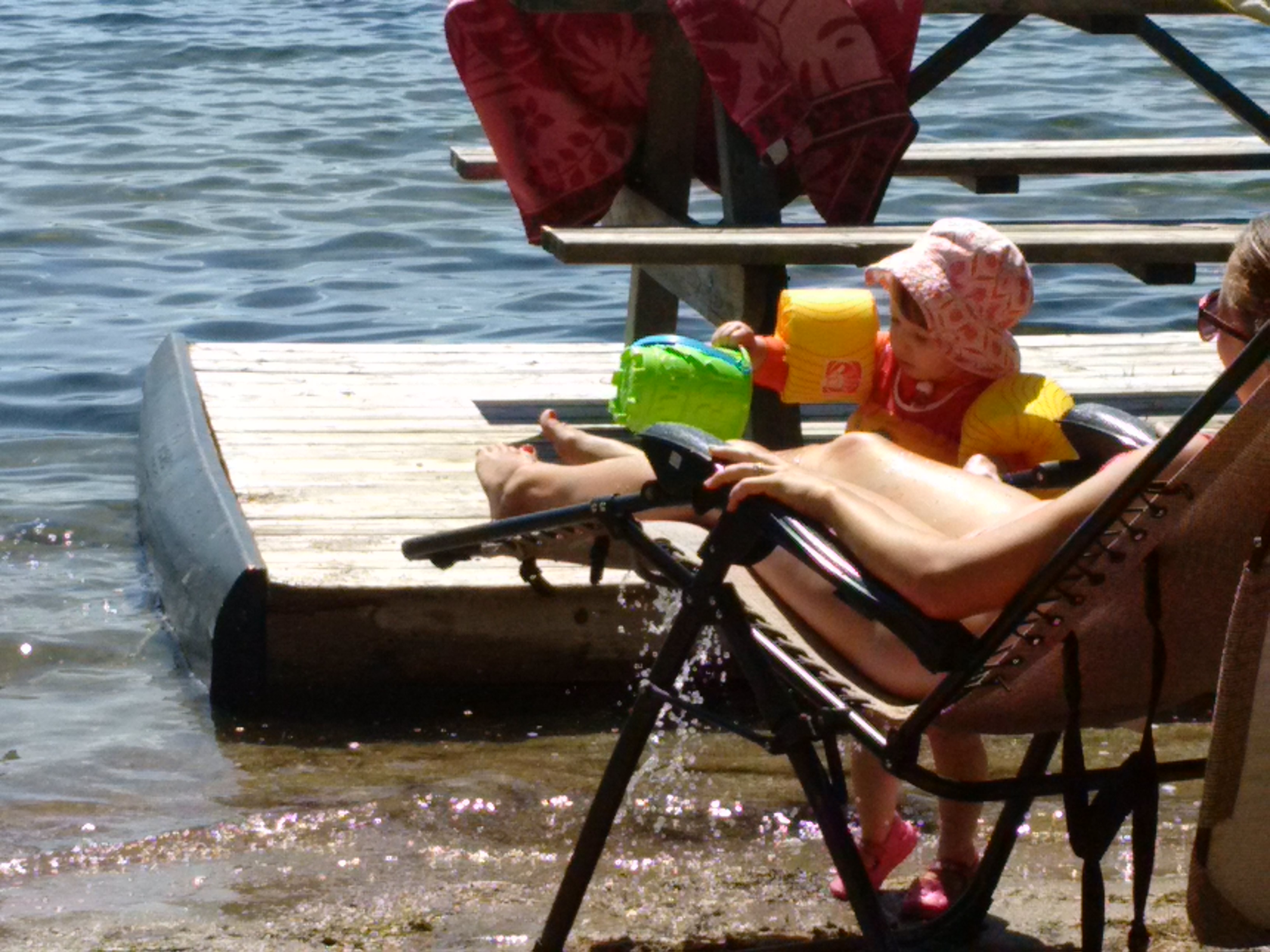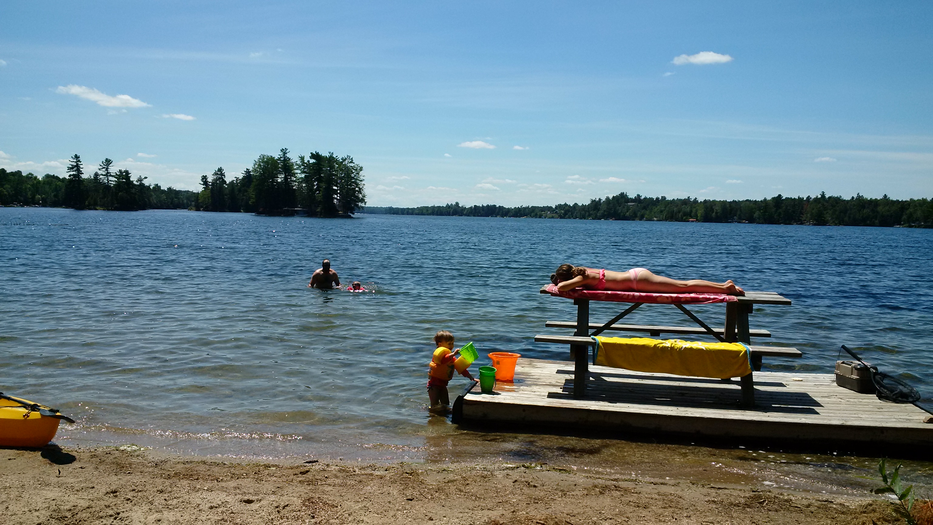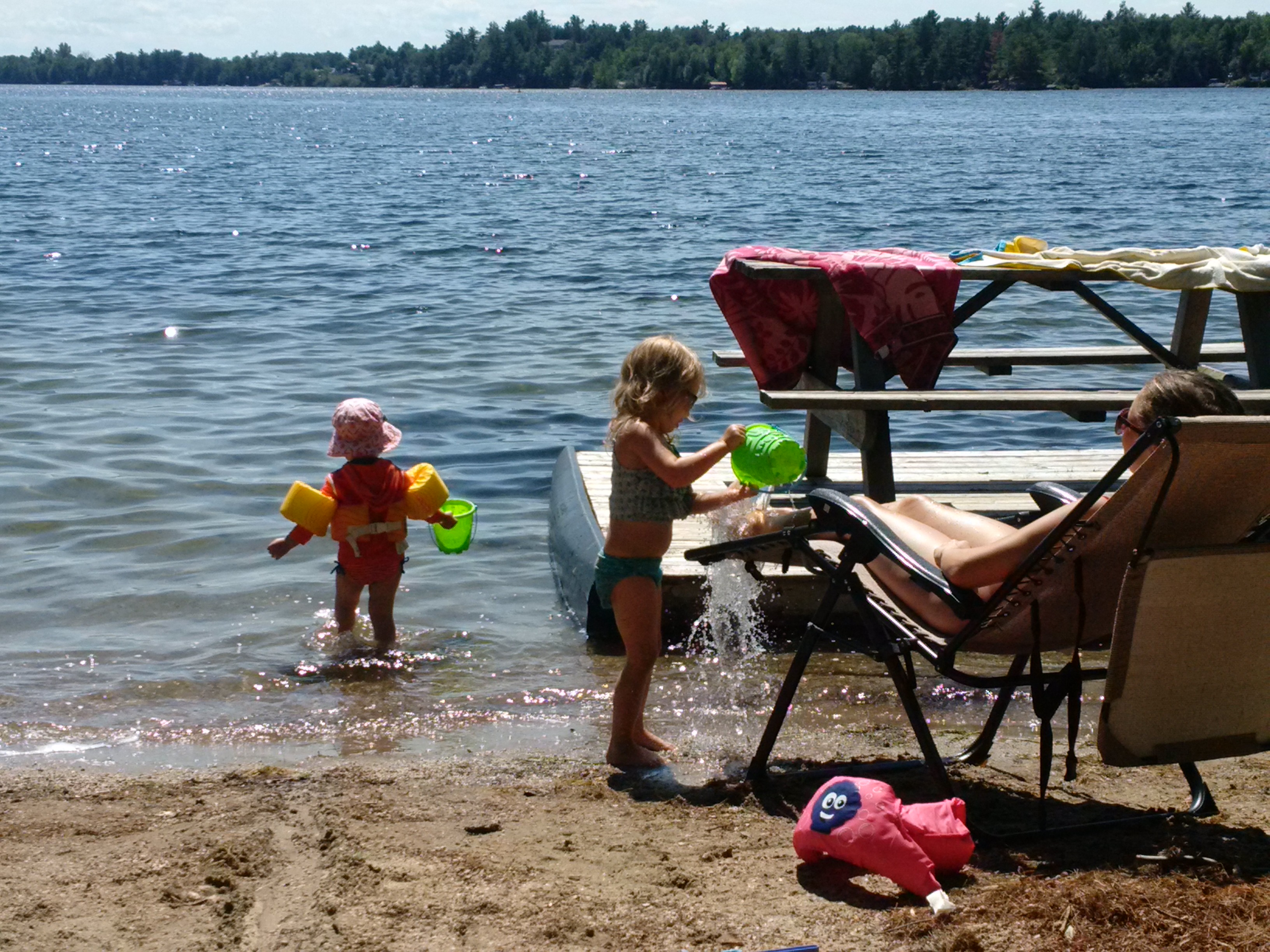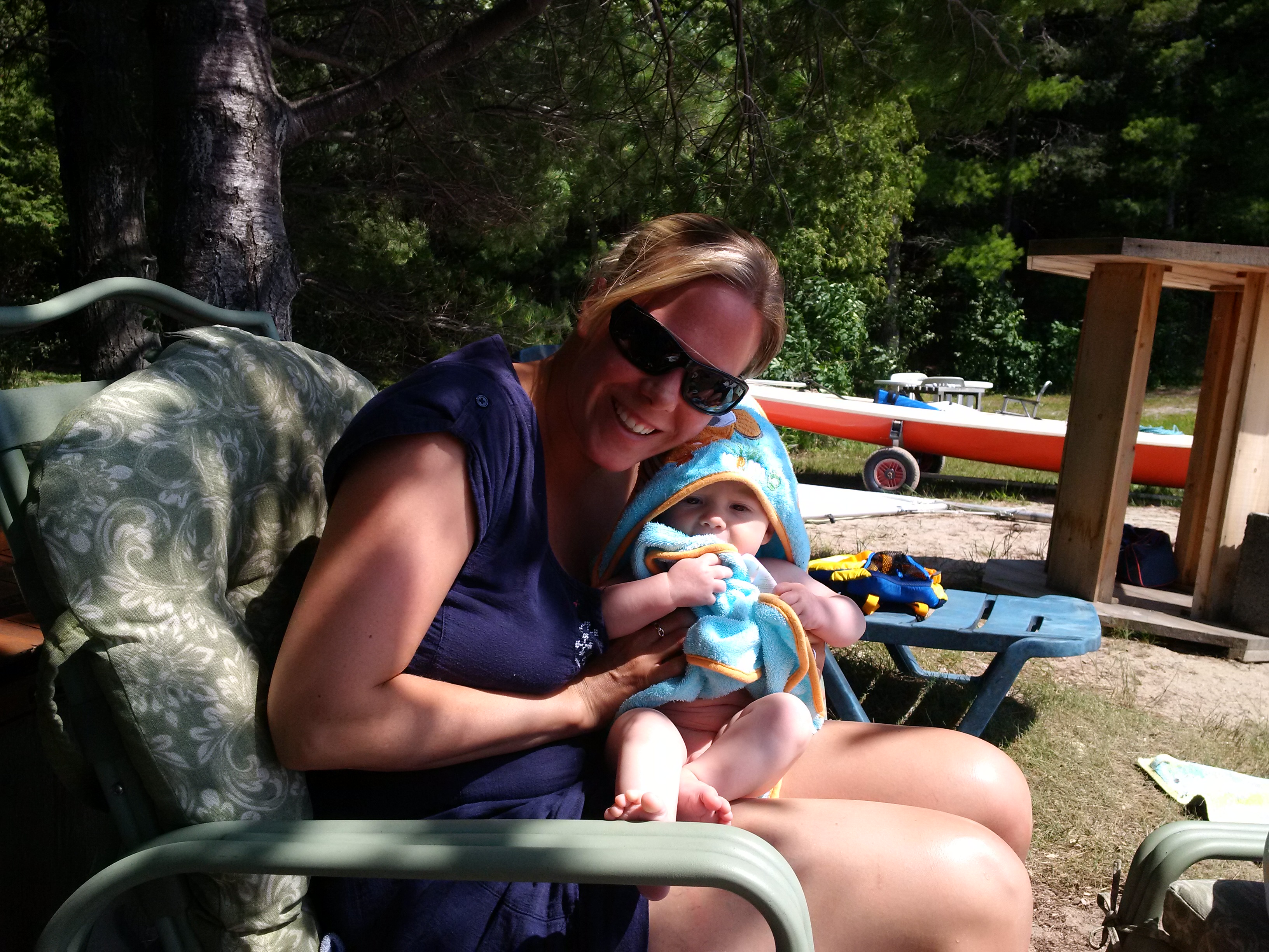 We had our first family holiday for a week at the cottage in July. It was great weather and lots of fun! Shelley, Matt and the girls came for the weekend, and Jon’s parents visited for a day during the week. Naps were made easy with having Opa’s trailer by the beach and there was actually some relaxing had by us parents! Lindy was able to get in for a swim almost every day, and go sailing a few times. Jon had a couple projects on the go – repainting the picnic table and Adirondack chairs, and building a baby gate for our house. Isaac had lots of play time on the beach, and liked swinging in the hammock chair.