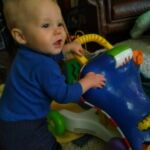 Isaac now has 4 little teeth, with the latest two just barely poking through. He weighs 15lbs 11oz which is still small but growing…no wonder considering how much food he gobbles up these days. He’s started feeding himself more and loves his cheerios! He’s motoring around on all fours, but can also cruise along the furniture and is practicing standing on his own. The newest thing is to hang onto the back of Lindy’s pant legs and walk along behind her – although very slowly for now…