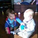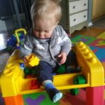 New tasks – Isaac will wipe up his spills when asked, he’s started trying to get undressed for bath (and tries to climb into the tub), gets his shoes and hat to go outside and tries to put them on, wipes his own nose (still unsuccessfully but tries), sits on the potty (fully clothed still) and throws his toilet paper in the toilet, flushes the toilet, picks up food he has dropped when asked, puts toys away, points to body parts when asked, points to the duck on the page of animals, brushes his own teeth and hair