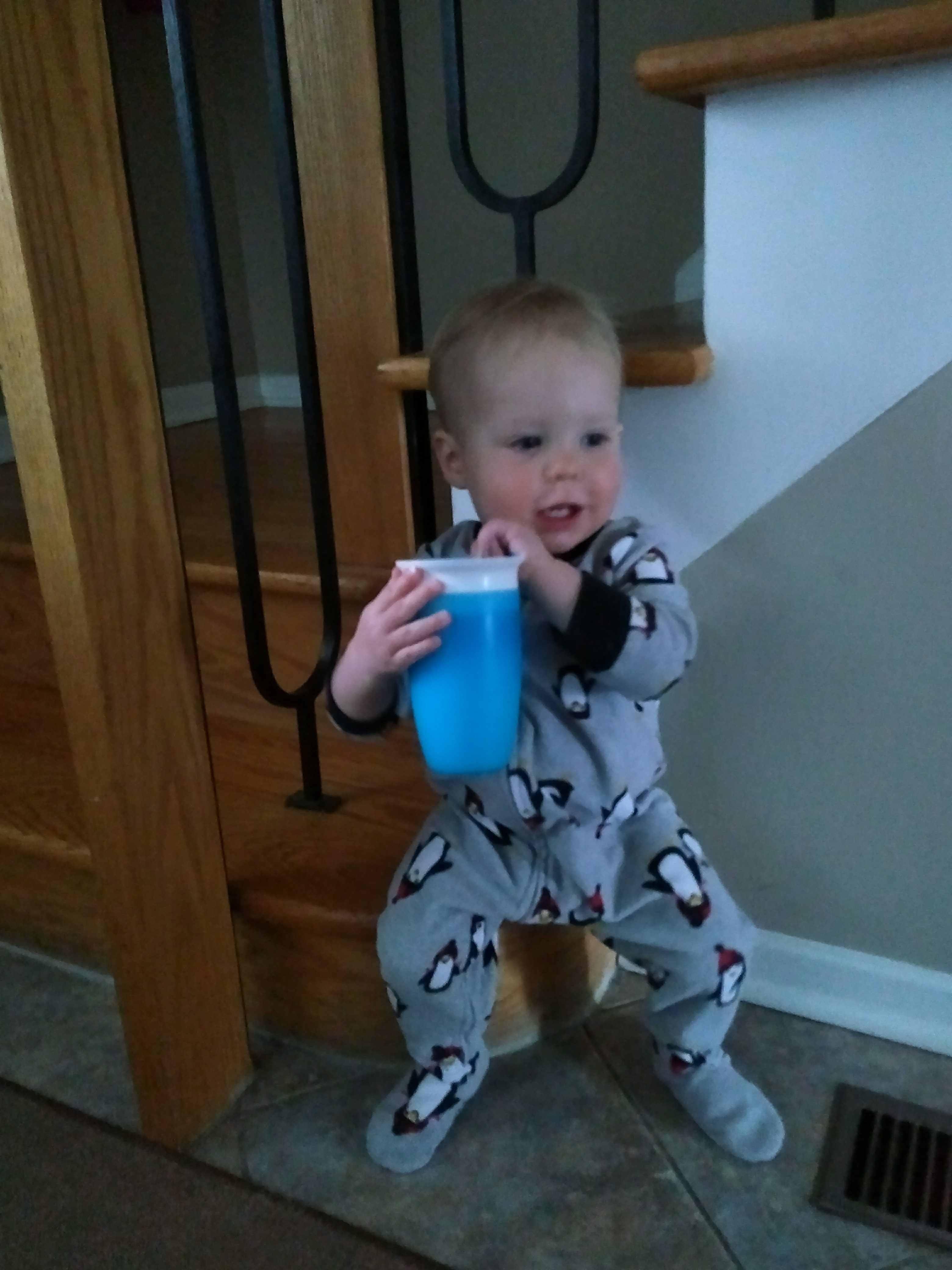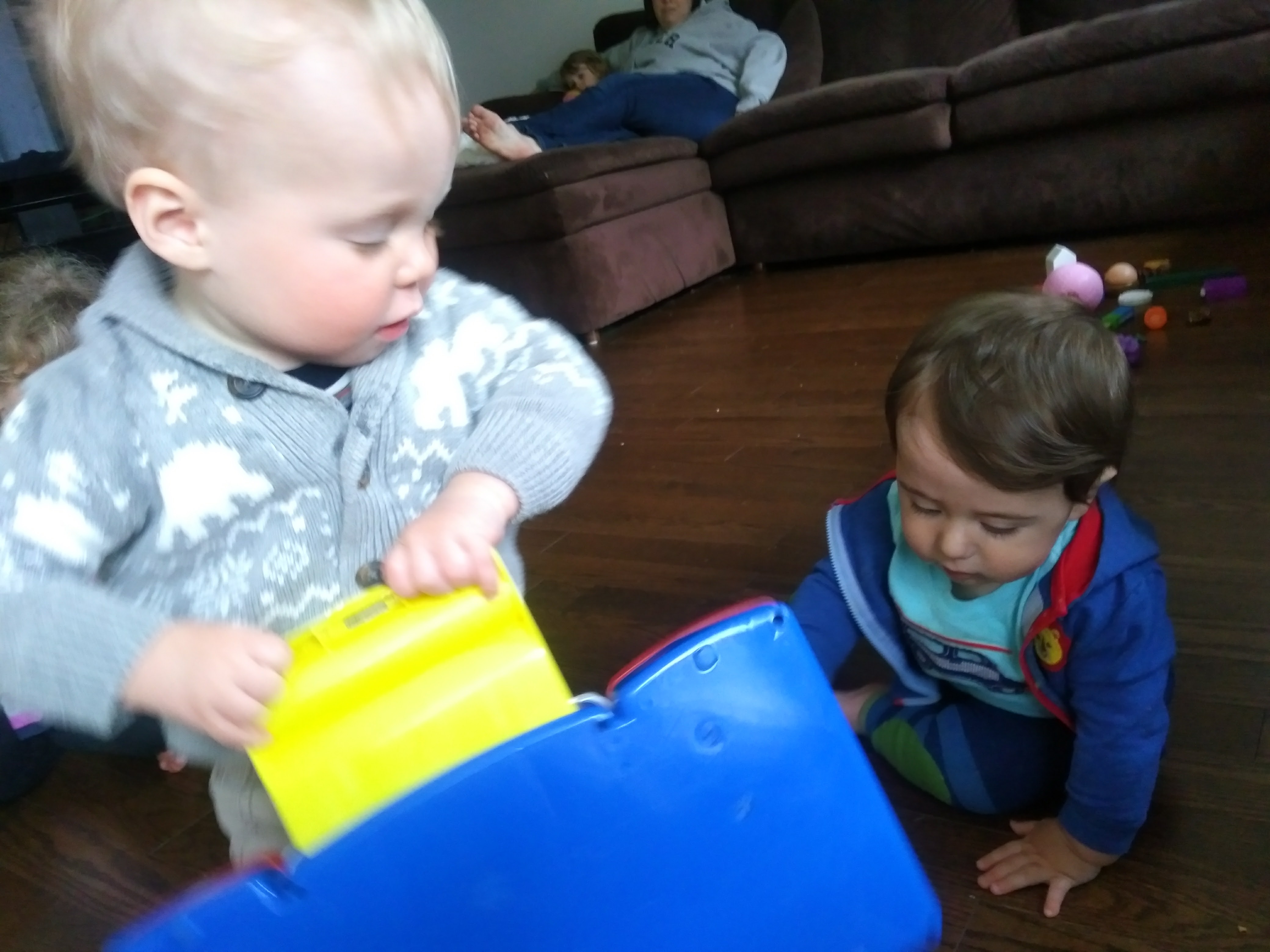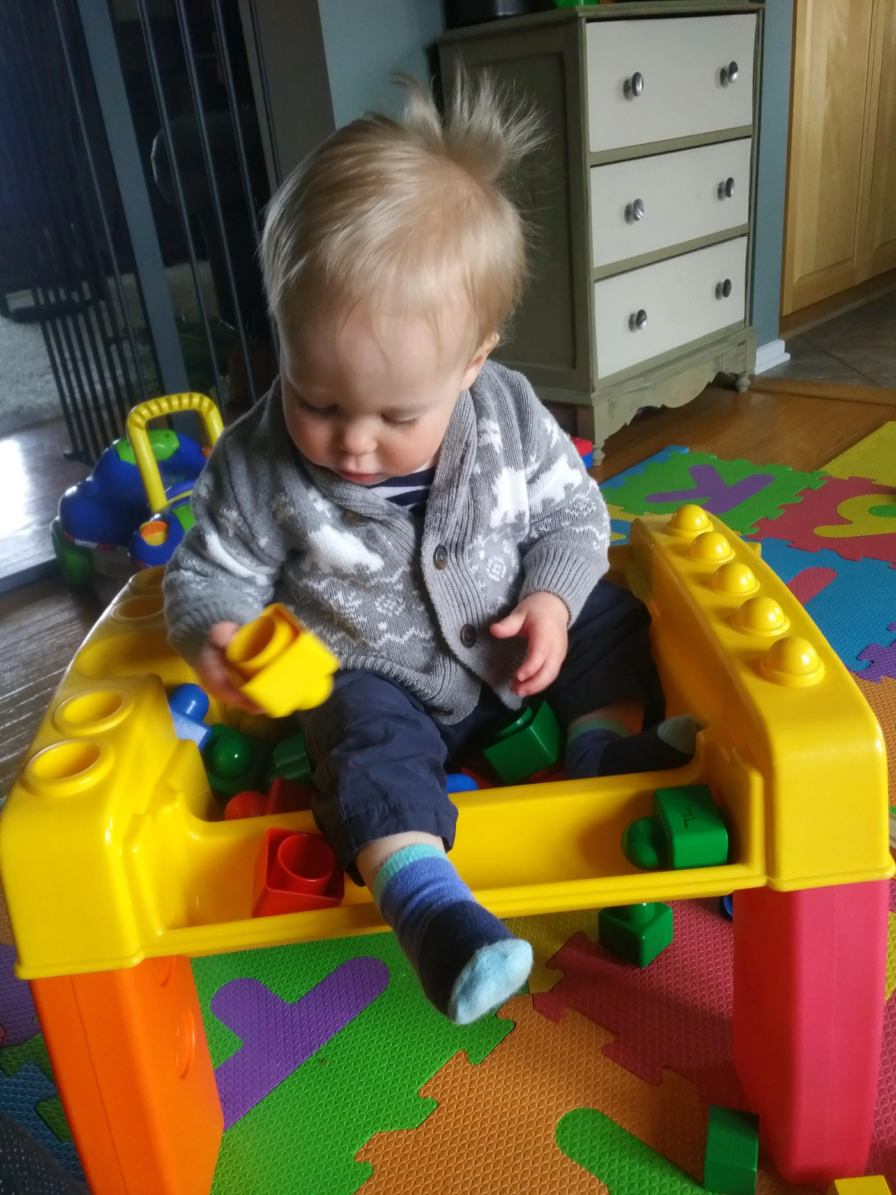 New tasks – Isaac will wipe up his spills when asked, he’s started trying to get undressed for bath (and tries to climb into the tub), gets his shoes and hat to go outside and tries to put them on, wipes his own nose (still unsuccessfully but tries), sits on the potty (fully clothed still) and throws his toilet paper in the toilet, flushes the toilet, picks up food he has dropped when asked, puts toys away, points to body parts when asked, points to the duck on the page of animals, brushes his own teeth and hair