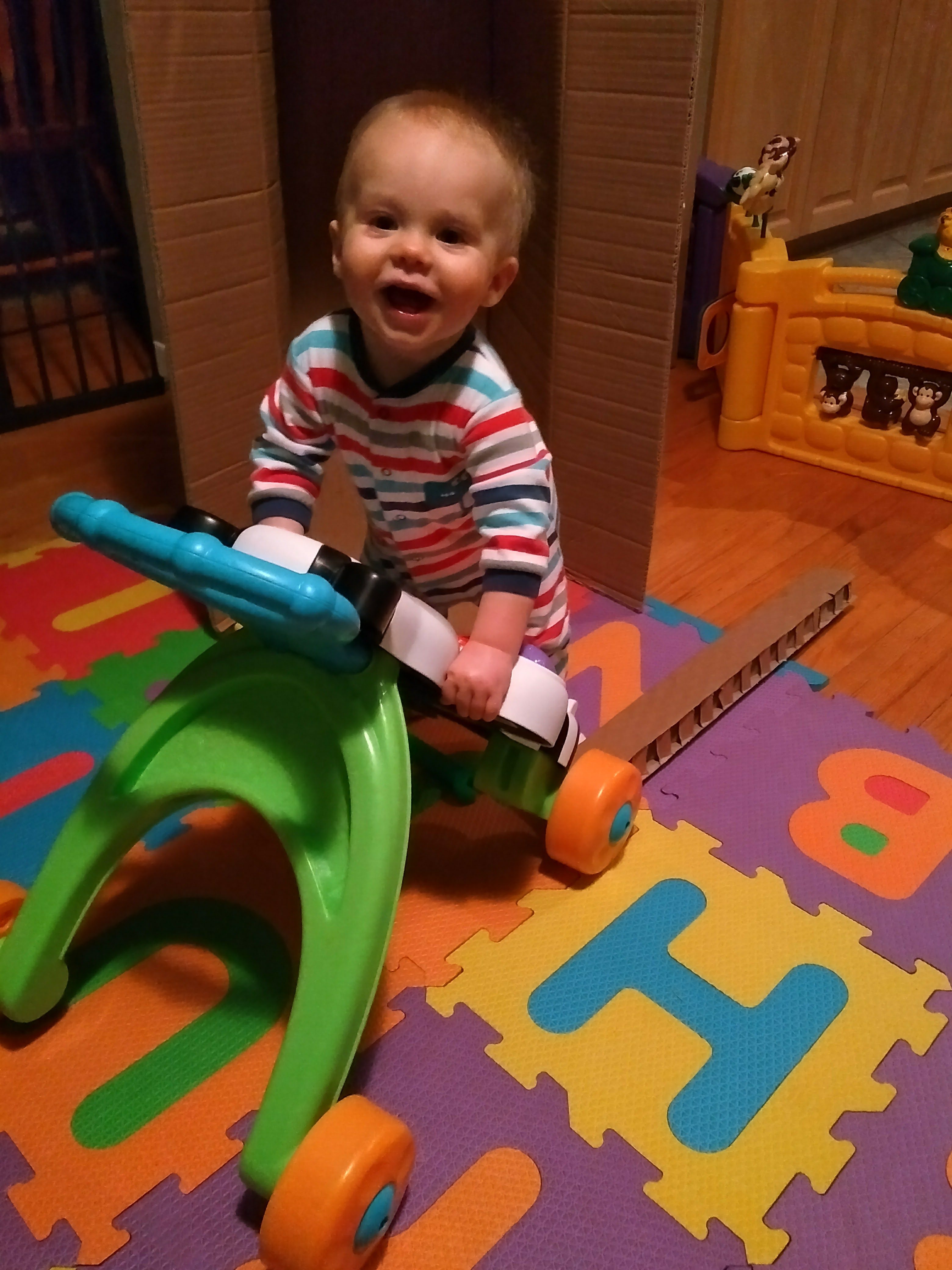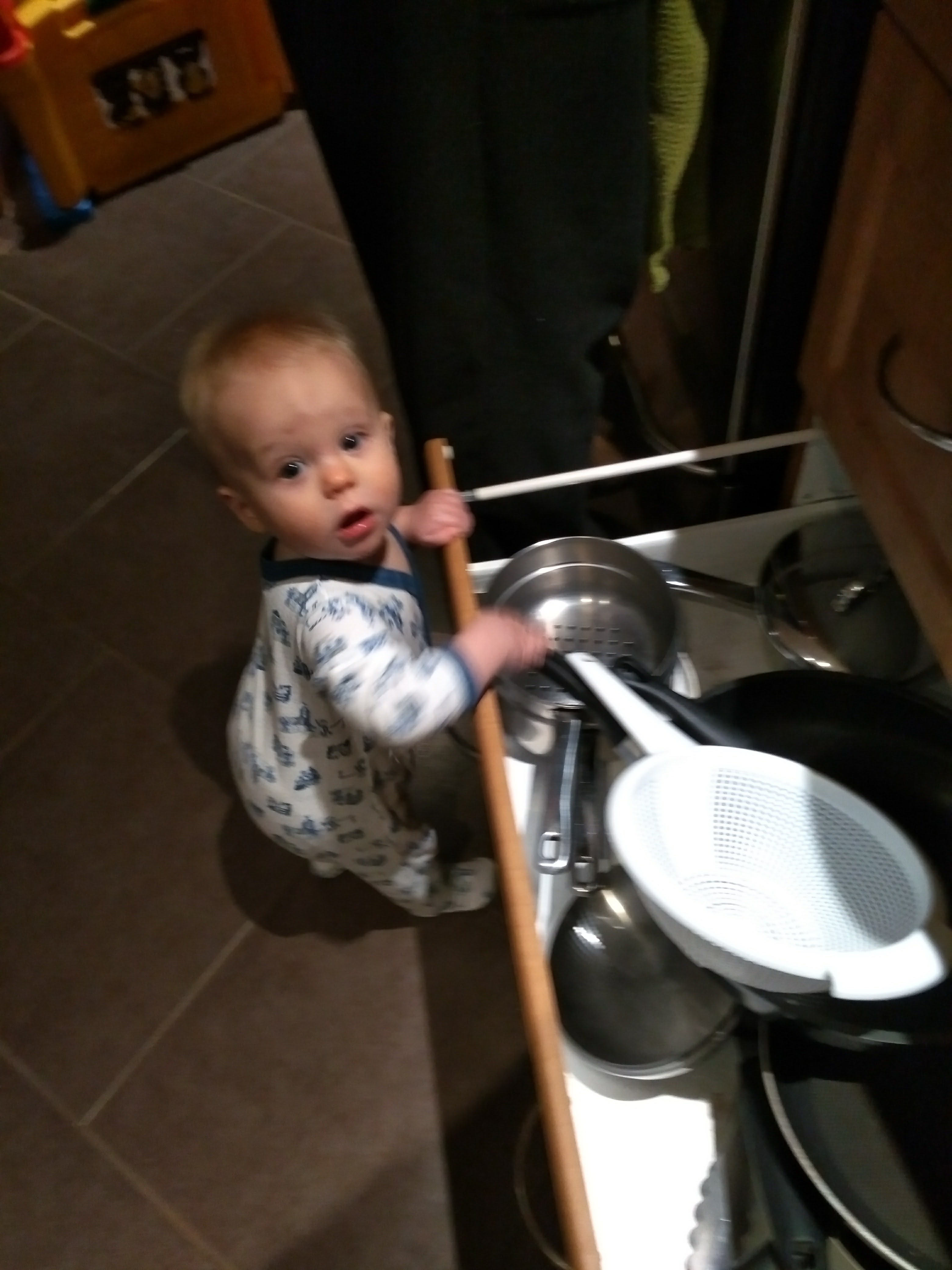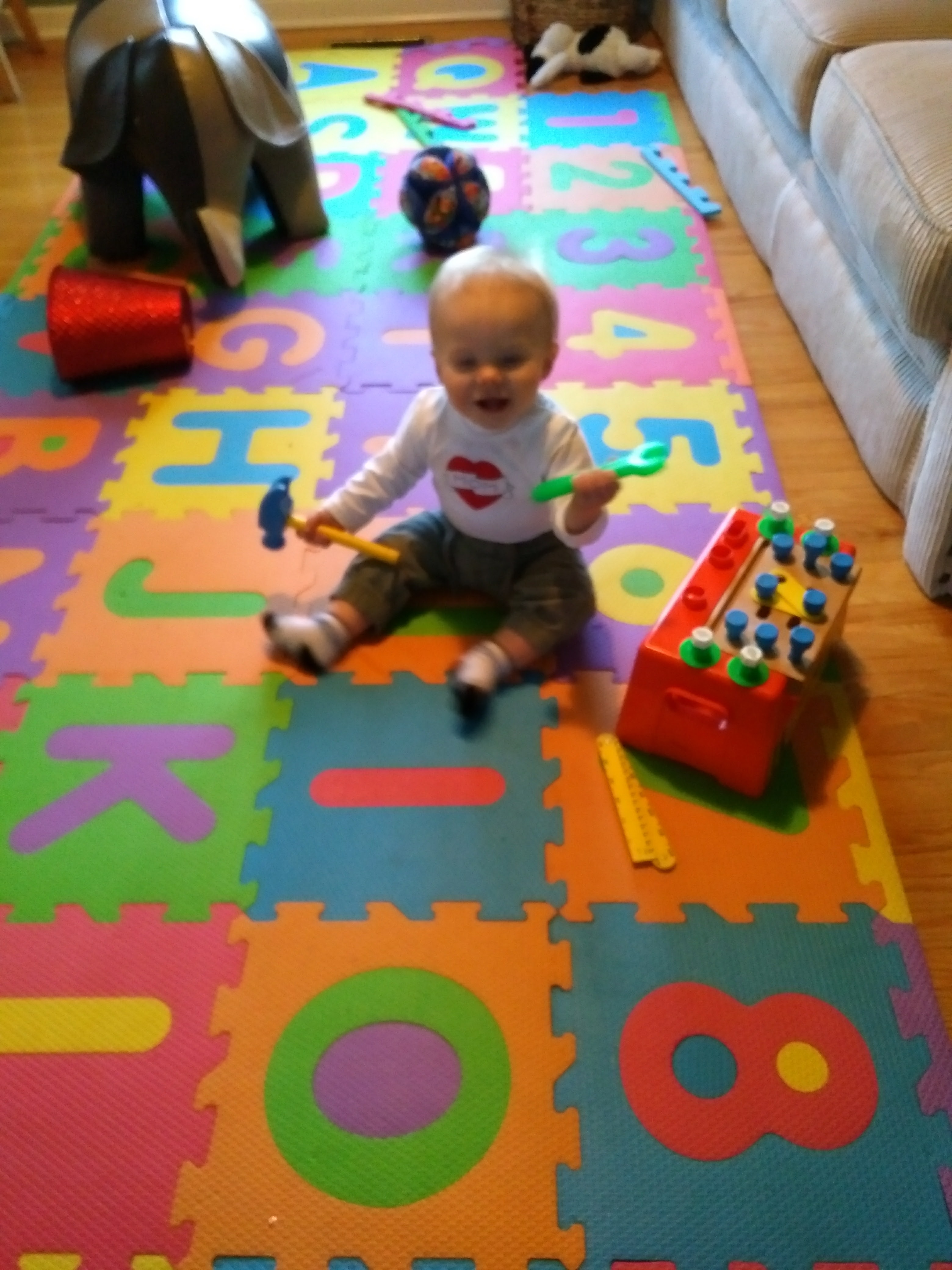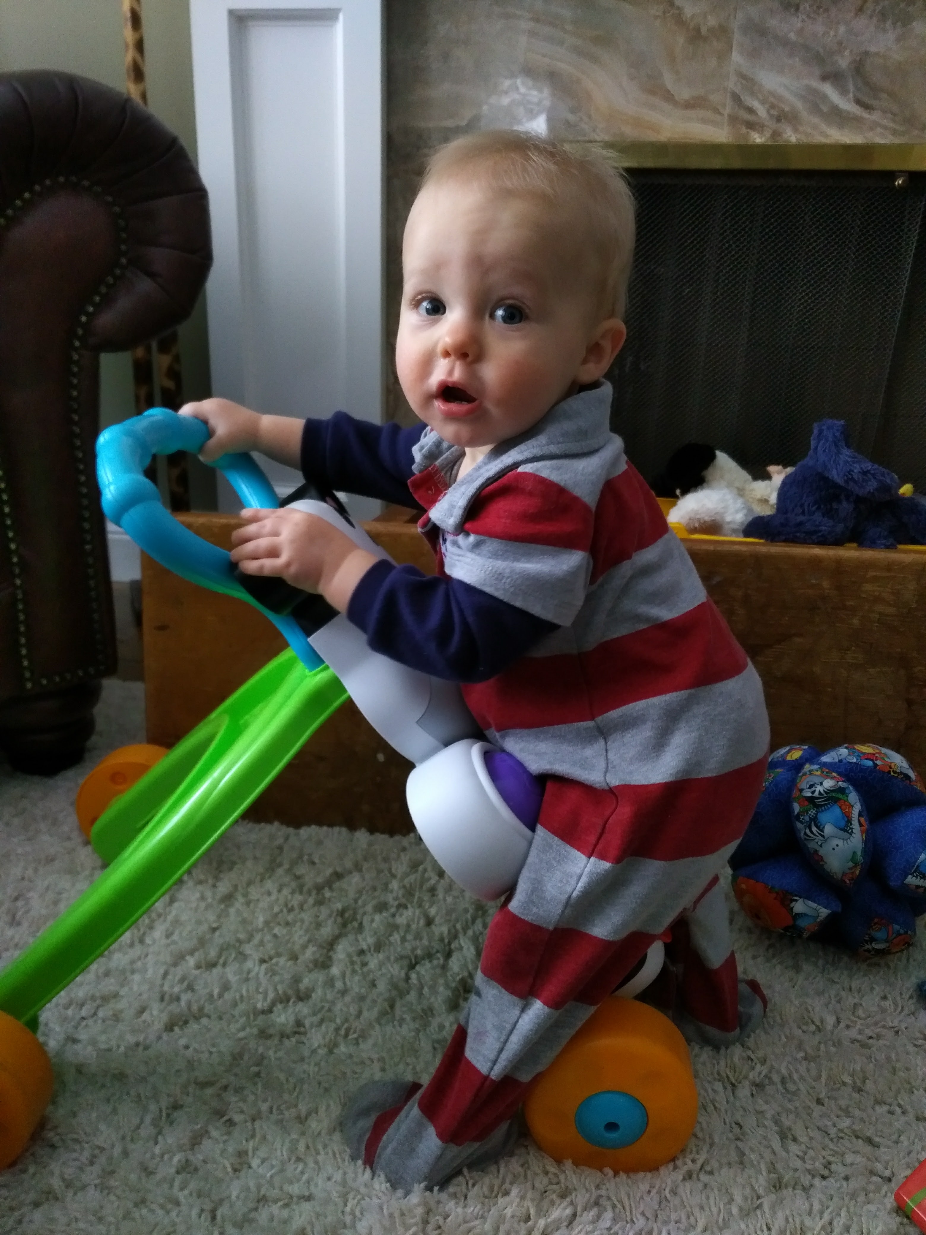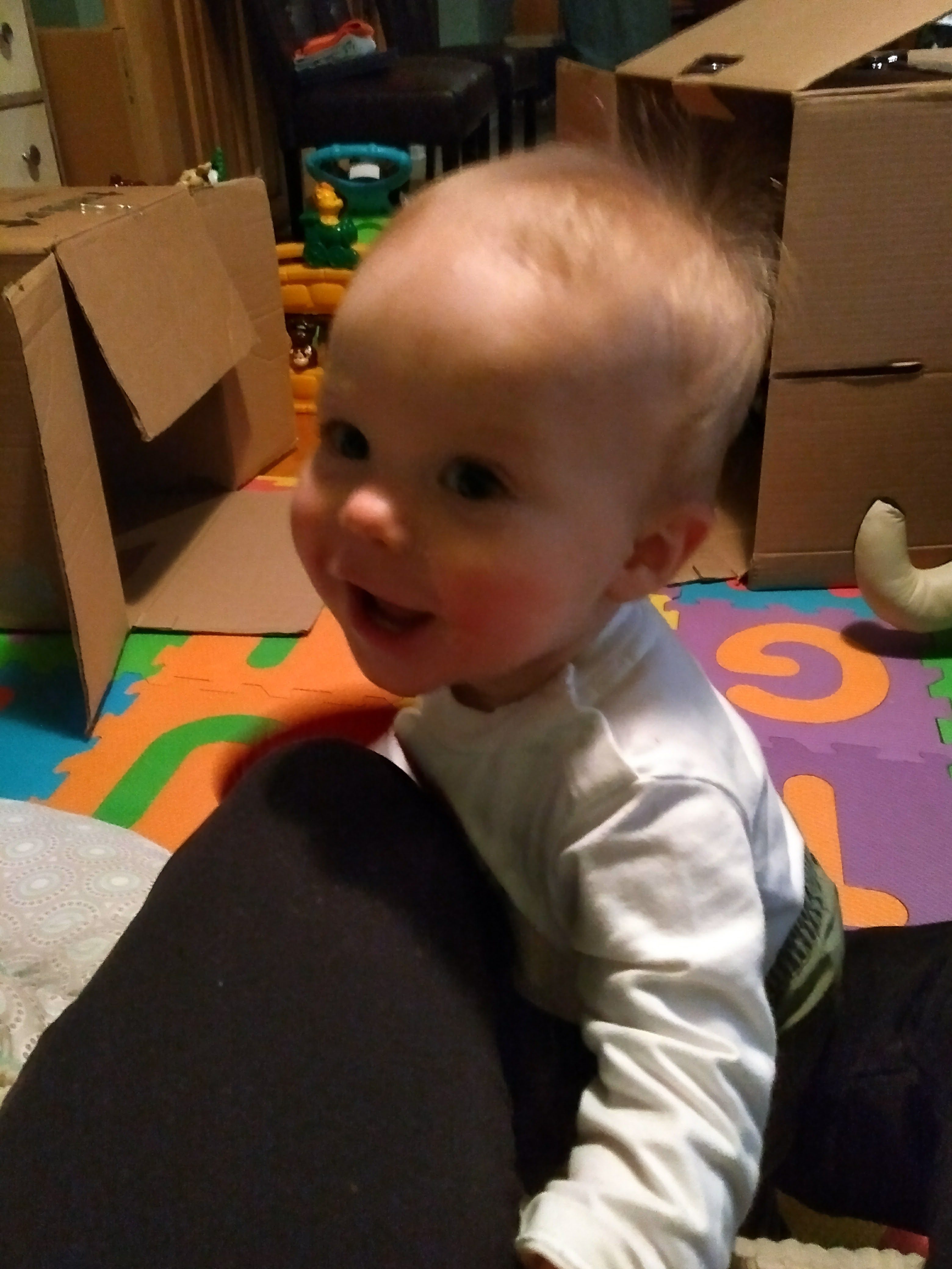 9 months old, with a few more teeth, not quite 17lbs, but almost walking! Isaac is always motoring around either speedy on all 4s, cruising along the furniture or practically running behind a walking toy. He’s been enjoying his new play space and loves exploring the new house. He’s even been trying to help unpack…