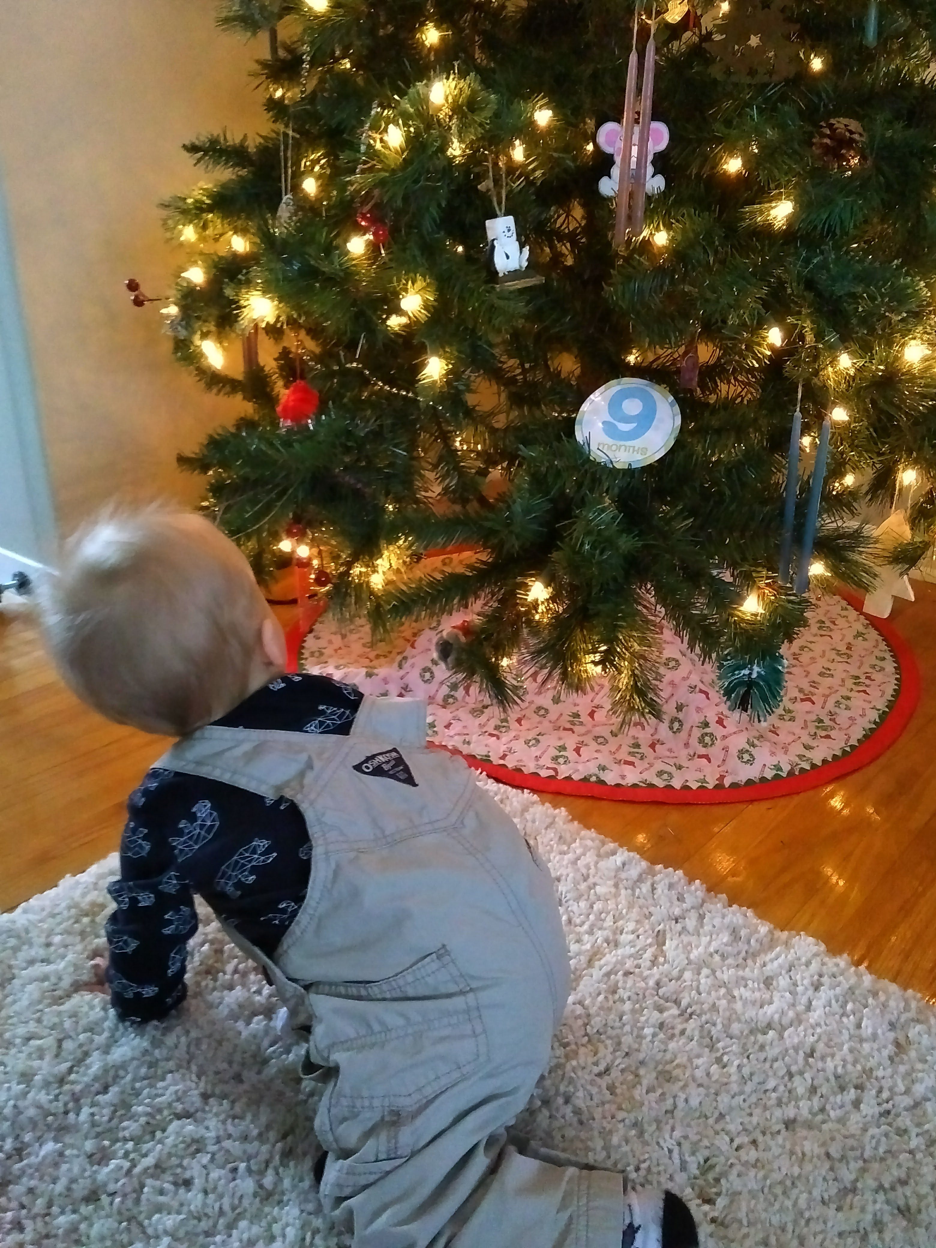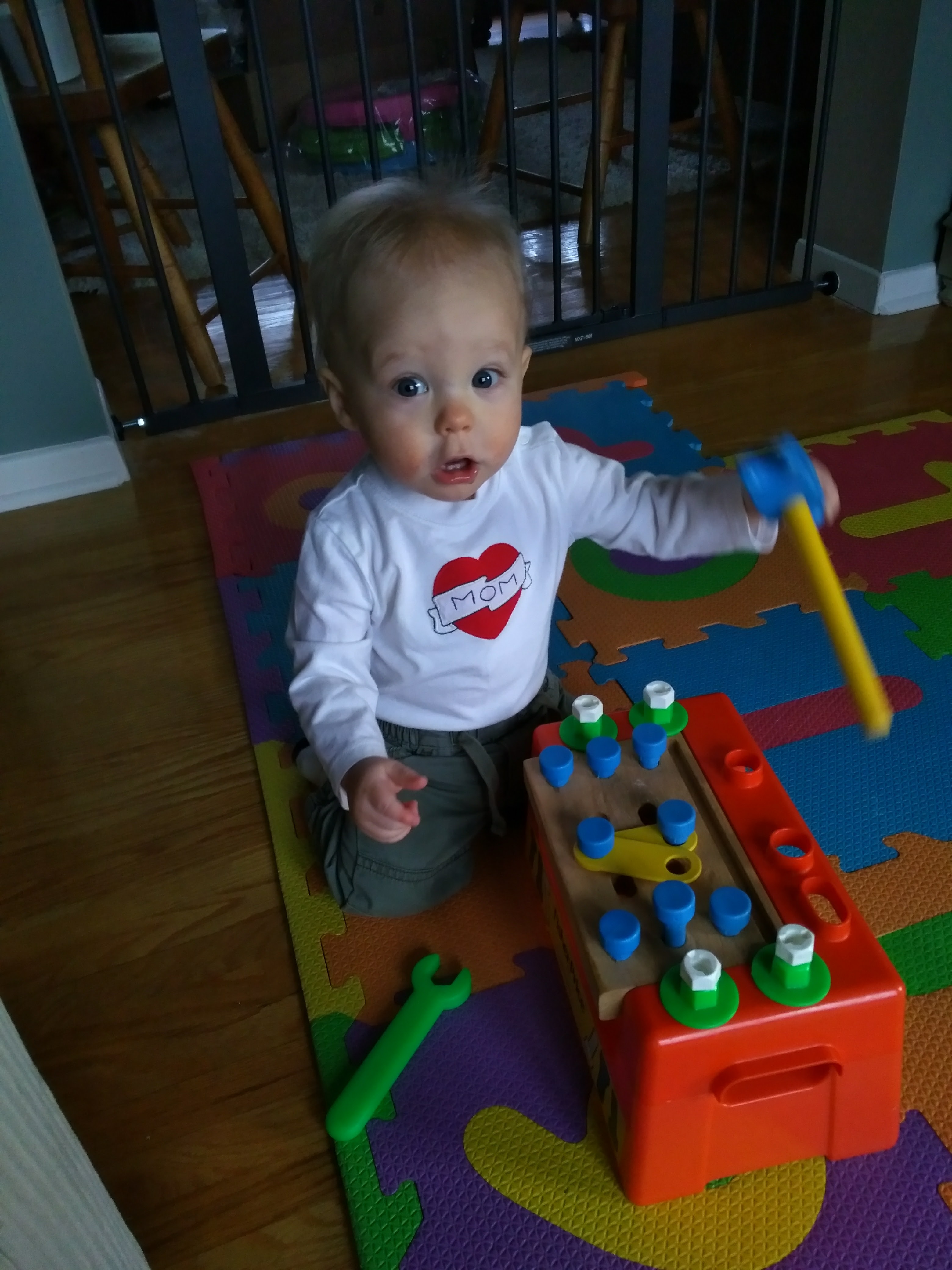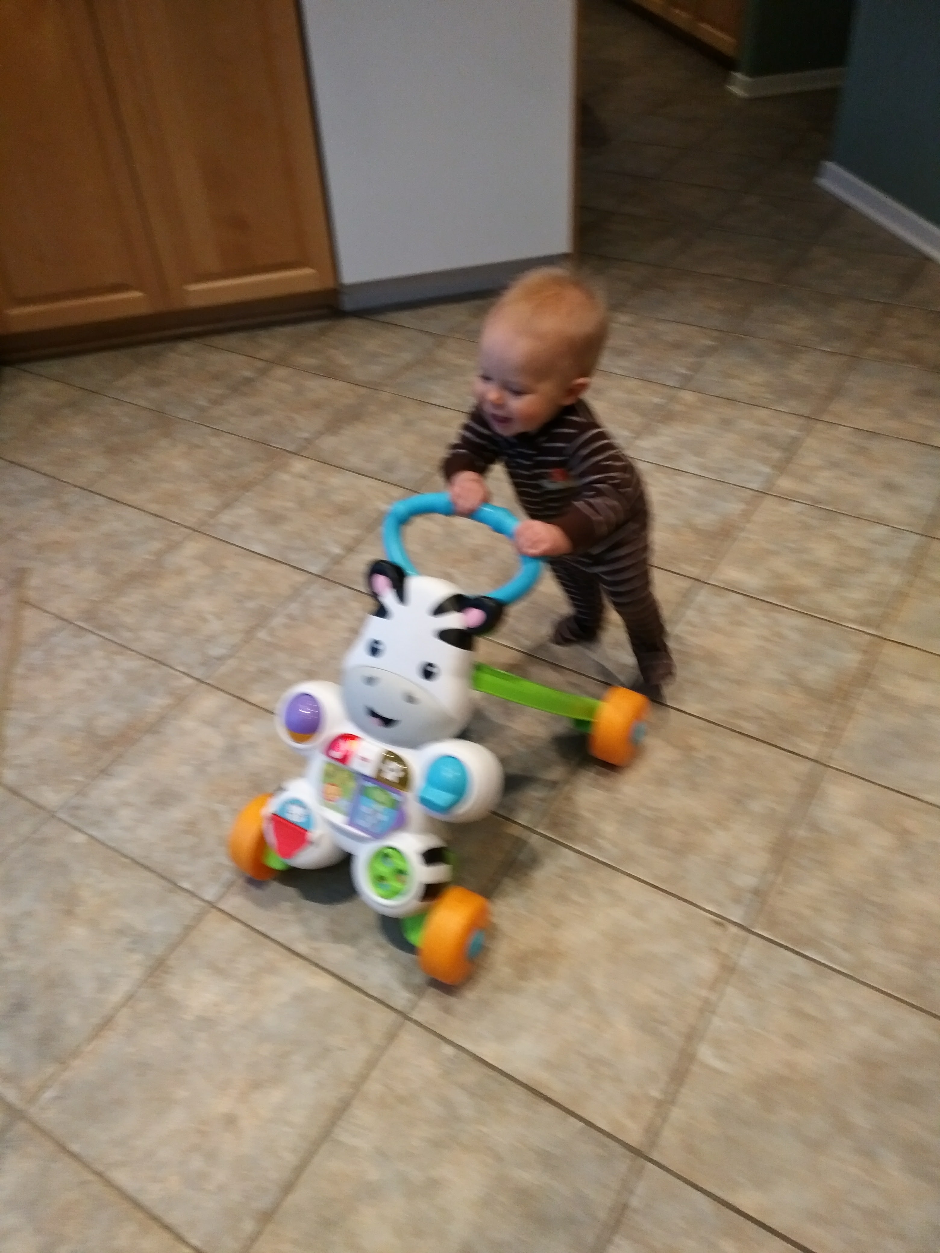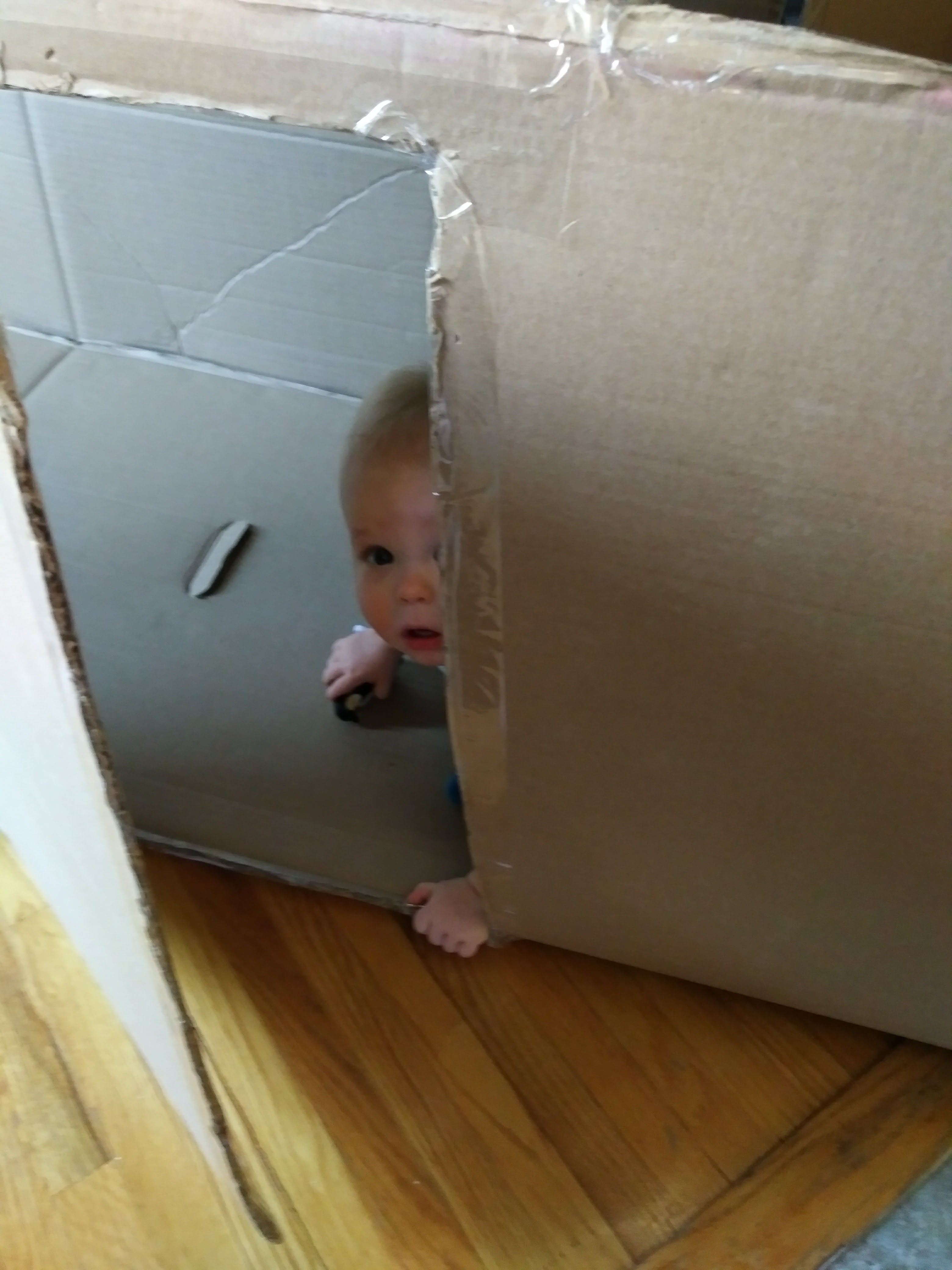 9 months old, with a few more teeth, not quite 17lbs, but almost walking! Isaac is always motoring around either speedy on all 4s, cruising along the furniture or practically running behind a walking toy. He’s been enjoying his new play space and loves exploring the new house. He’s even been trying to help unpack…