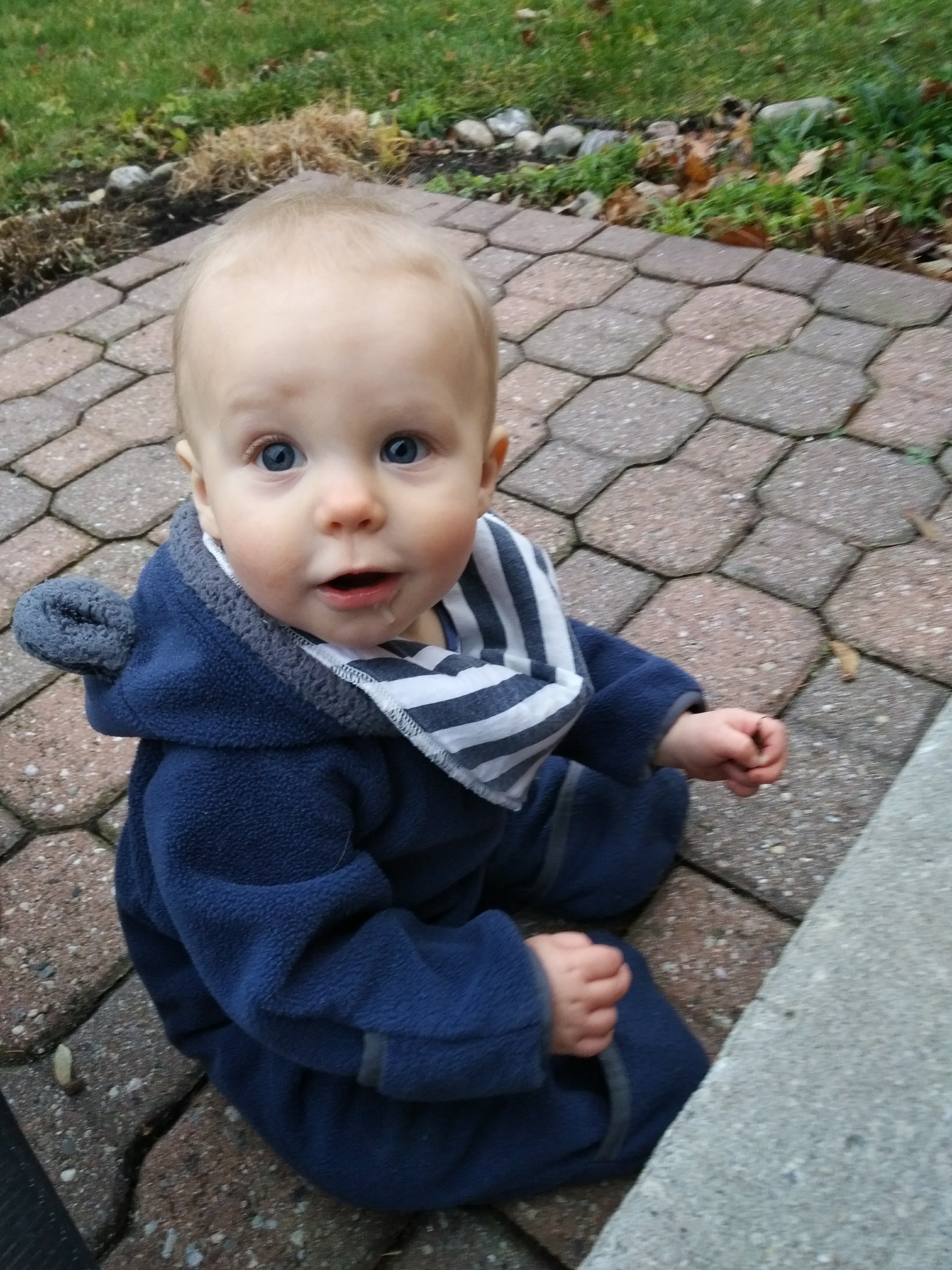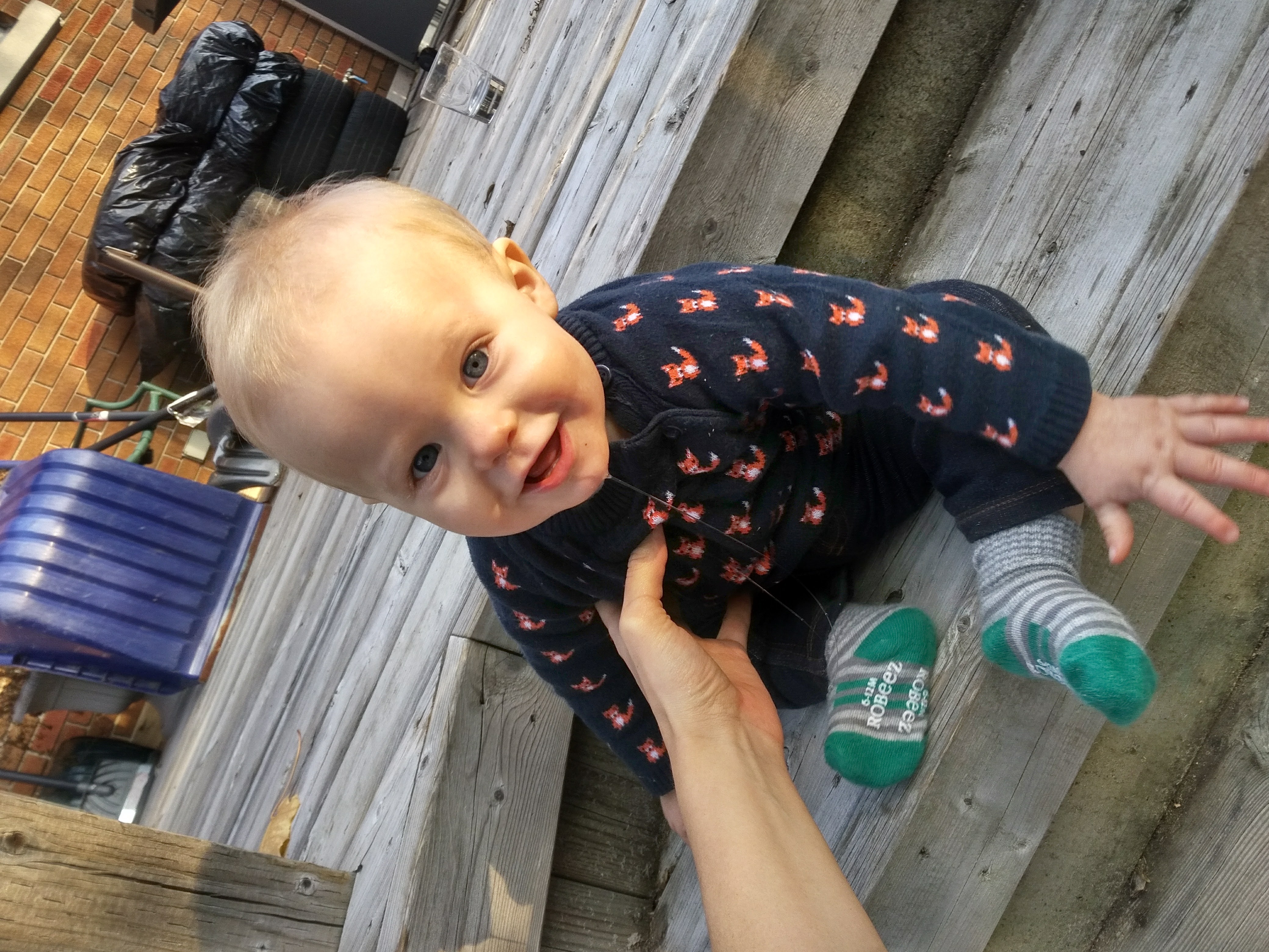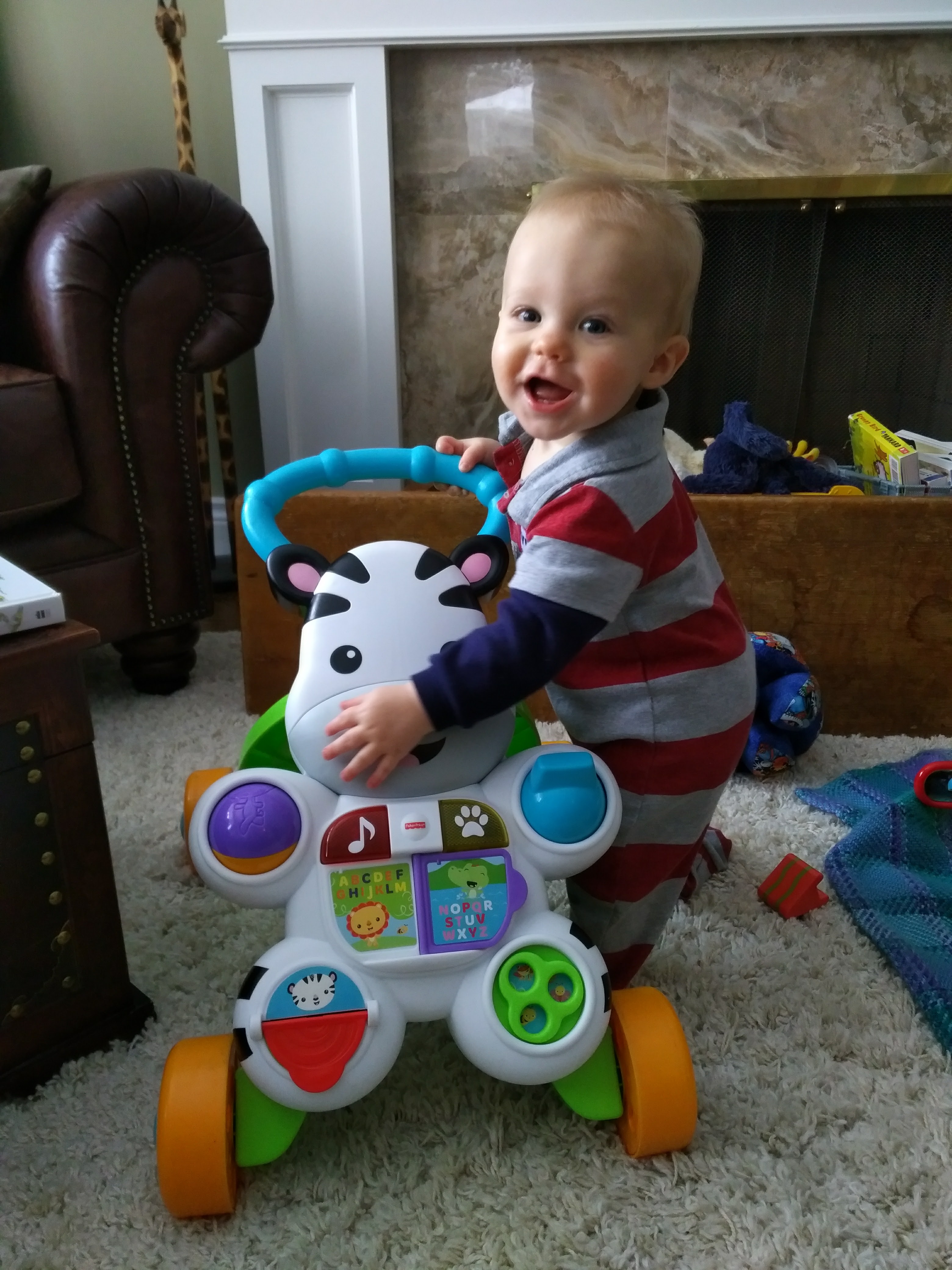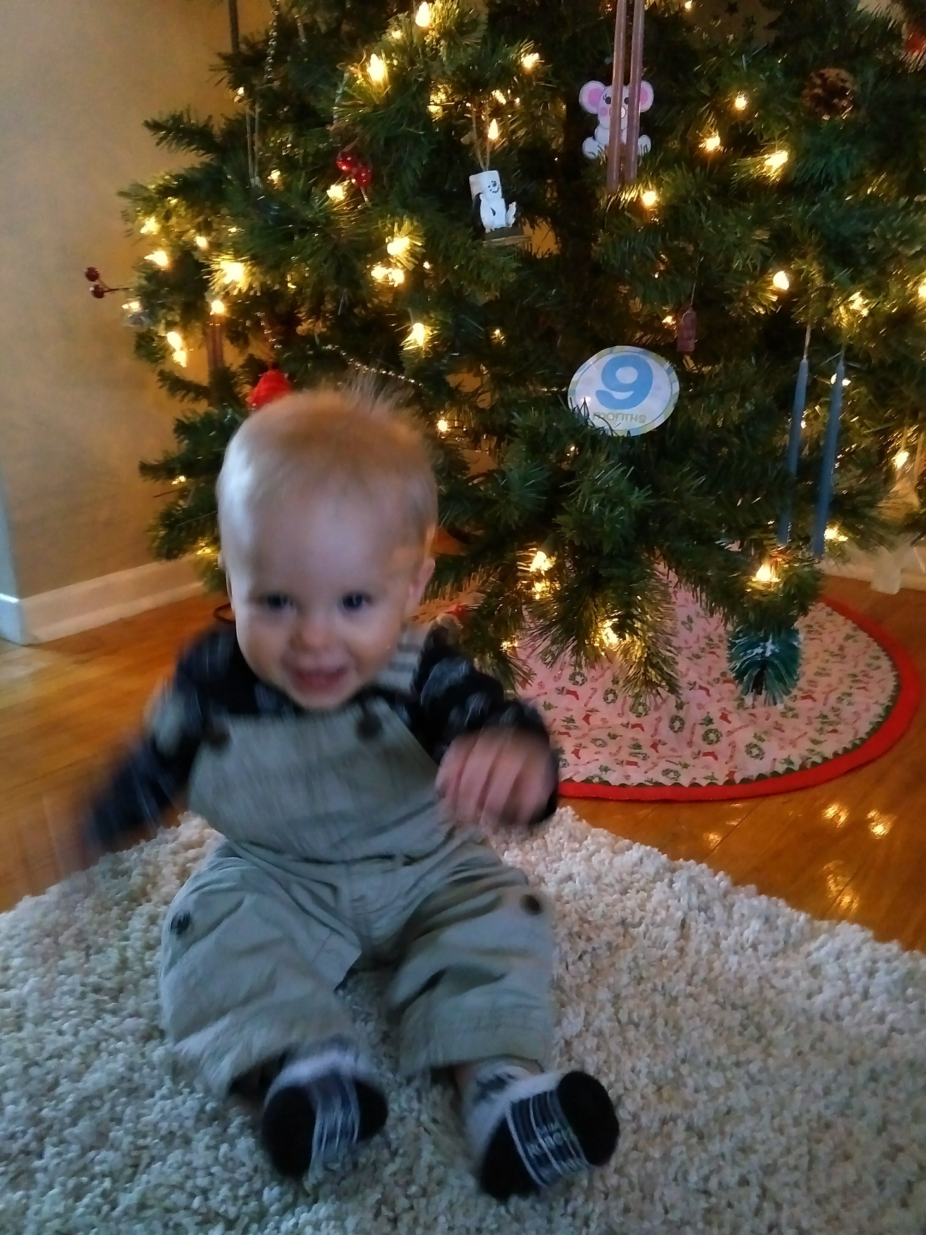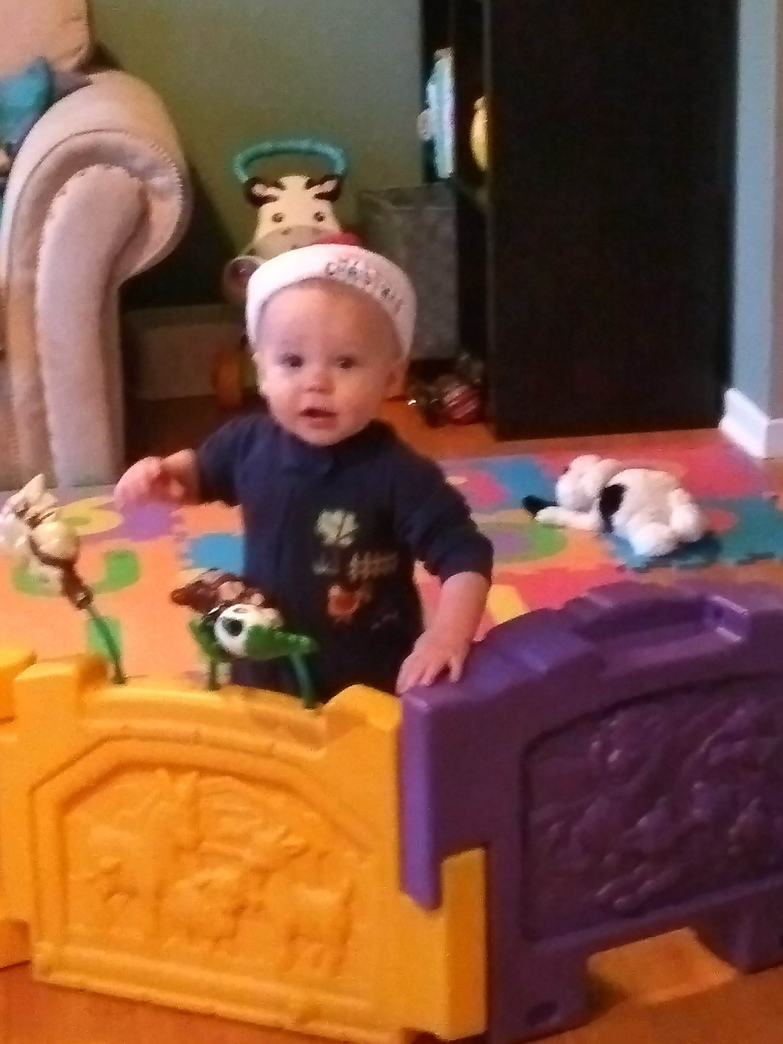 9 months old, with a few more teeth, not quite 17lbs, but almost walking! Isaac is always motoring around either speedy on all 4s, cruising along the furniture or practically running behind a walking toy. He’s been enjoying his new play space and loves exploring the new house. He’s even been trying to help unpack…