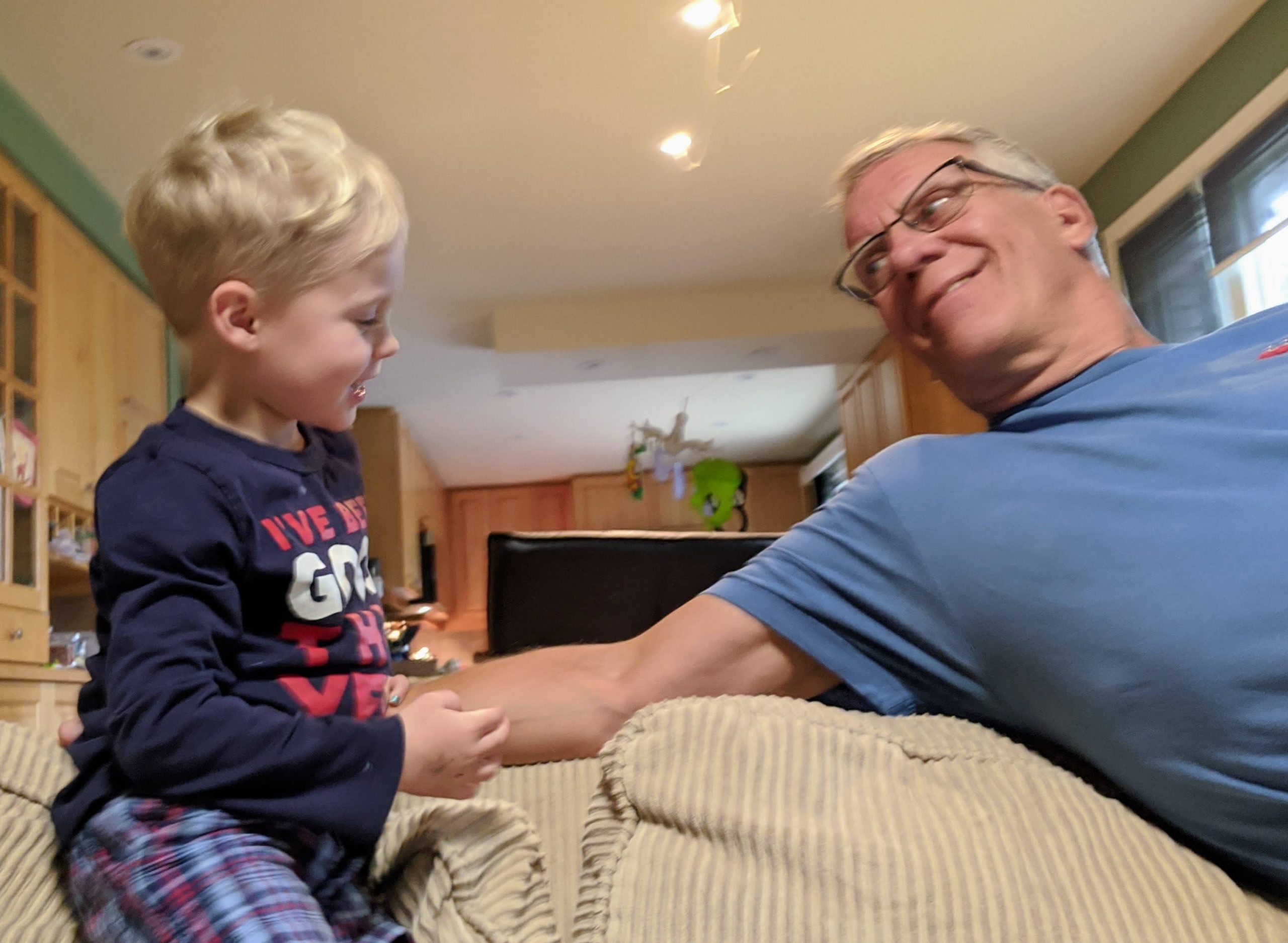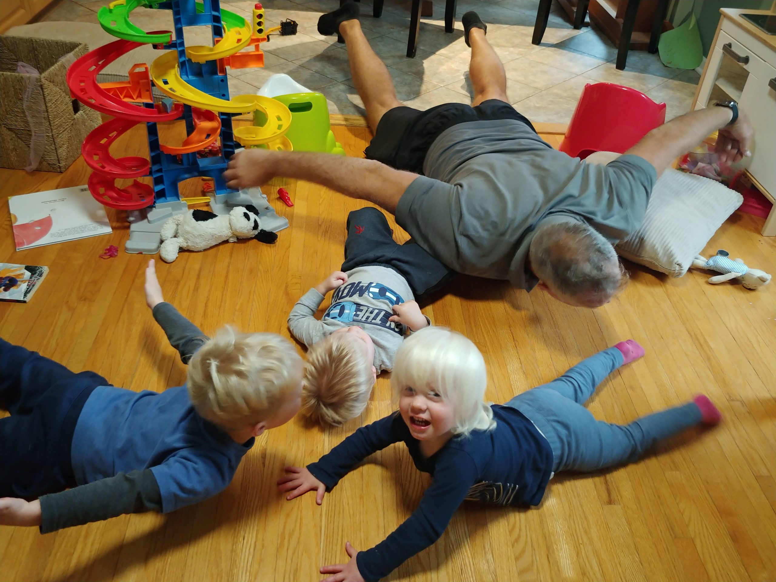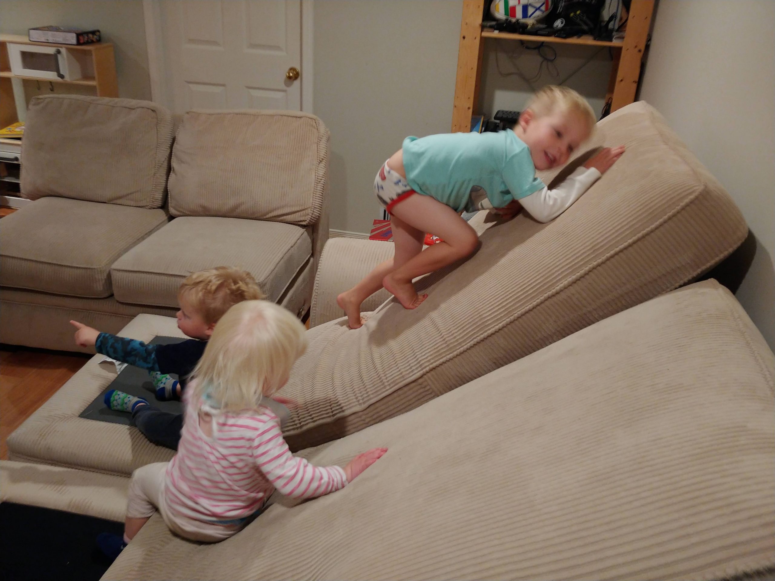 Cadence is always motioning for us to come play with her, and says “come” (sounds like ummm”). Asher is always bringing us a book to read to him. Isaac is always climbing on our heads. Makes it hard to do all three at once…