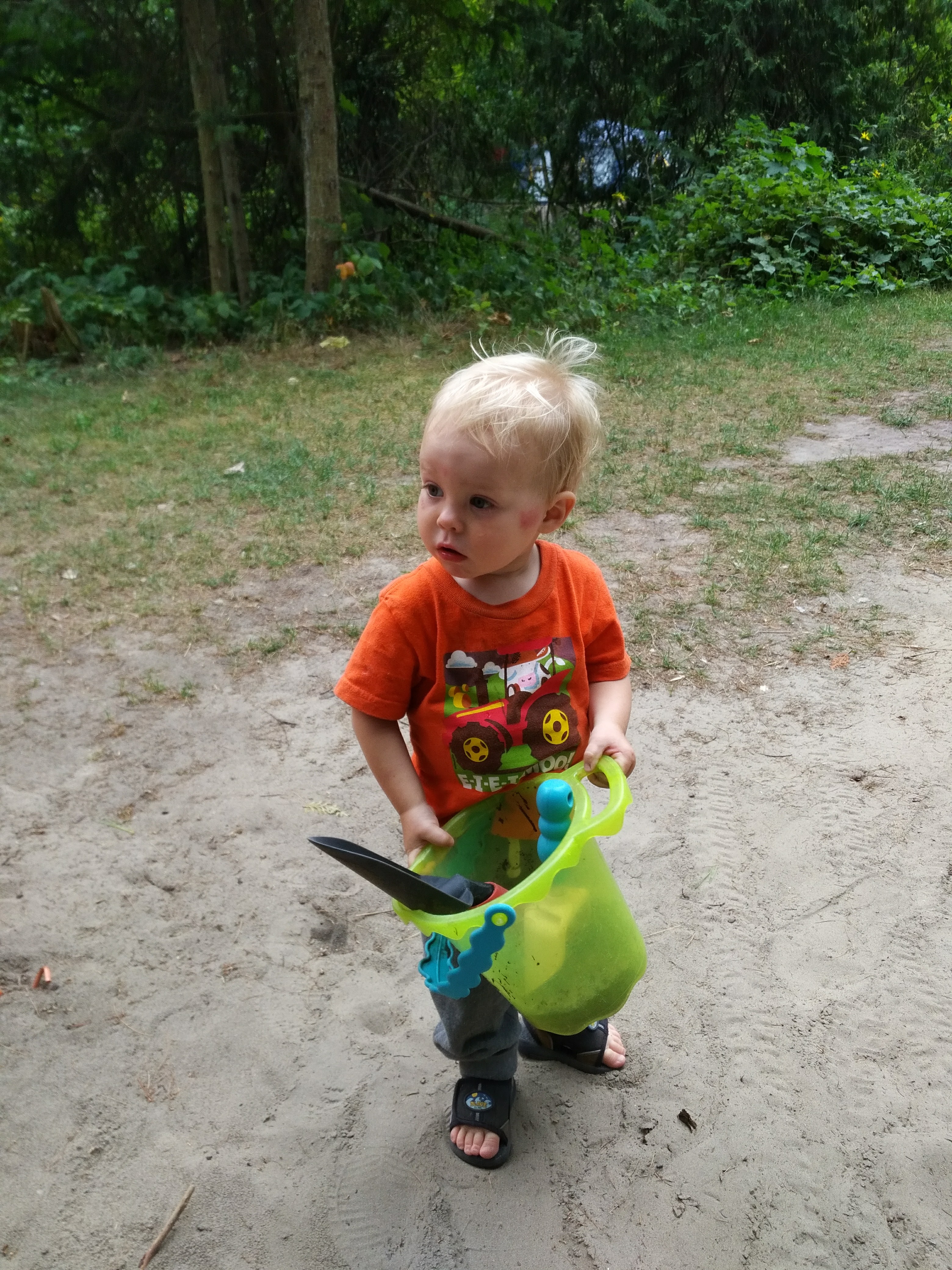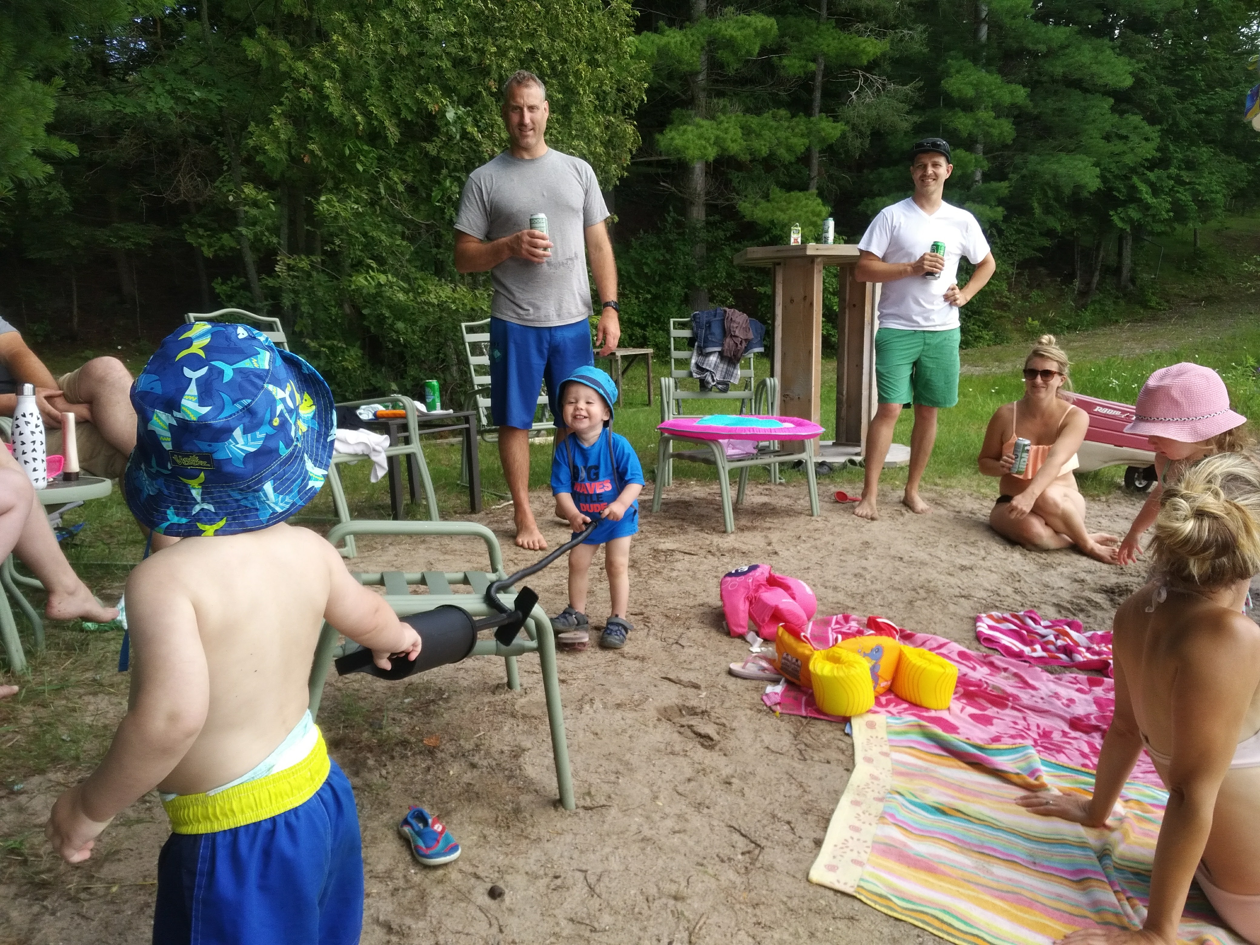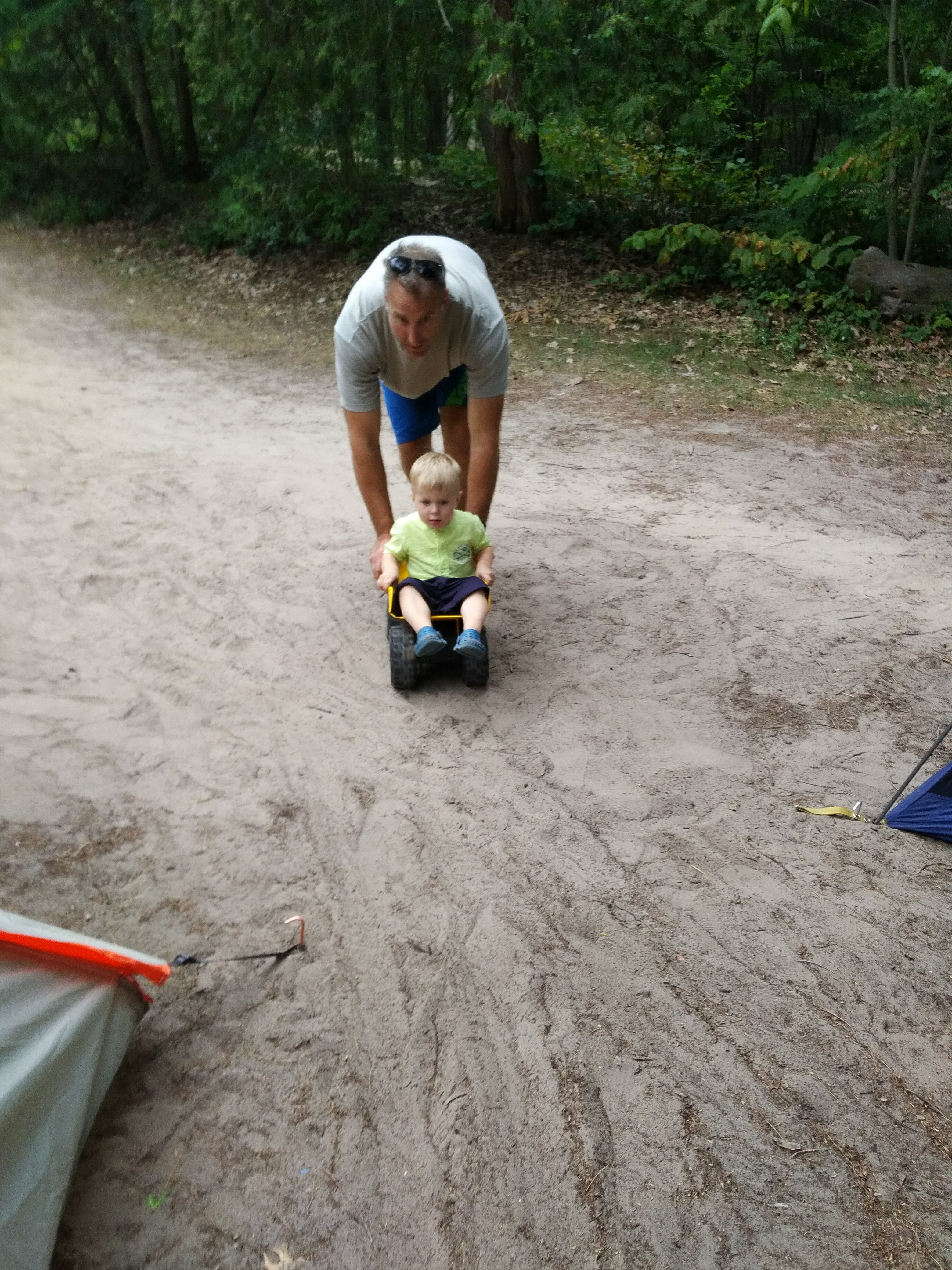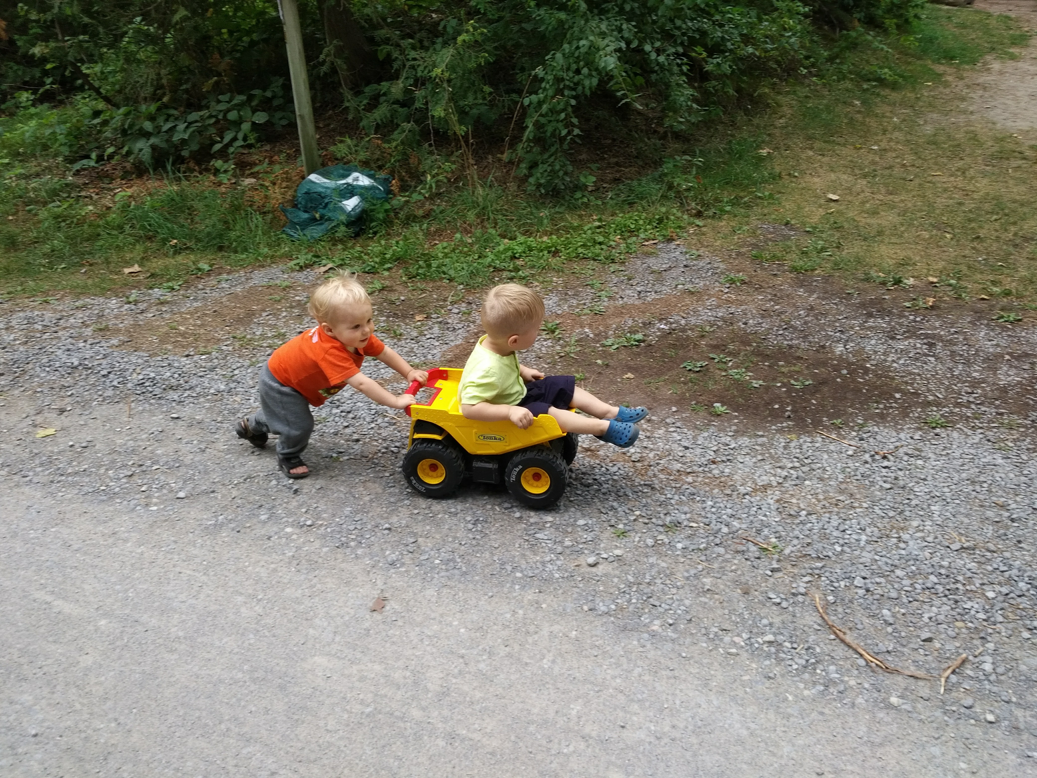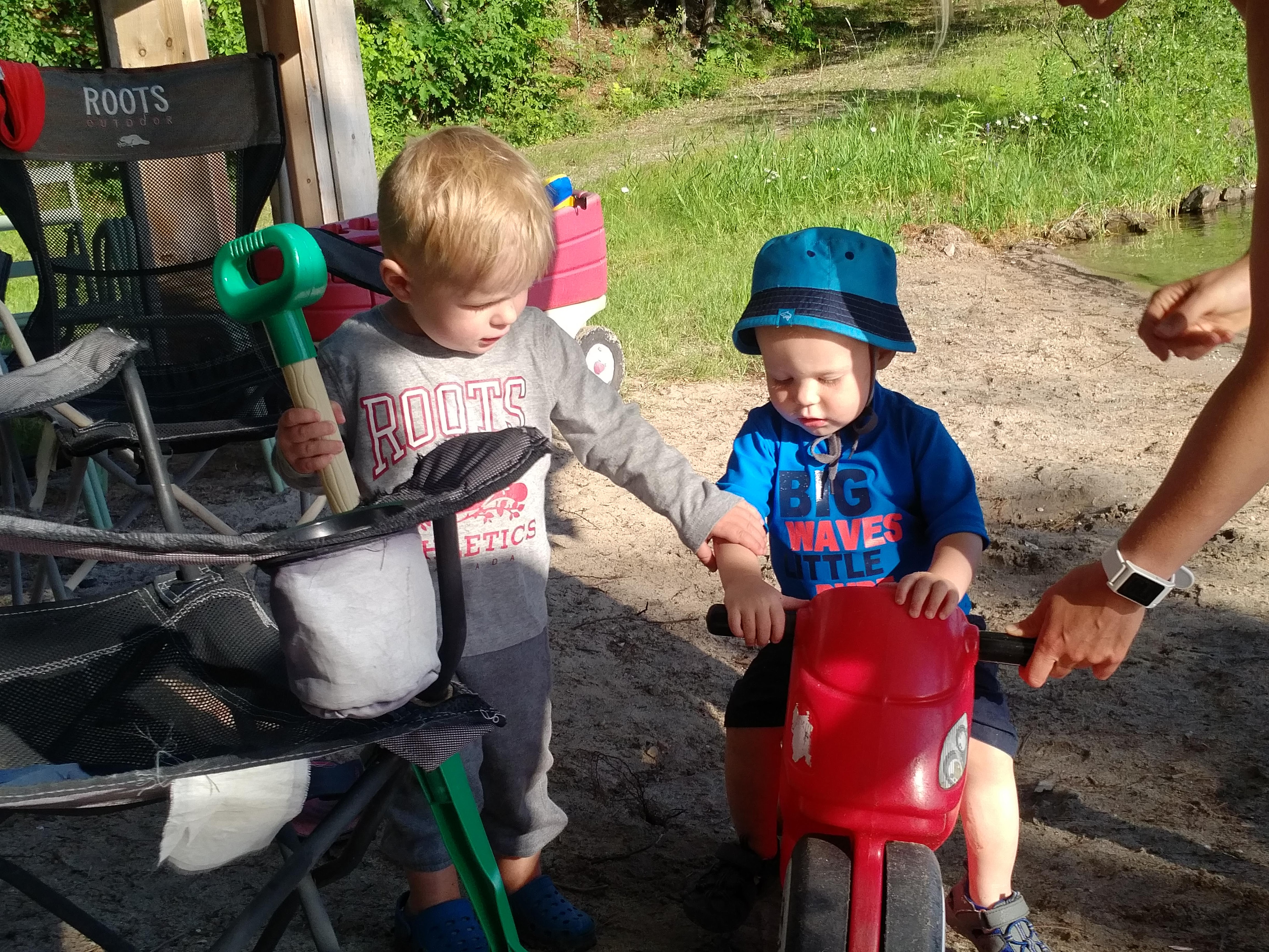 Between the trips to the cottage, family bbq’s and bbq’s with friends – Isaac has been enjoying daycare. Better yet, Isaac loved our weekend at Sandbanks, camping in a tent, chasing seagulls, digging holes in the sand, and splashing in the waves. Most of all, Isaac loved pushing his cousin Hank around in his dump truck.