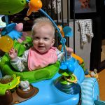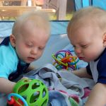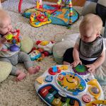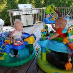 Now that the babies are sitting up and moving, they are spending less time in the exersaucers and stroller because they want to be free to roam. It makes for happier babies generally, but they also manage to get themselves into interesting situations as well. with one baby kicking the other one in the head or stealing a toy or stuck under furniture. Bathtime is more entertaining too as the babies start to really splash and play while sitting up in the tub or sometimes in the stand-up shower too. Isaac has really taken to entertaining the babies, who are infatuated with him and giggle non-stop at his antics. He seems to be enjoying them even more now that they interact with him. With the weather being a bit cooler, it is more appealing to try to take the babies outside – however we are now also on more of a schedule with two long naps a day so it can be a struggle to get out in between feedings and naps. But hey, with nights still a crap-shoot for sleep, we’ll take the sleep when we can get it! Although we may have finally figured out how to feed Asher enough so that he sleeps better, so we might be headed for some better nights. We were back to sleepless nights after the August long weekend at the cottage, in which all three kids were waking up more than once a night at separate times of course. Then we moved into the “should have been a good night”, when on an individual basis, each kid slept well, but combined meant we were still up 4 times a night. Fingers crossed that we can get it down to once or twice a night on a regular basis!