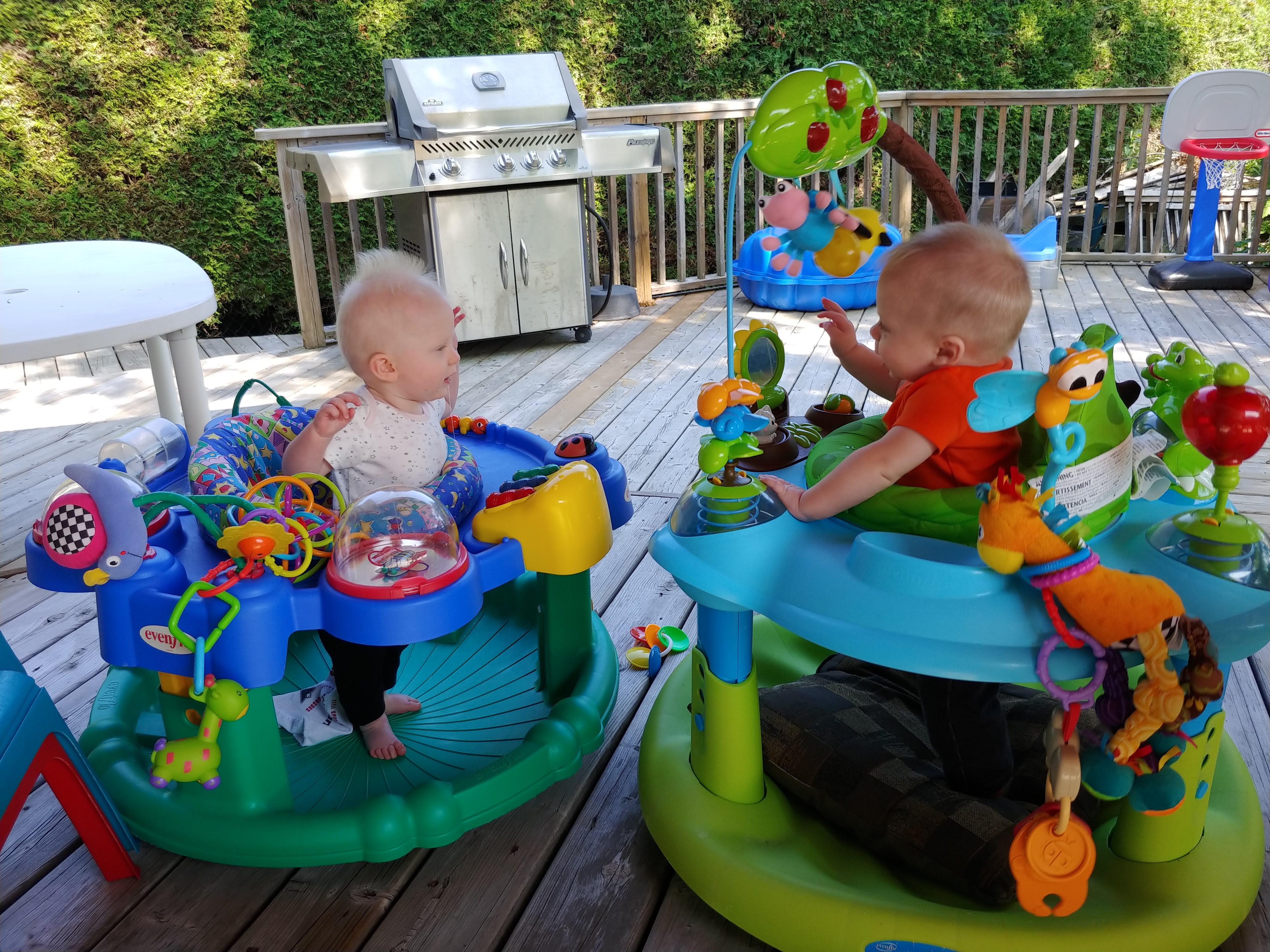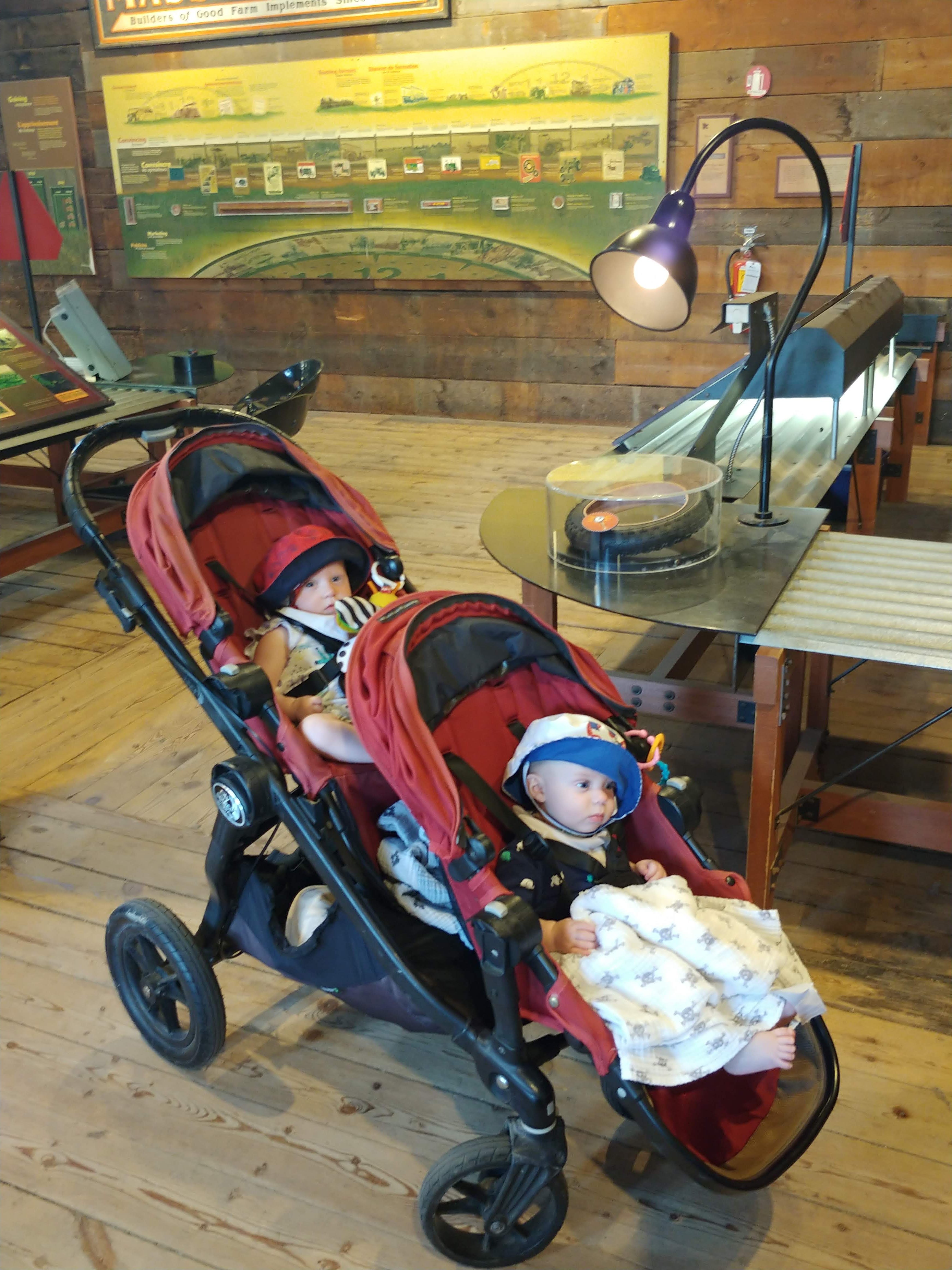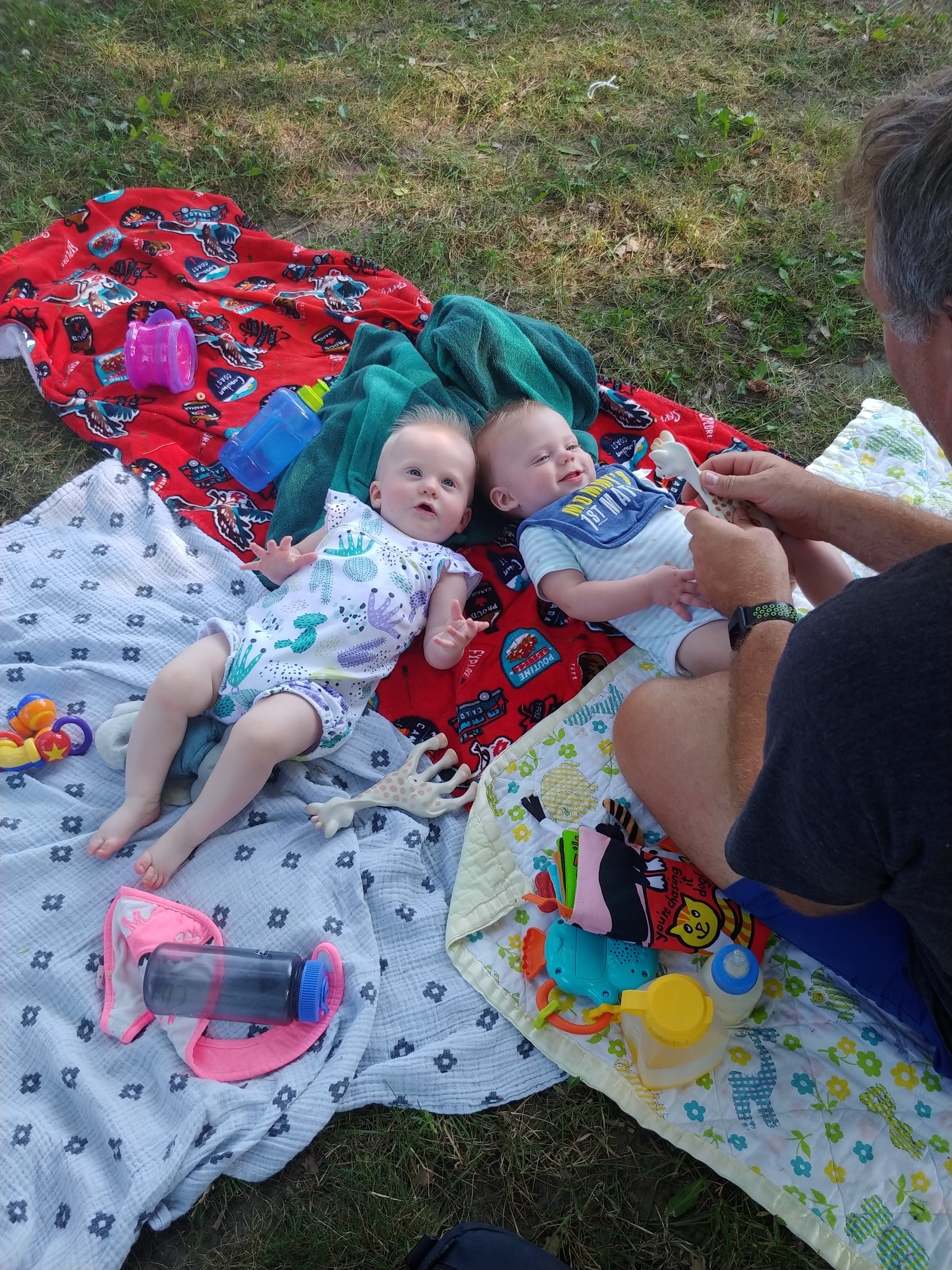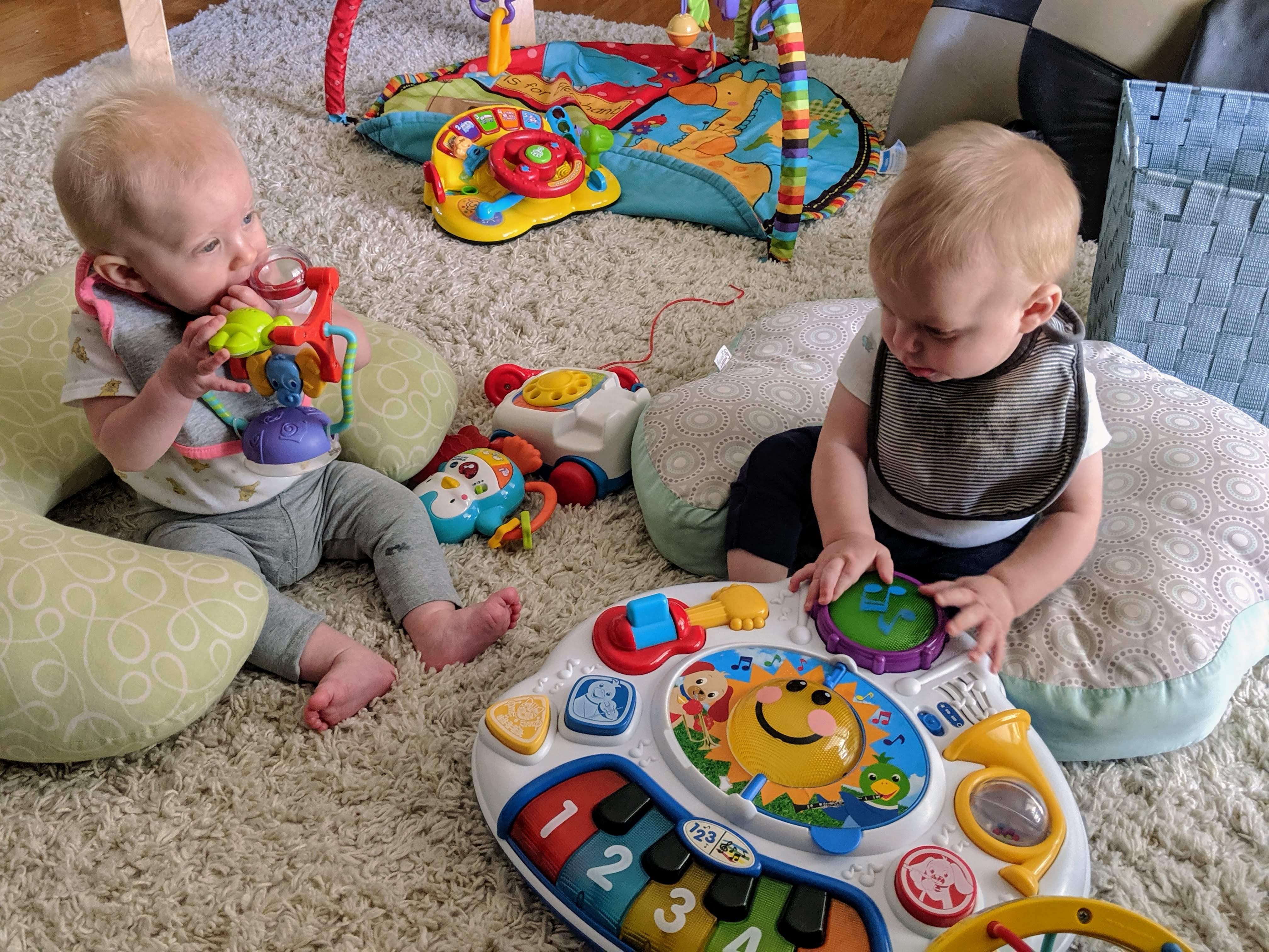 Now that the babies are sitting up and moving, they are spending less time in the exersaucers and stroller because they want to be free to roam. It makes for happier babies generally, but they also manage to get themselves into interesting situations as well. with one baby kicking the other one in the head or stealing a toy or stuck under furniture. Bathtime is more entertaining too as the babies start to really splash and play while sitting up in the tub or sometimes in the stand-up shower too. Isaac has really taken to entertaining the babies, who are infatuated with him and giggle non-stop at his antics. He seems to be enjoying them even more now that they interact with him. With the weather being a bit cooler, it is more appealing to try to take the babies outside – however we are now also on more of a schedule with two long naps a day so it can be a struggle to get out in between feedings and naps. But hey, with nights still a crap-shoot for sleep, we’ll take the sleep when we can get it! Although we may have finally figured out how to feed Asher enough so that he sleeps better, so we might be headed for some better nights. We were back to sleepless nights after the August long weekend at the cottage, in which all three kids were waking up more than once a night at separate times of course. Then we moved into the “should have been a good night”, when on an individual basis, each kid slept well, but combined meant we were still up 4 times a night. Fingers crossed that we can get it down to once or twice a night on a regular basis!
