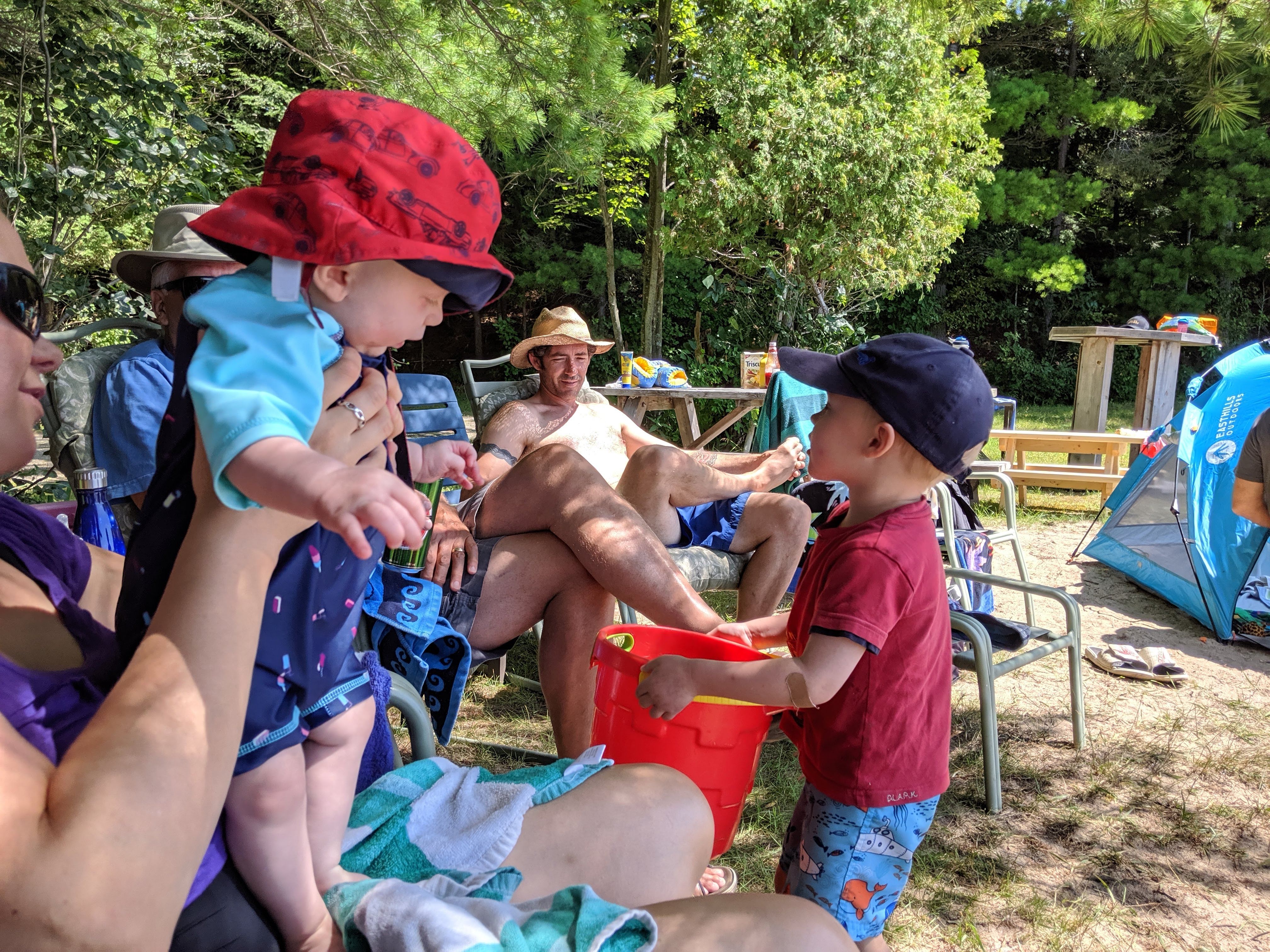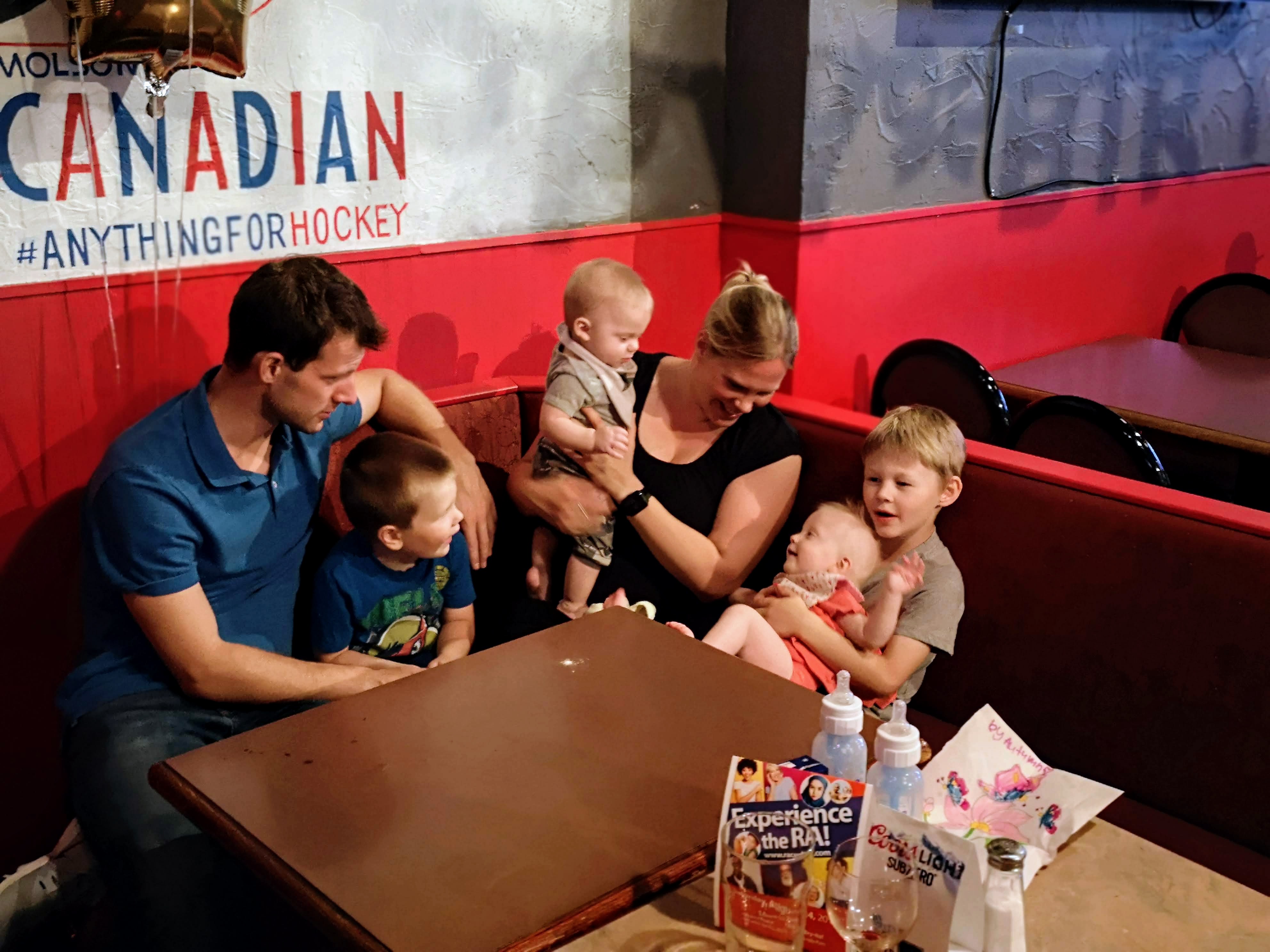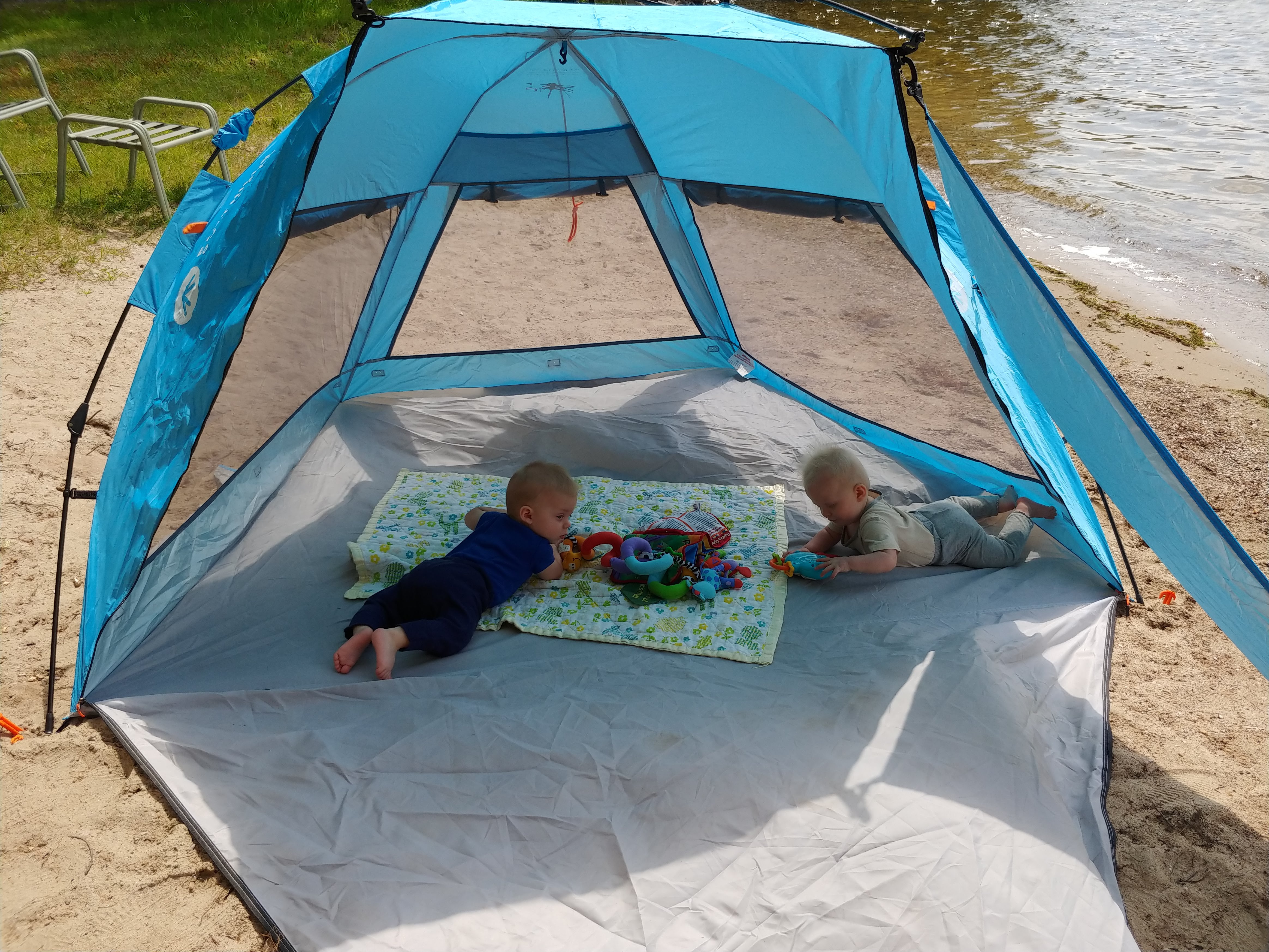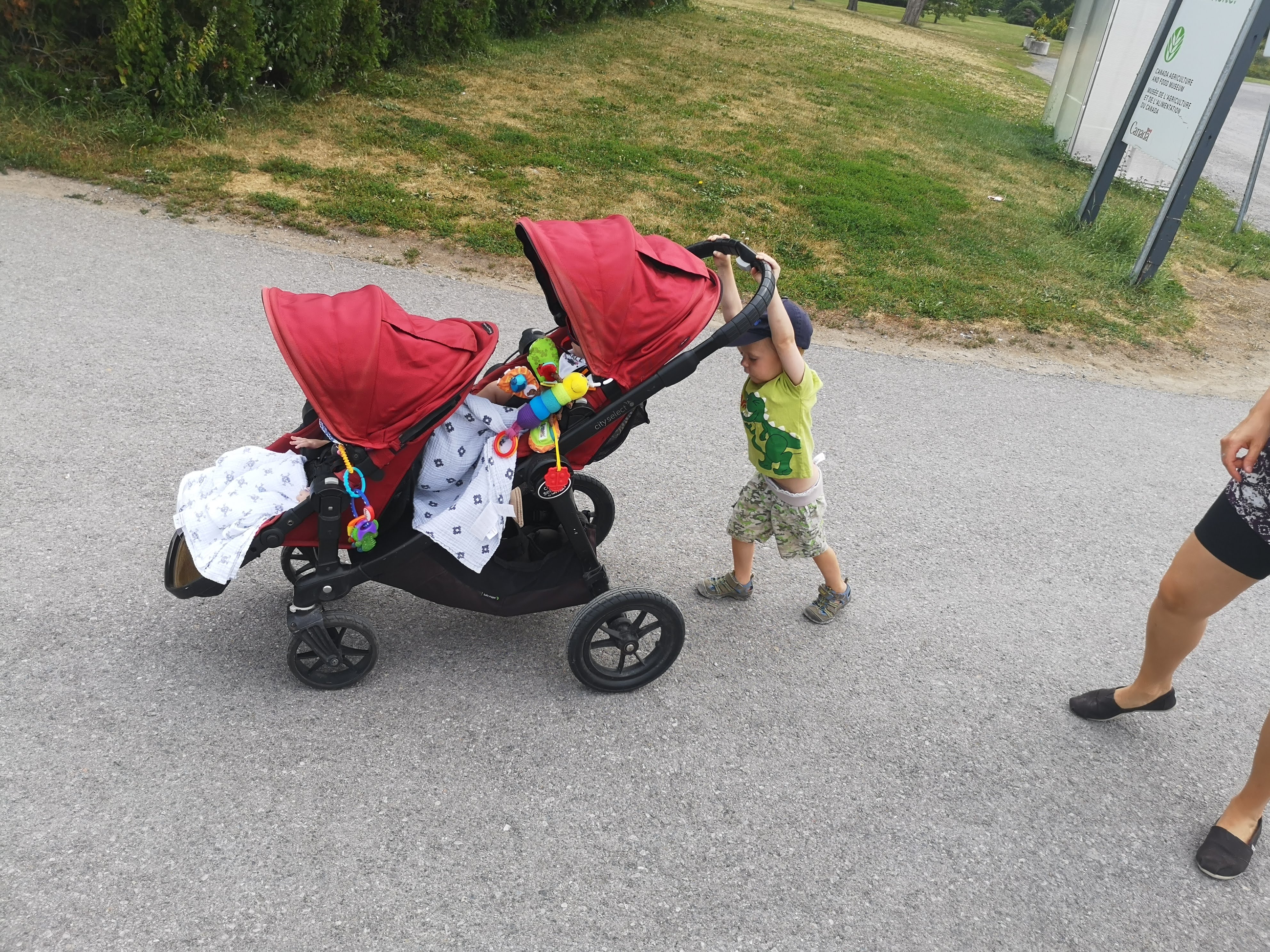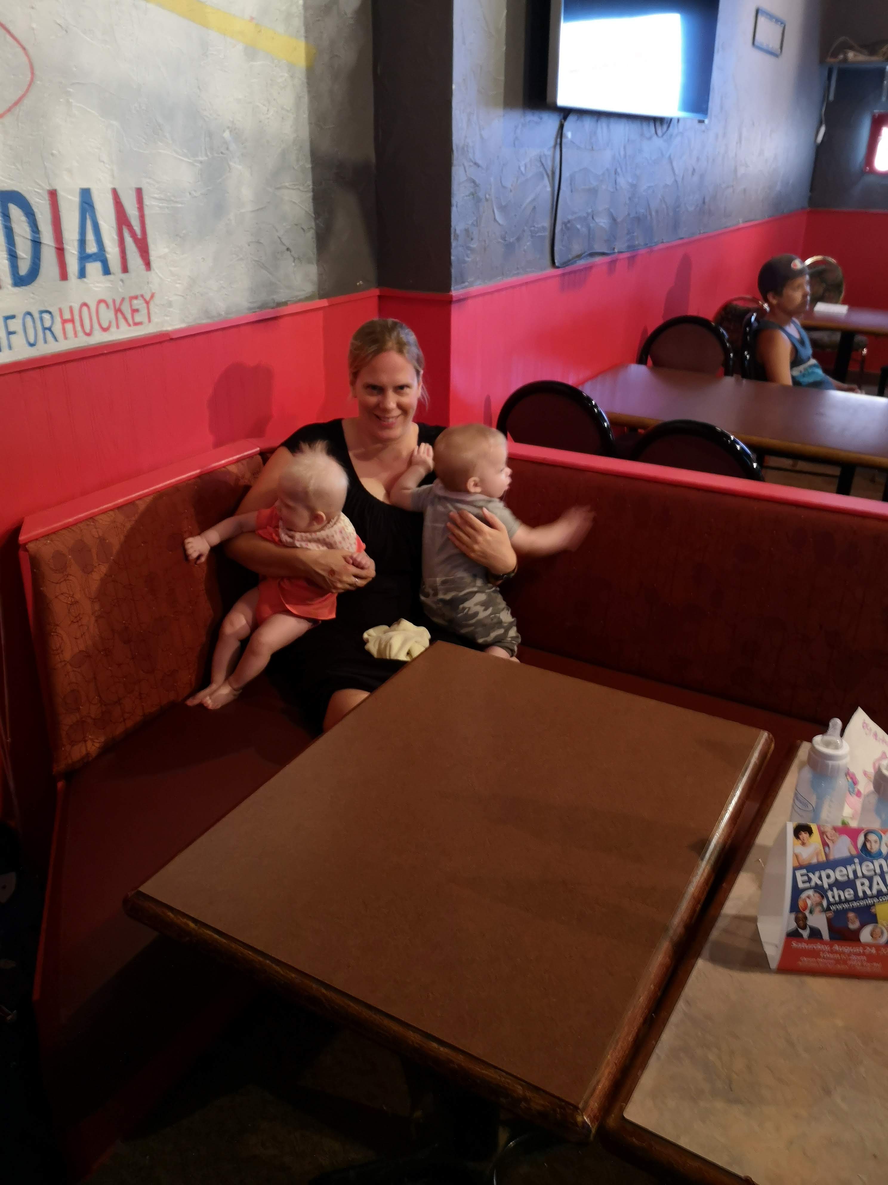 Now that the babies are sitting up and moving, they are spending less time in the exersaucers and stroller because they want to be free to roam. It makes for happier babies generally, but they also manage to get themselves into interesting situations as well. with one baby kicking the other one in the head or stealing a toy or stuck under furniture. Bathtime is more entertaining too as the babies start to really splash and play while sitting up in the tub or sometimes in the stand-up shower too. Isaac has really taken to entertaining the babies, who are infatuated with him and giggle non-stop at his antics. He seems to be enjoying them even more now that they interact with him. With the weather being a bit cooler, it is more appealing to try to take the babies outside – however we are now also on more of a schedule with two long naps a day so it can be a struggle to get out in between feedings and naps. But hey, with nights still a crap-shoot for sleep, we’ll take the sleep when we can get it! Although we may have finally figured out how to feed Asher enough so that he sleeps better, so we might be headed for some better nights. We were back to sleepless nights after the August long weekend at the cottage, in which all three kids were waking up more than once a night at separate times of course. Then we moved into the “should have been a good night”, when on an individual basis, each kid slept well, but combined meant we were still up 4 times a night. Fingers crossed that we can get it down to once or twice a night on a regular basis!