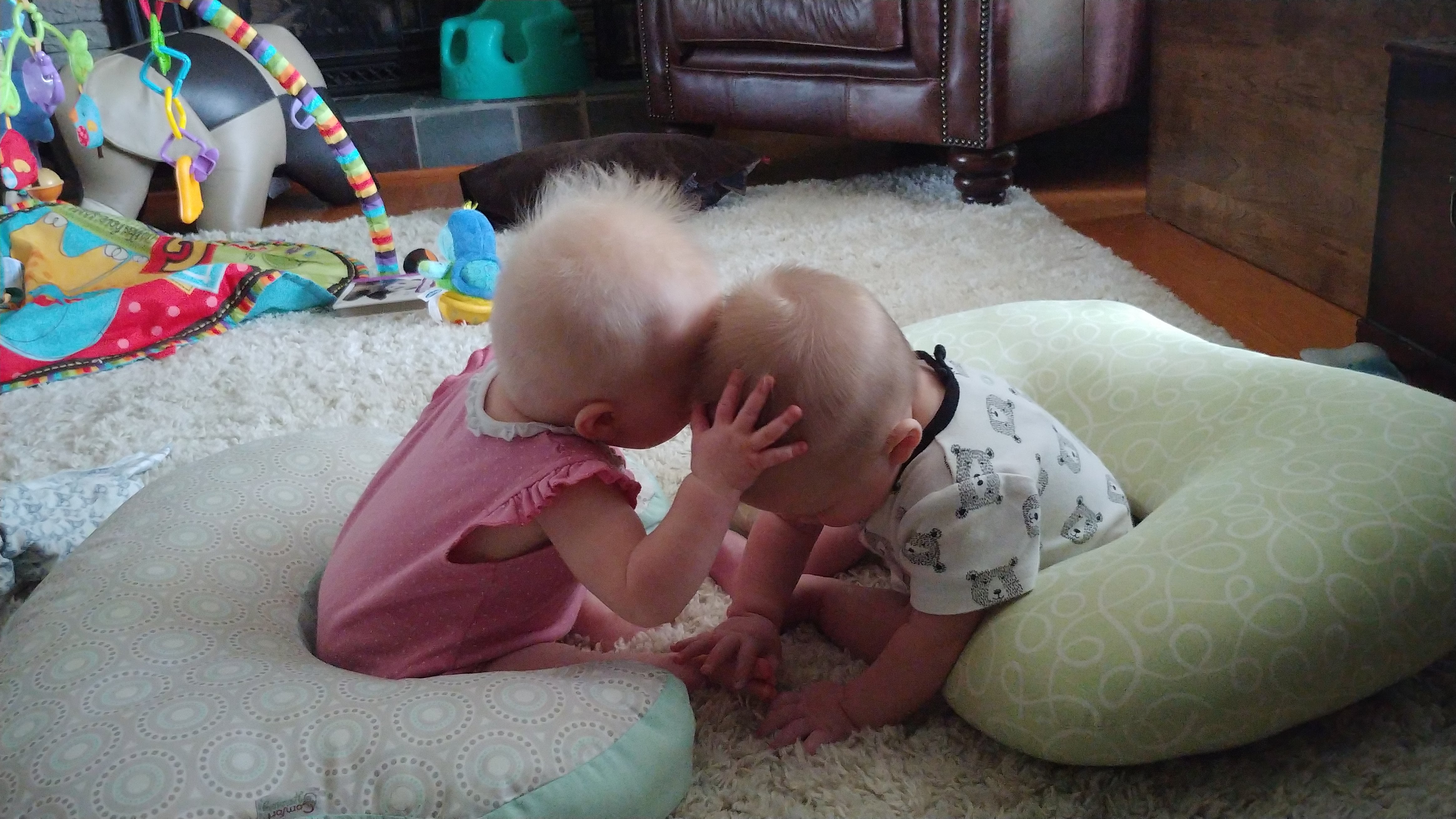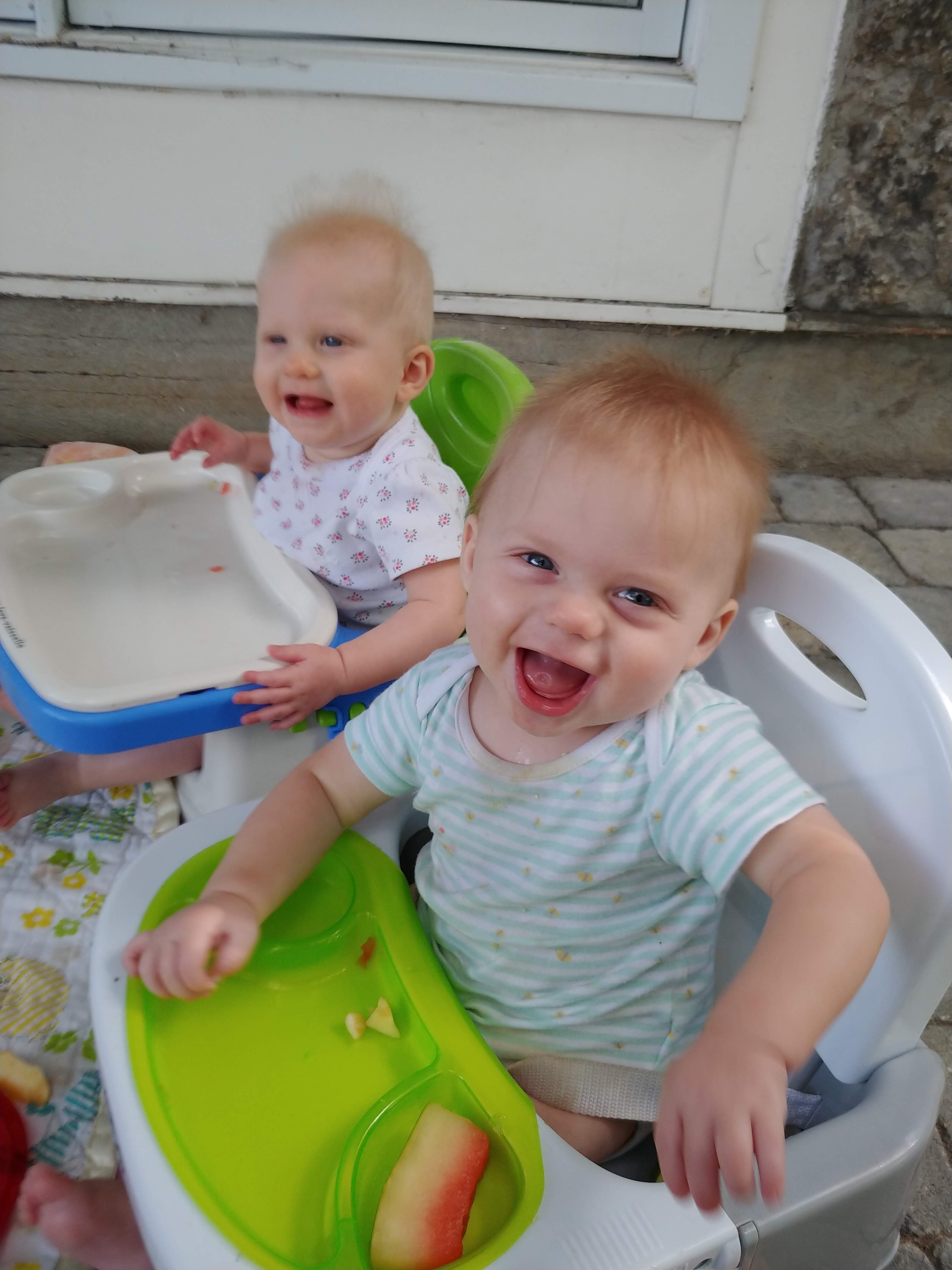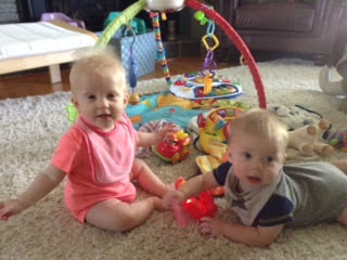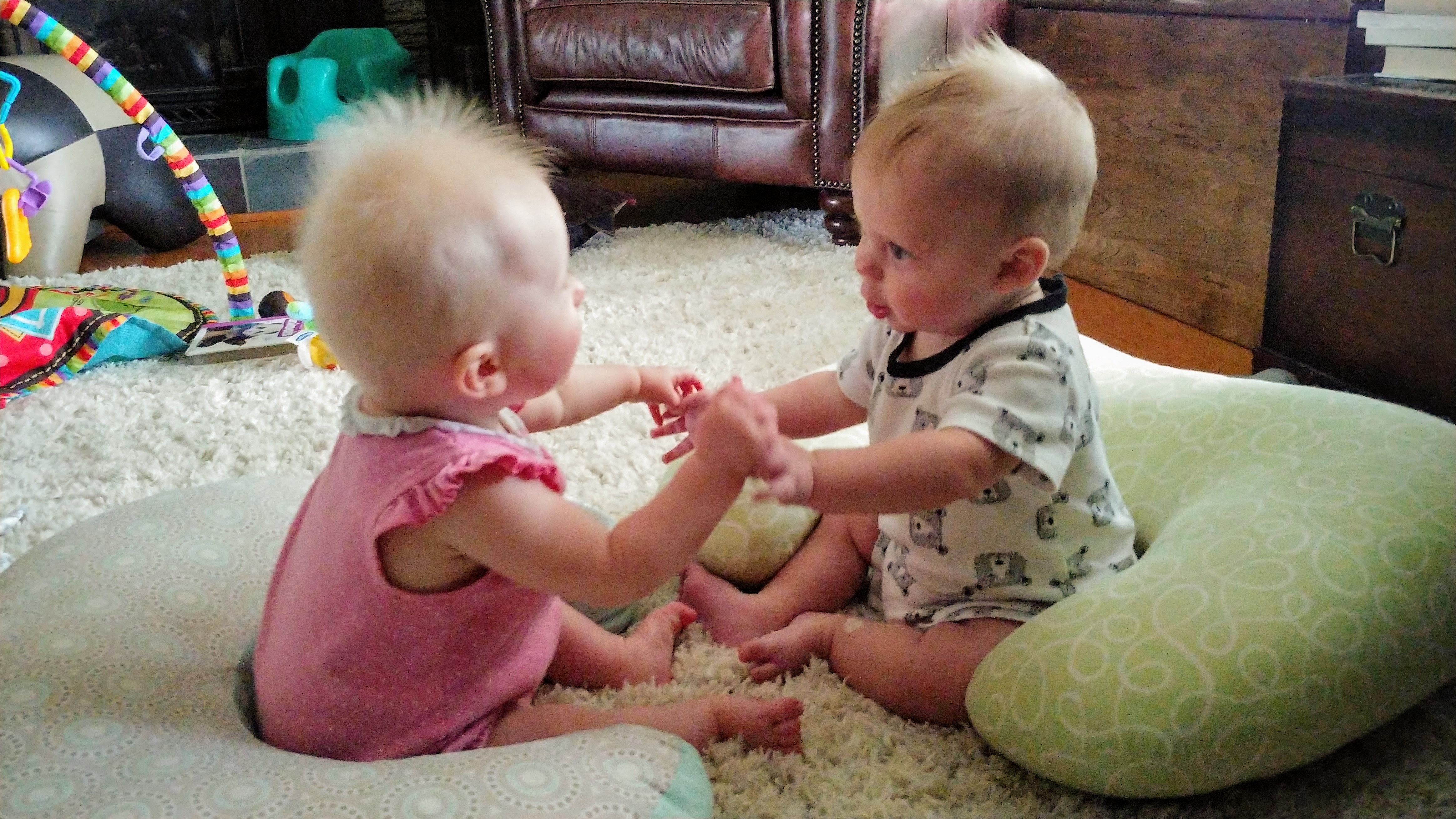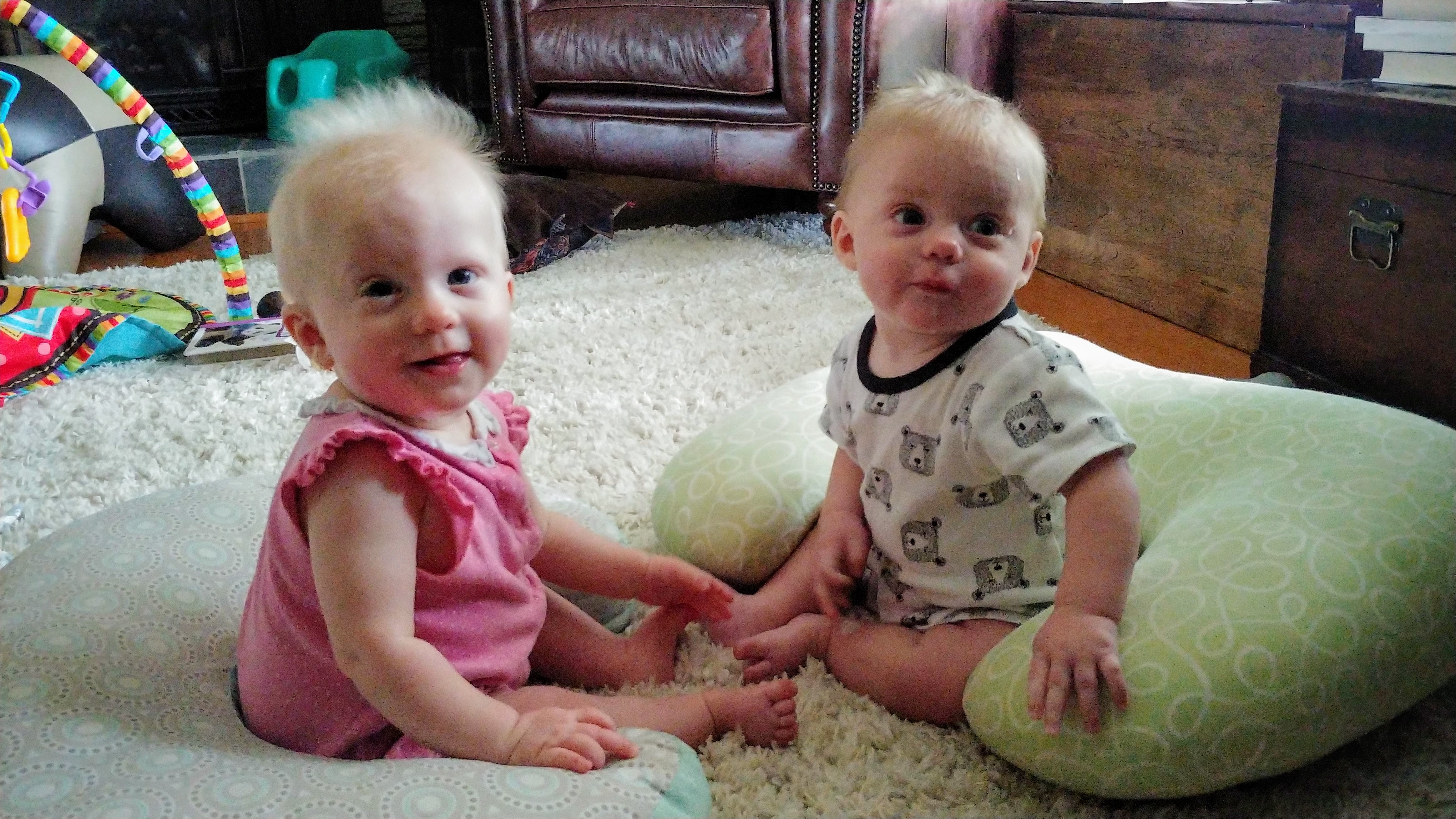 Things are about to get busy around here, as Asher and Cadence start exploring! The babies are 7 months today, and Asher is crawling and starting to pull himself up and cruise, while Cadence isn’t far behind! She has begun going forward as well as backward, and they both love to be walked around holding onto our hands.