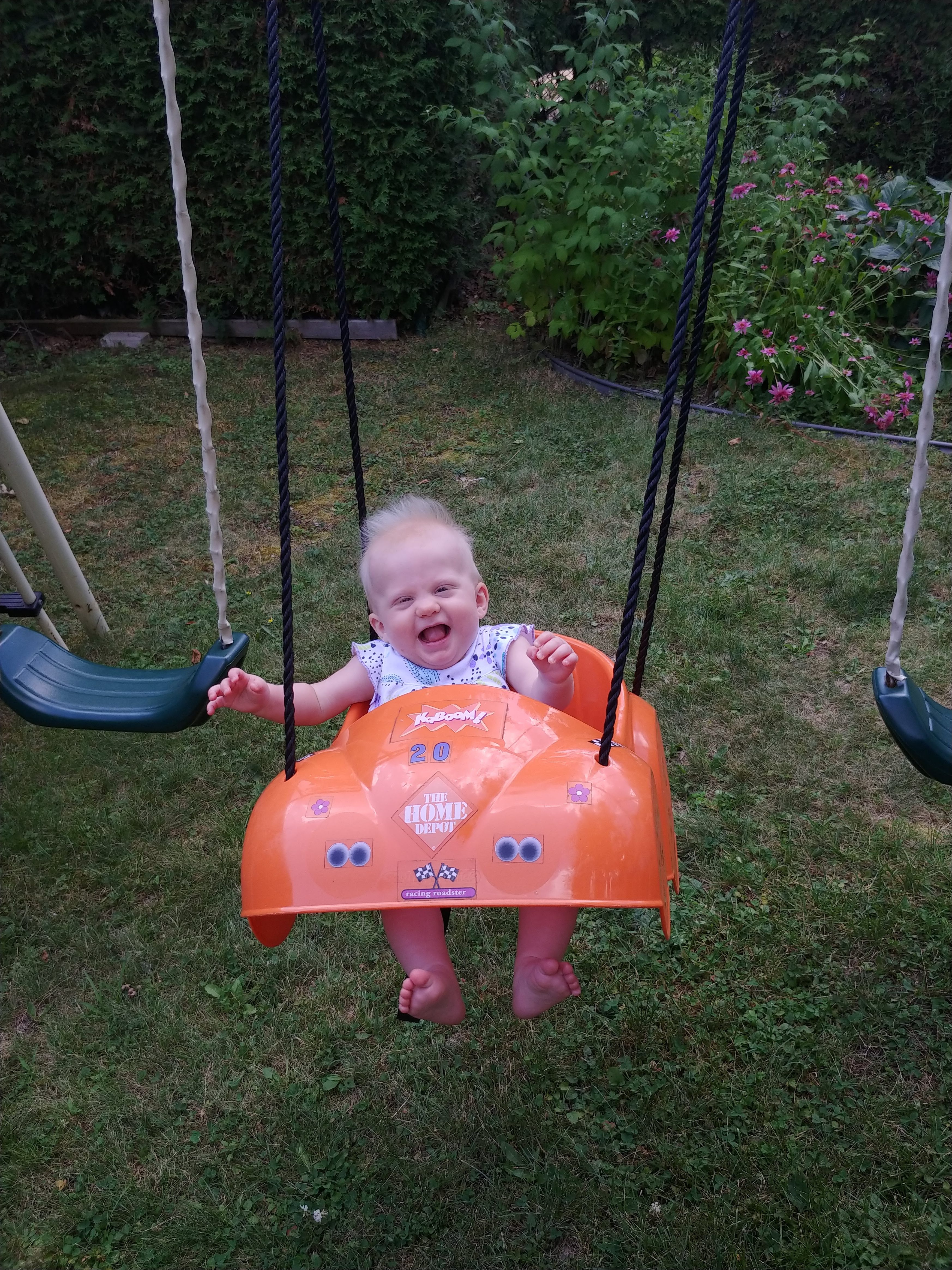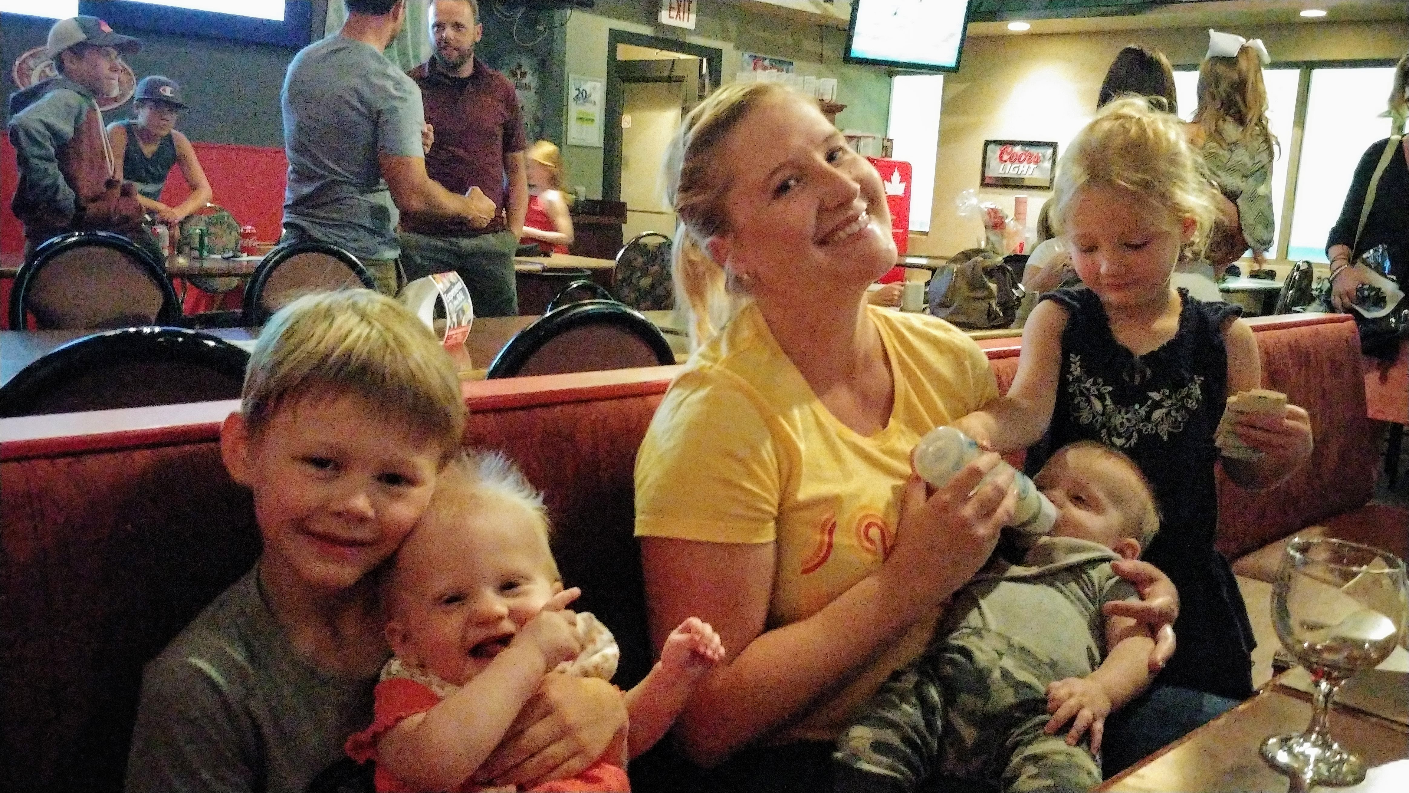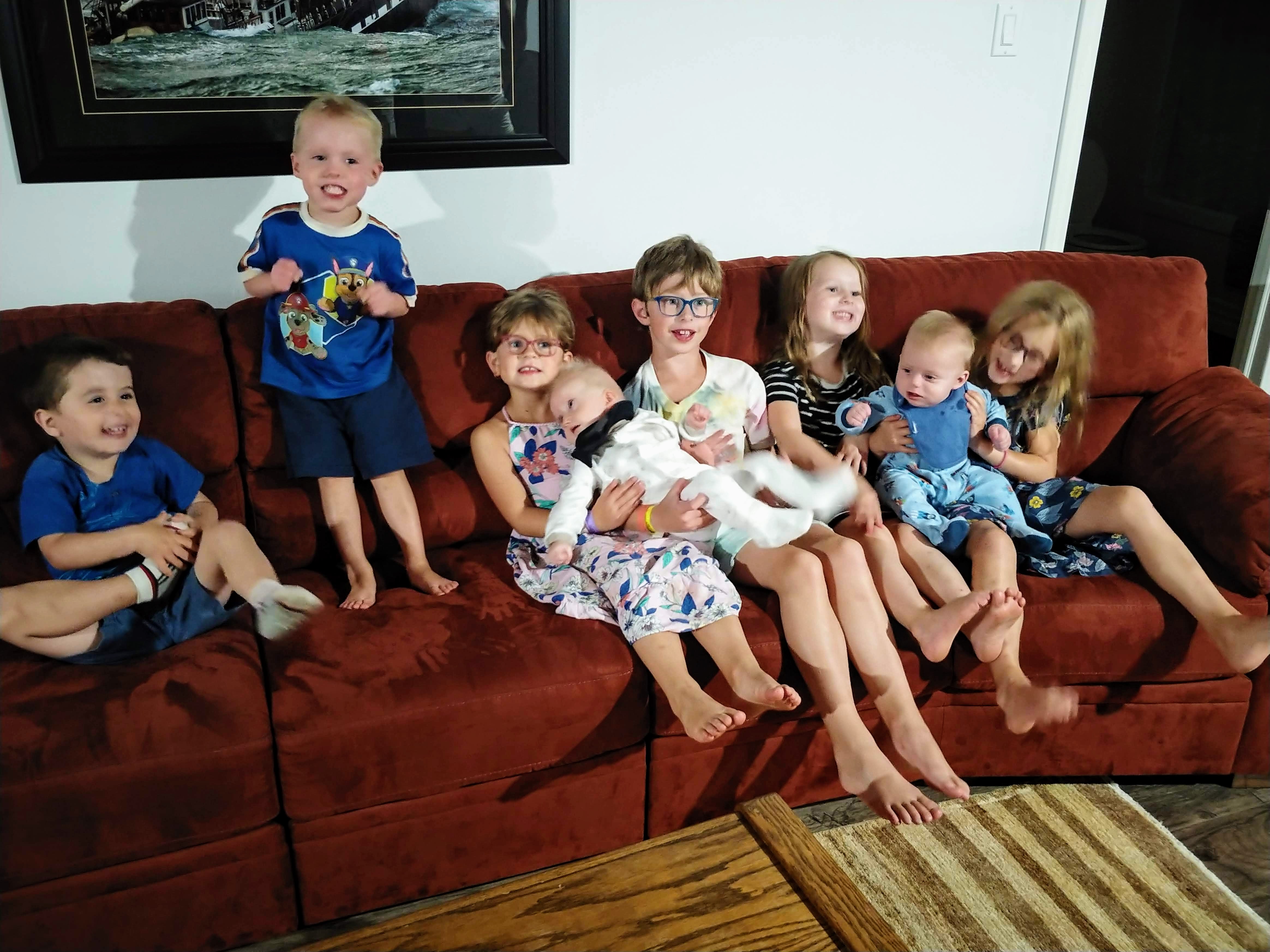 At their 6 month check up, Cadence was 14lbs 13oz and Asher was 15lbs 6oz. Asher is slightly longer as well, with a bigger head. Isaac is now only barely twice their weight, with his most recent weight being 29lbs – but he seems to be growing too! Everyone is moving up in clothing size, and so we are constantly sifting through our (fortunate) donations of clothing. Isaac is constantly showing us how tall he is (“Look how tall I am!” holding his arms up in the air), as well as how far or high he can jump. All 3 kids are eating well these days, and dinner time rotates between fun meals outside and overwhelmingly loud scream fests inside. No teeth yet, but the babies seem to have been teething for months! We are still extremely grateful for the dinner/bed time help we receive from the grandparents! We are also lucky to get more time this fall with Glenna too, now that she is available another day a week 🙂