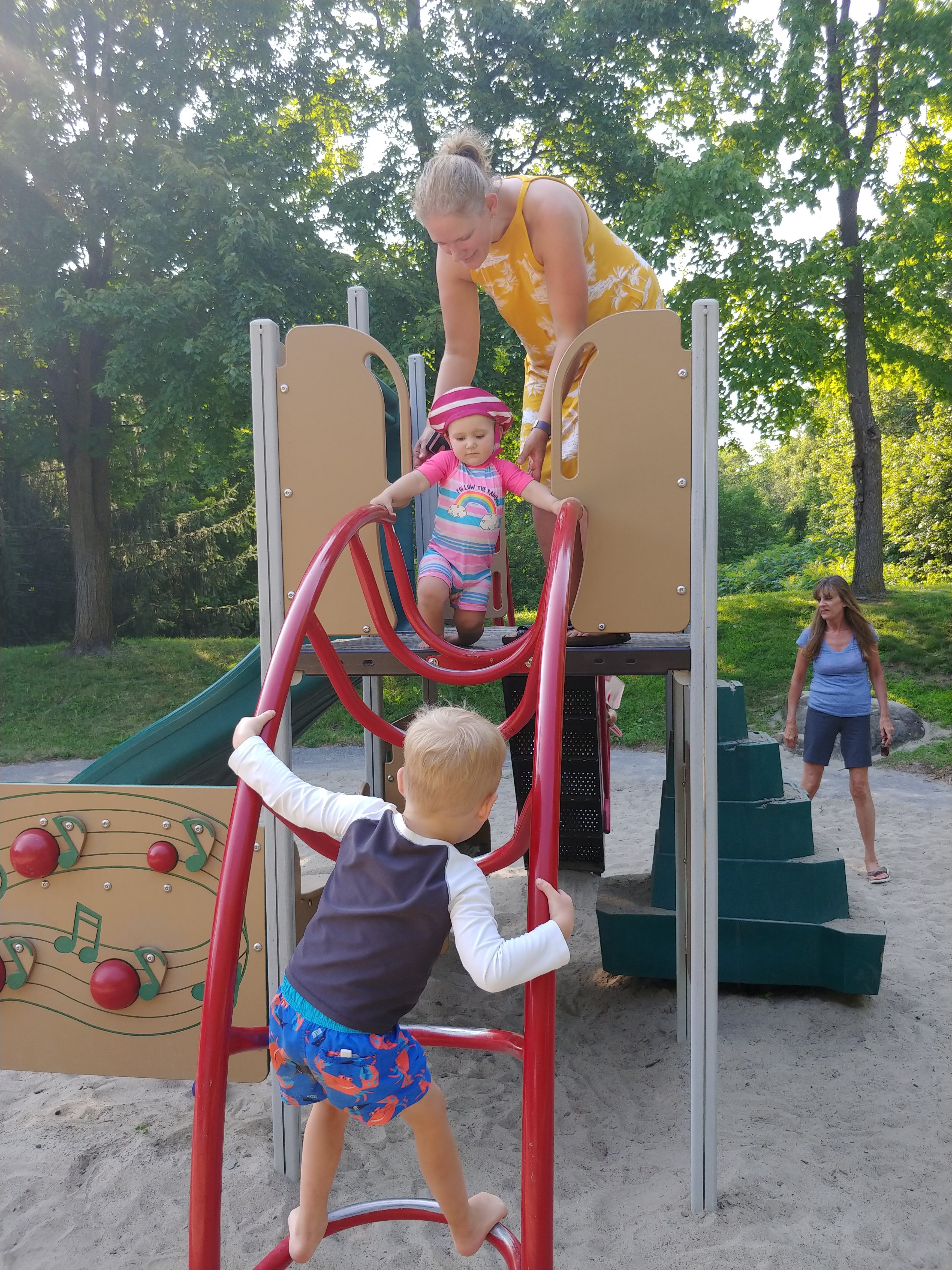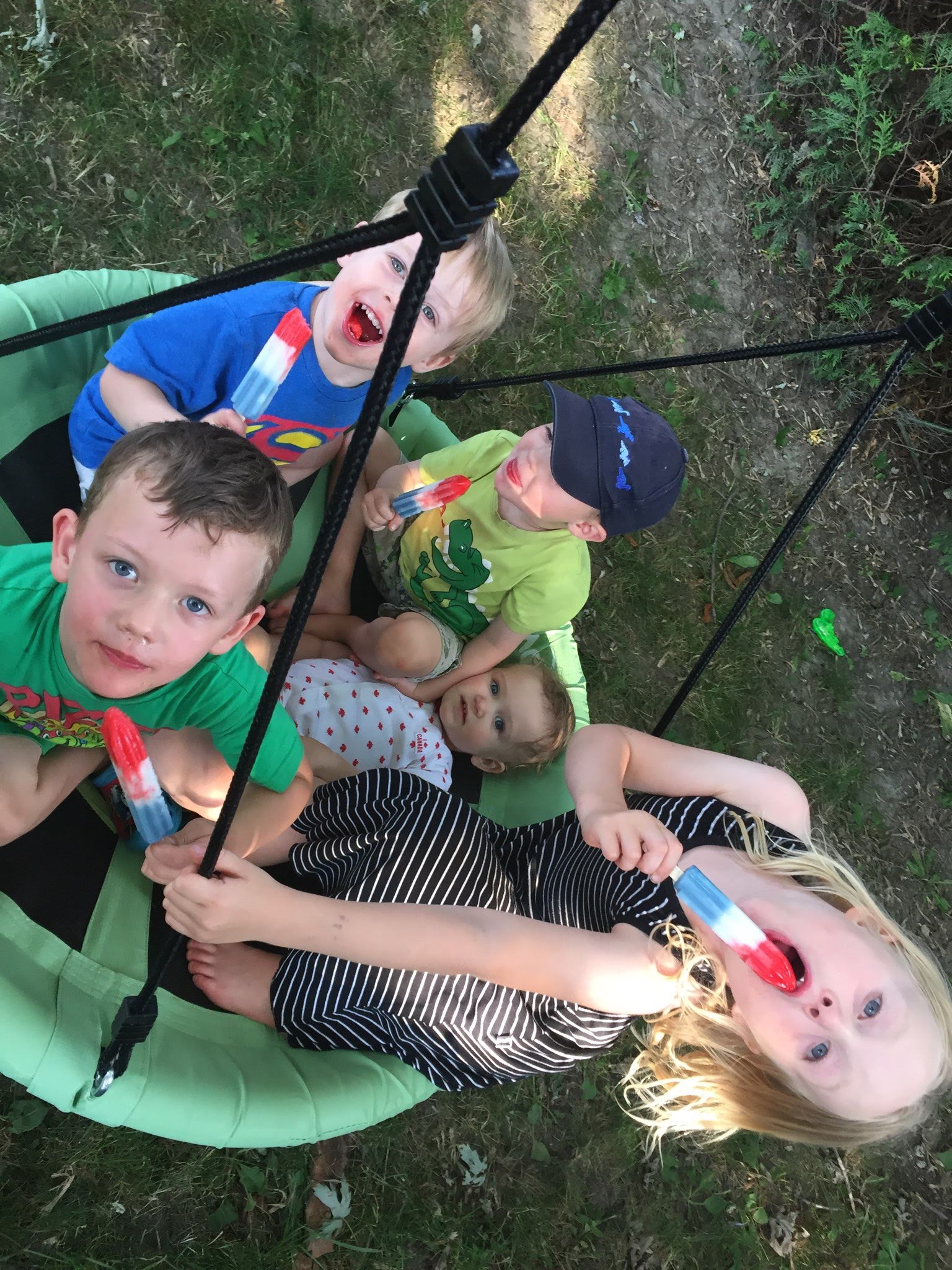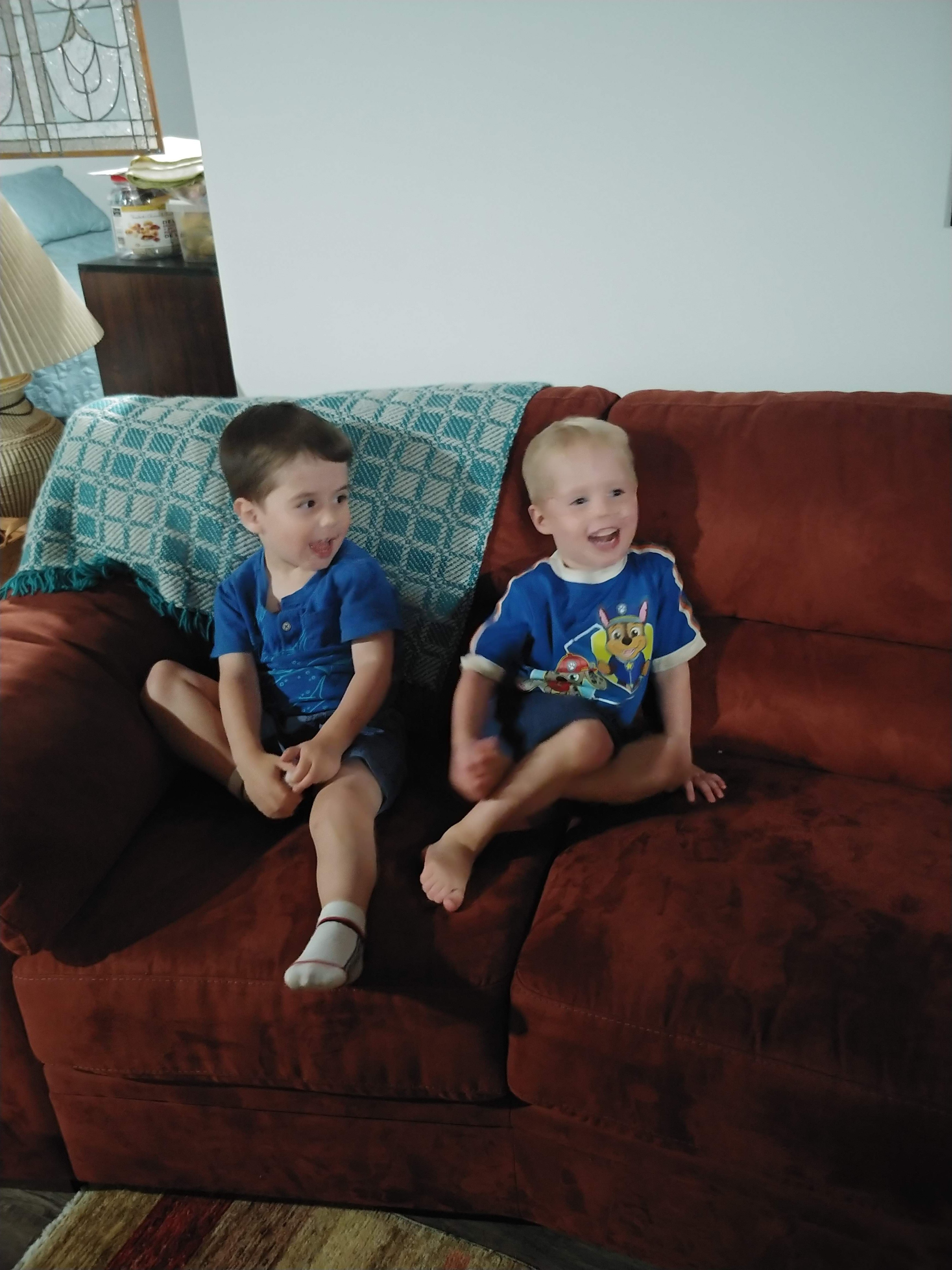At their 6 month check up, Cadence was 14lbs 13oz and Asher was 15lbs 6oz. Asher is slightly longer as well, with a bigger head. Isaac is now only barely twice their weight, with his most recent weight being 29lbs – but he seems to be growing too! Everyone is moving up in clothing size, and so we are constantly sifting through our (fortunate) donations of clothing. Isaac is constantly showing us how tall he is (“Look how tall I am!” holding his arms up in the air), as well as how far or high he can jump. All 3 kids are eating well these days, and dinner time rotates between fun meals outside and overwhelmingly loud scream fests inside. No teeth yet, but the babies seem to have been teething for months! We are still extremely grateful for the dinner/bed time help we receive from the grandparents! We are also lucky to get more time this fall with Glenna too, now that she is available another day a week 🙂