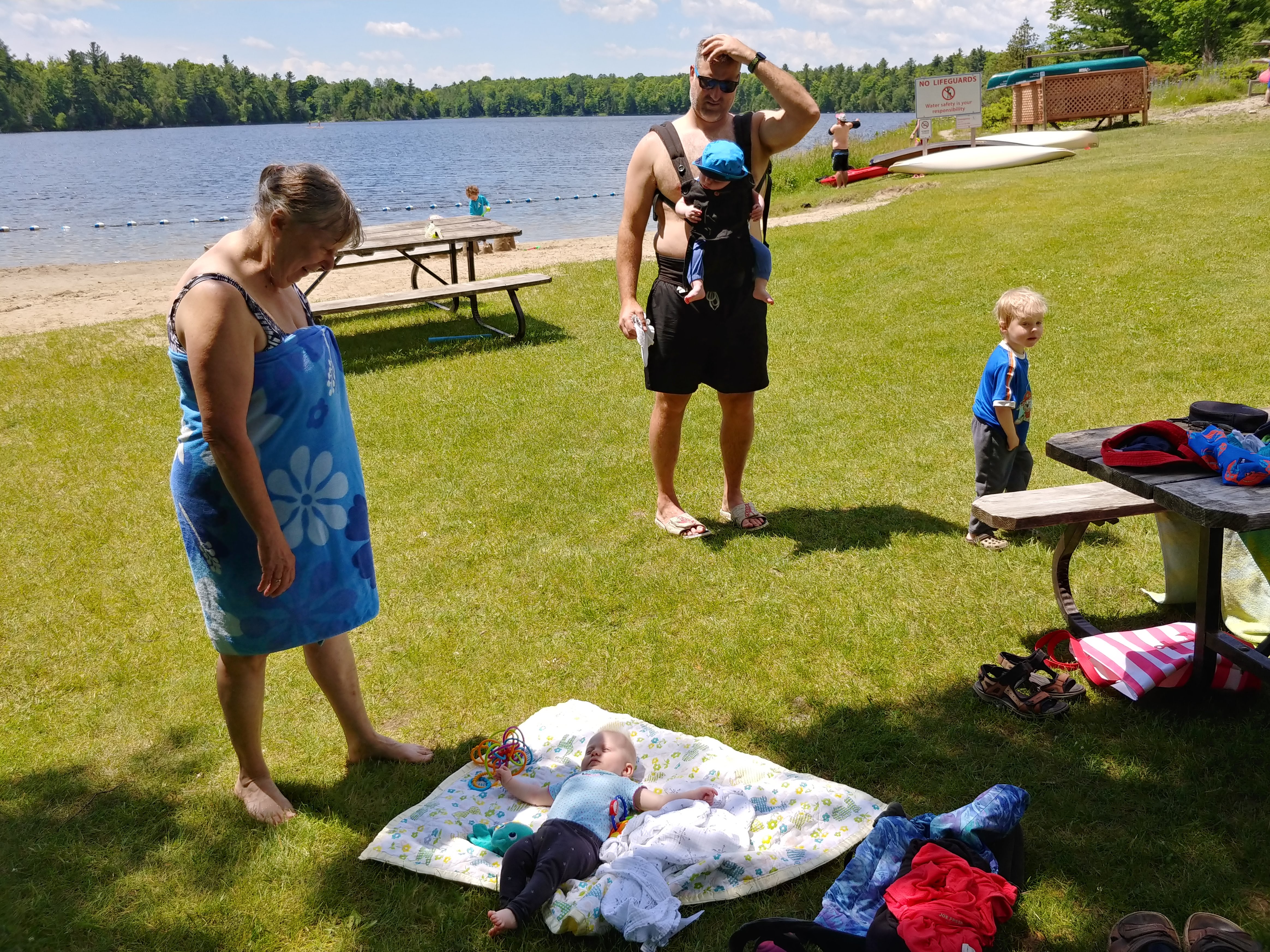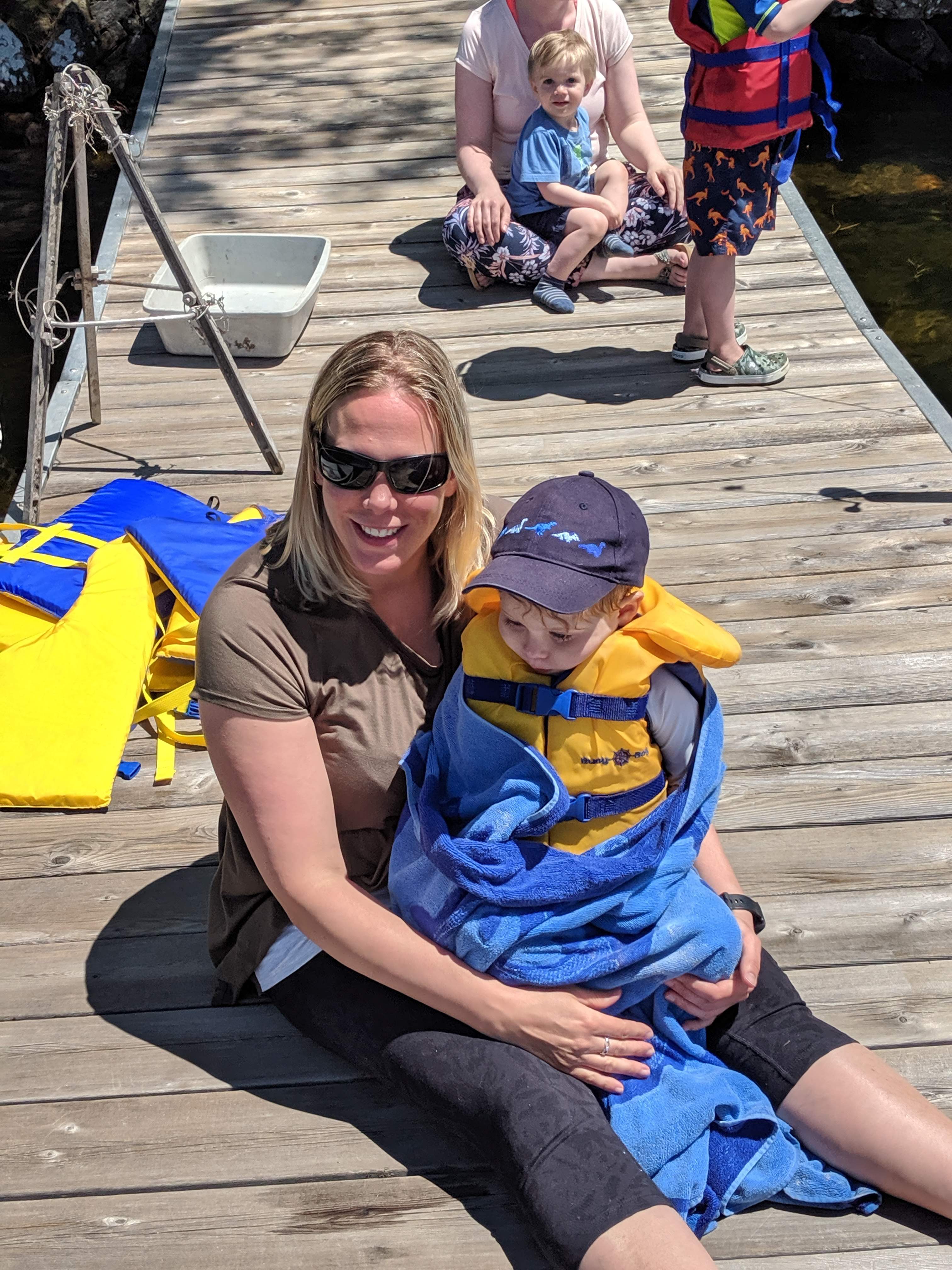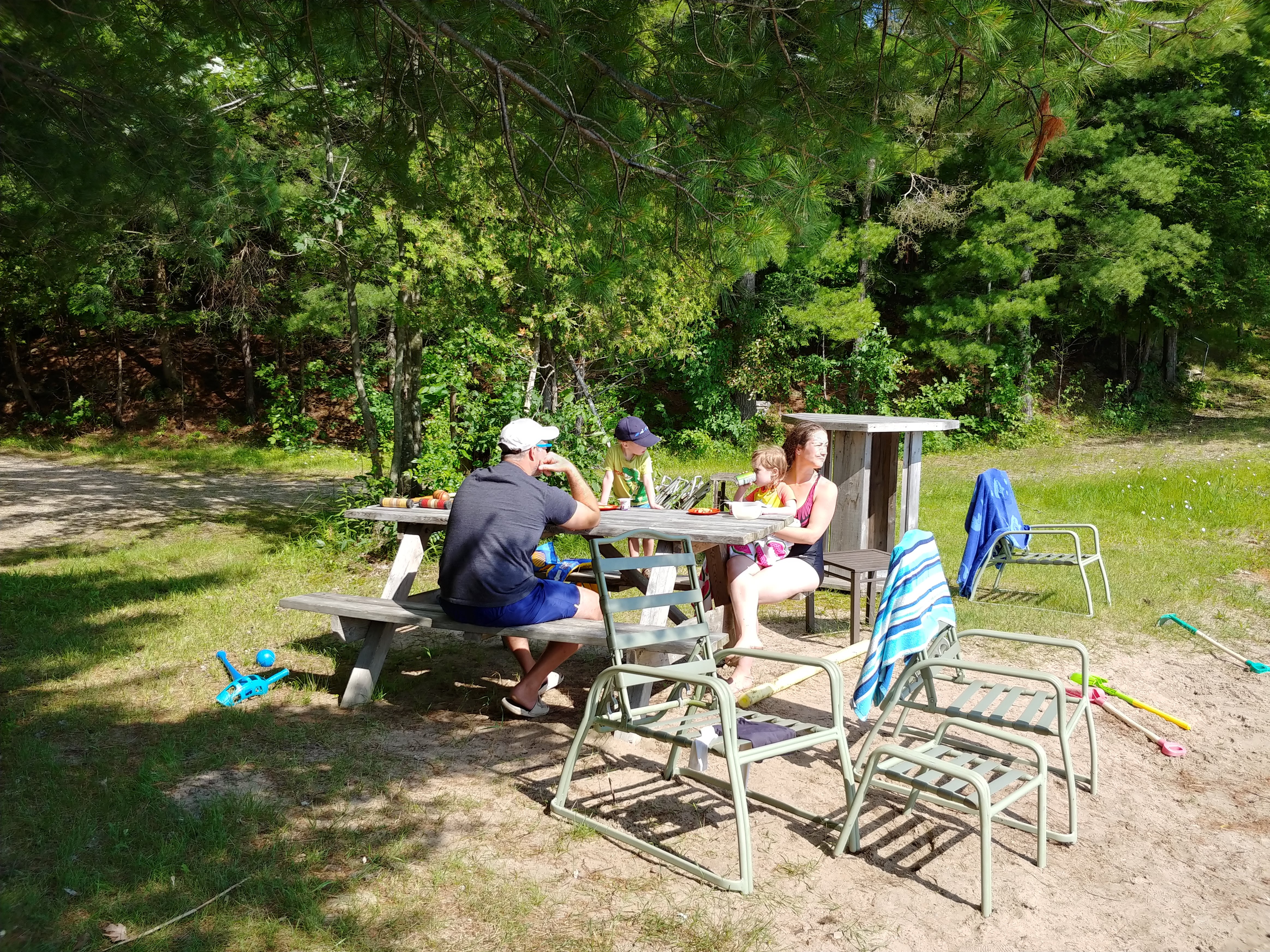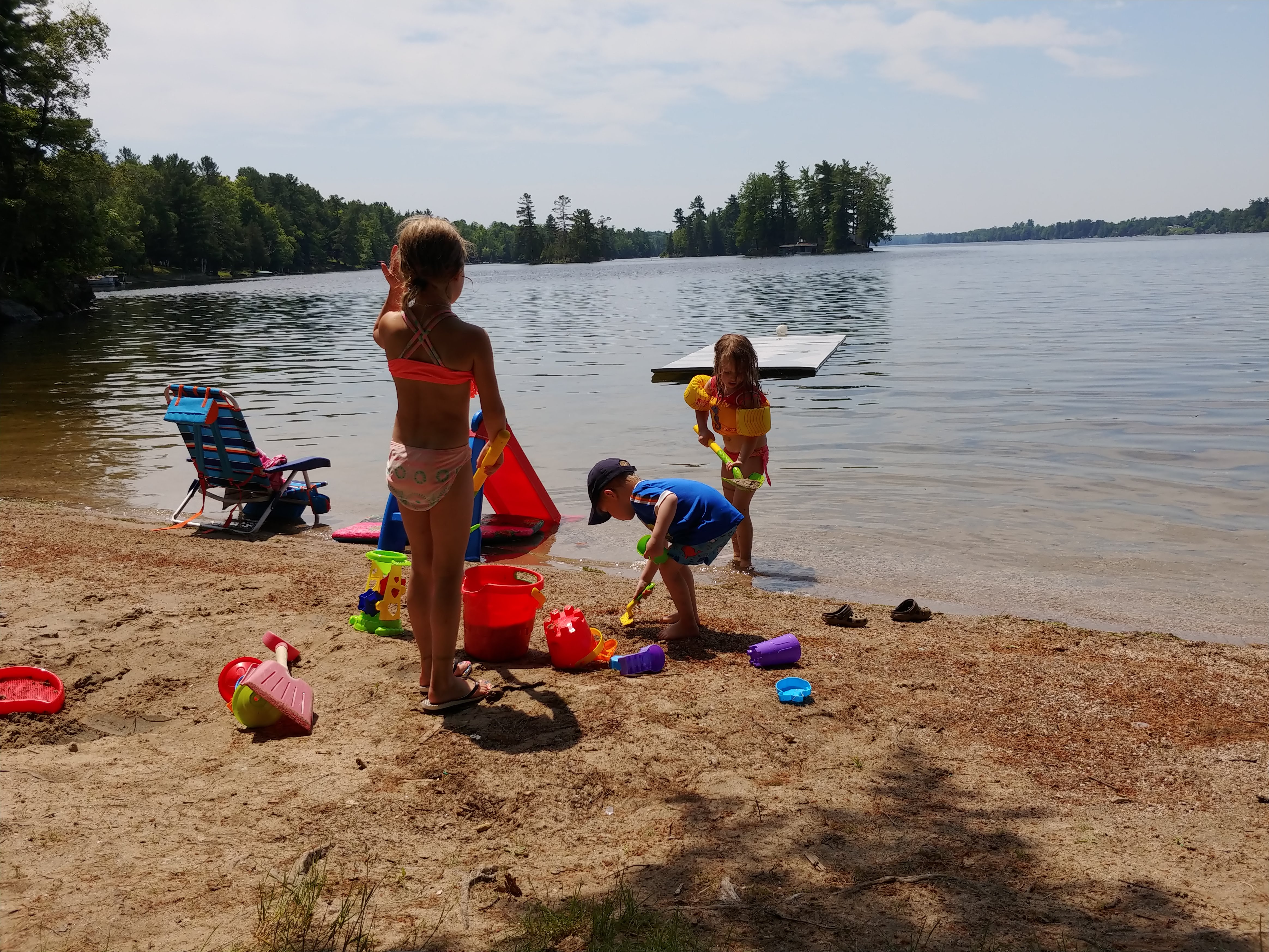 The water was still fresh at the beginning of our stay, but warmed up to bath water by the end. Isaac spent a good portion of each day in the water, often starting with a 7am swim. Cadence and Asher tested the water but it was still too cold for their liking for more than a minute, so they mostly just hung out on the beach. Although we were on holidays, having 3 kids means still having to do the everyday things like laundry and bottle prep etc, so Lindy spent more time inside than the usual cottage holiday – but at least with a better view than at home 🙂