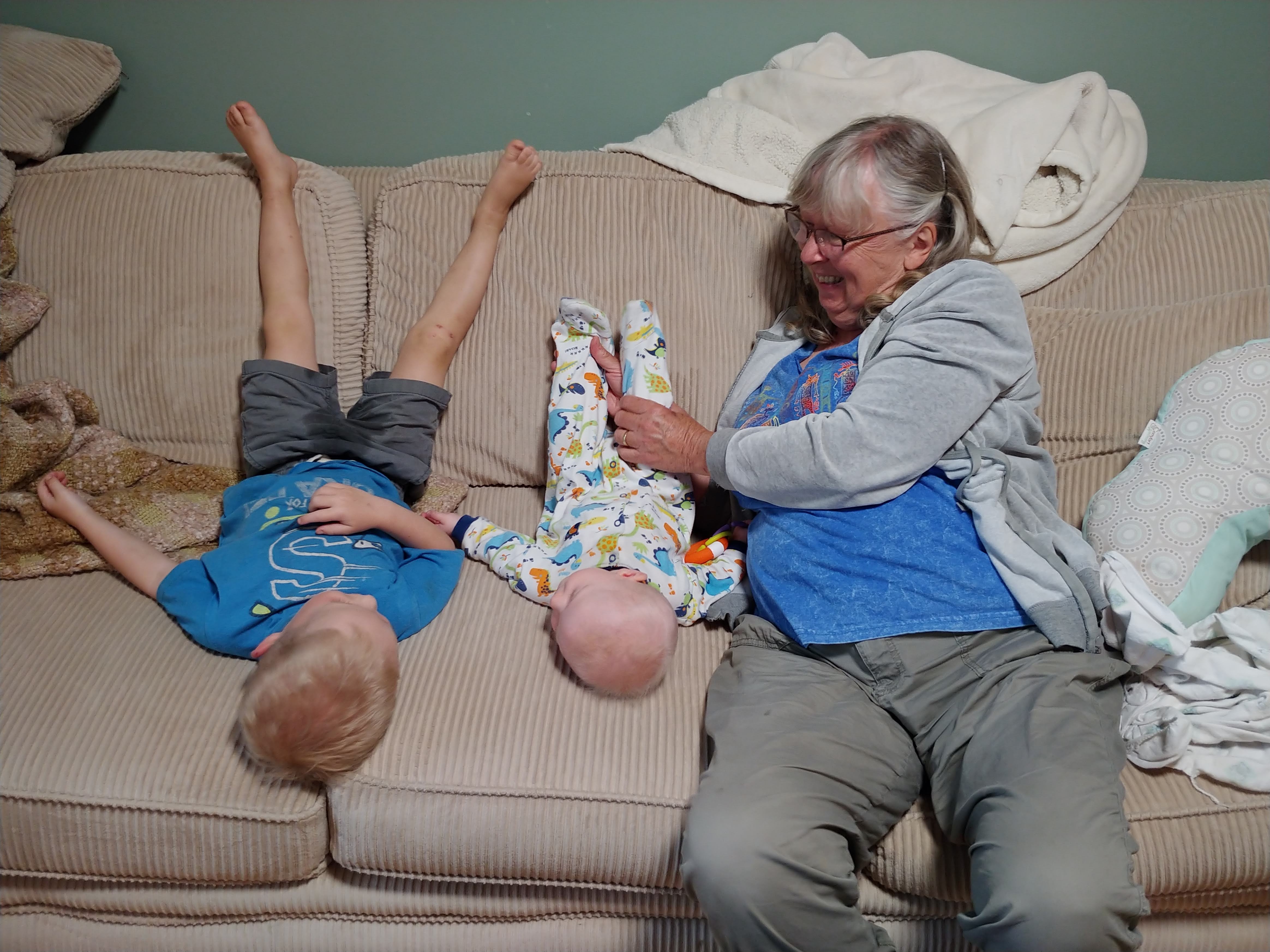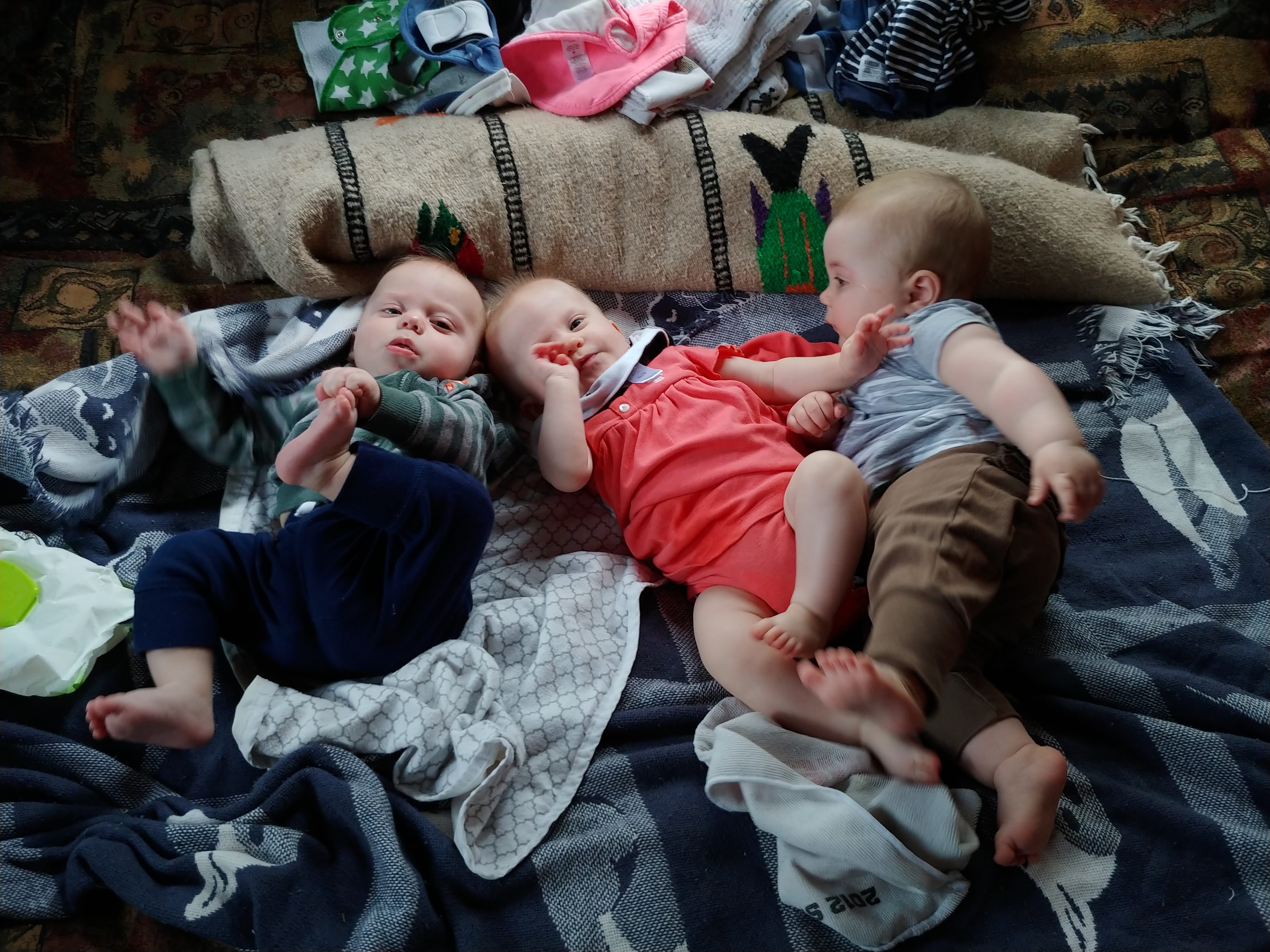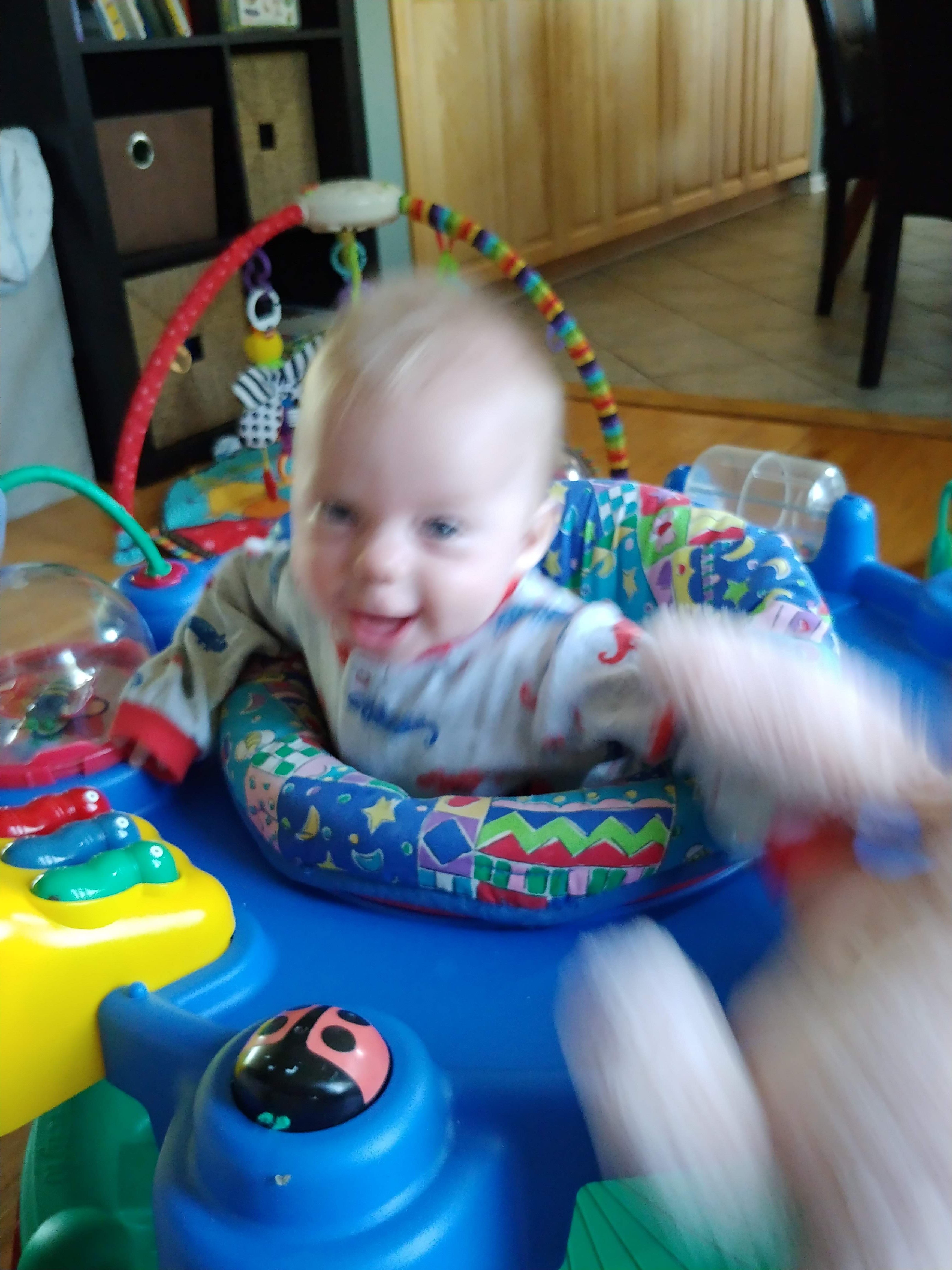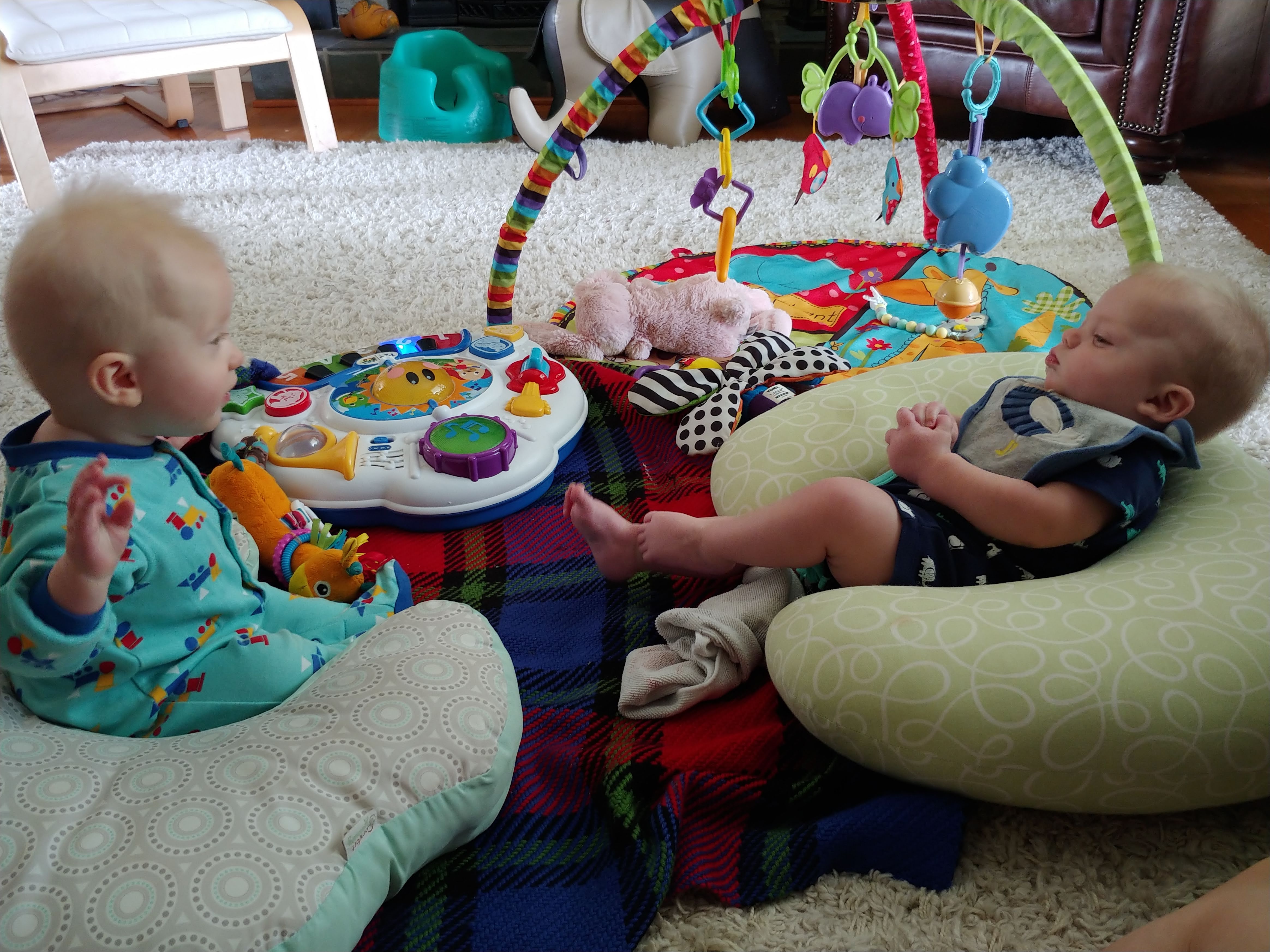The babies are sitting up on their own and moving around. Asher can cover some ground now, although very slowly and in an unconventional way. He is also starting to walk when holding onto someone’s hands, instinctively putting one foot in front of the other. We’ve started giving them some food too, and they sit with us at the table in their highchairs. They both chatter-scream quite a bit now, and Jon and Lindy are having a hard time with the noise of three shouting kids at dinnertime.