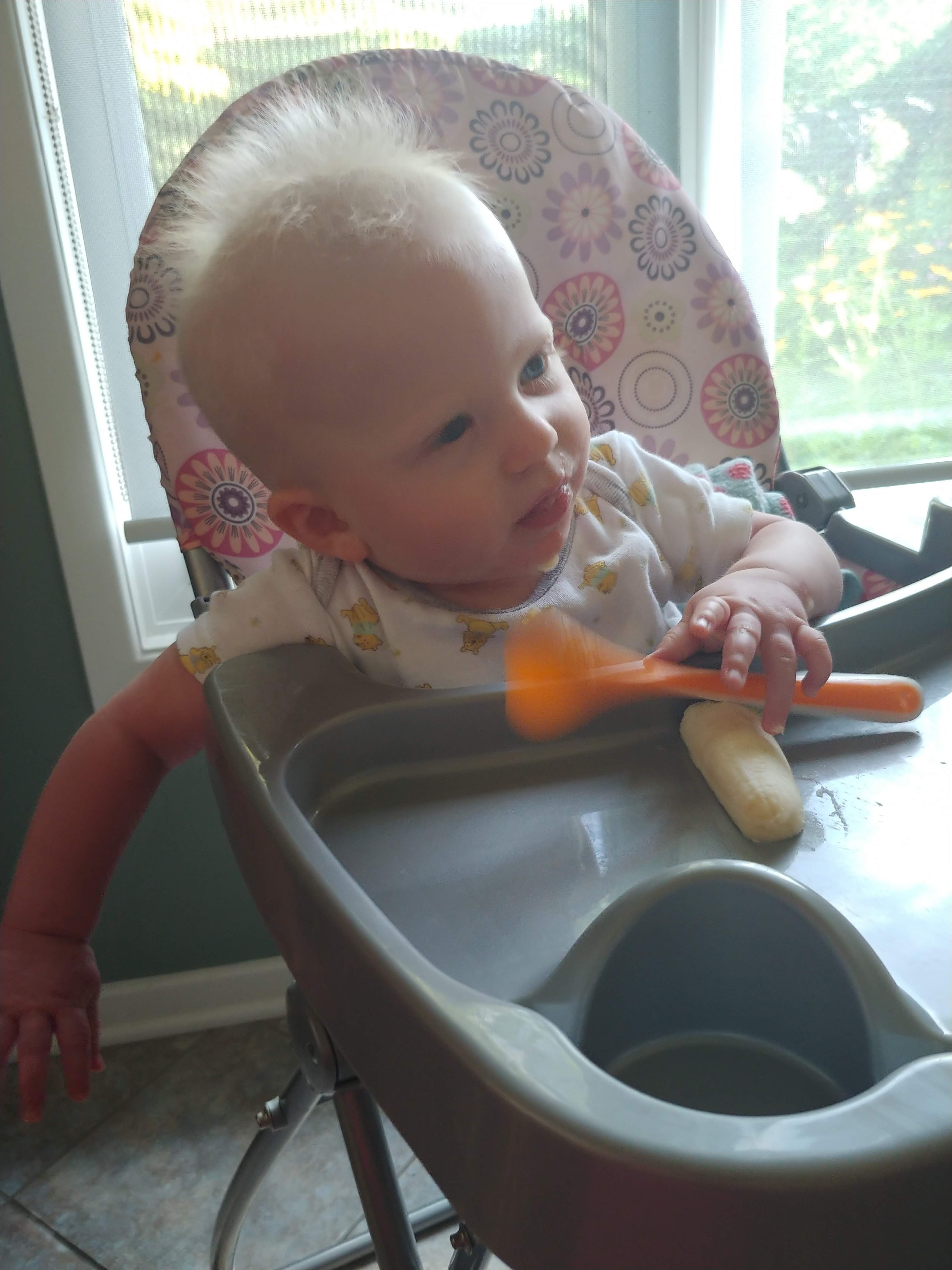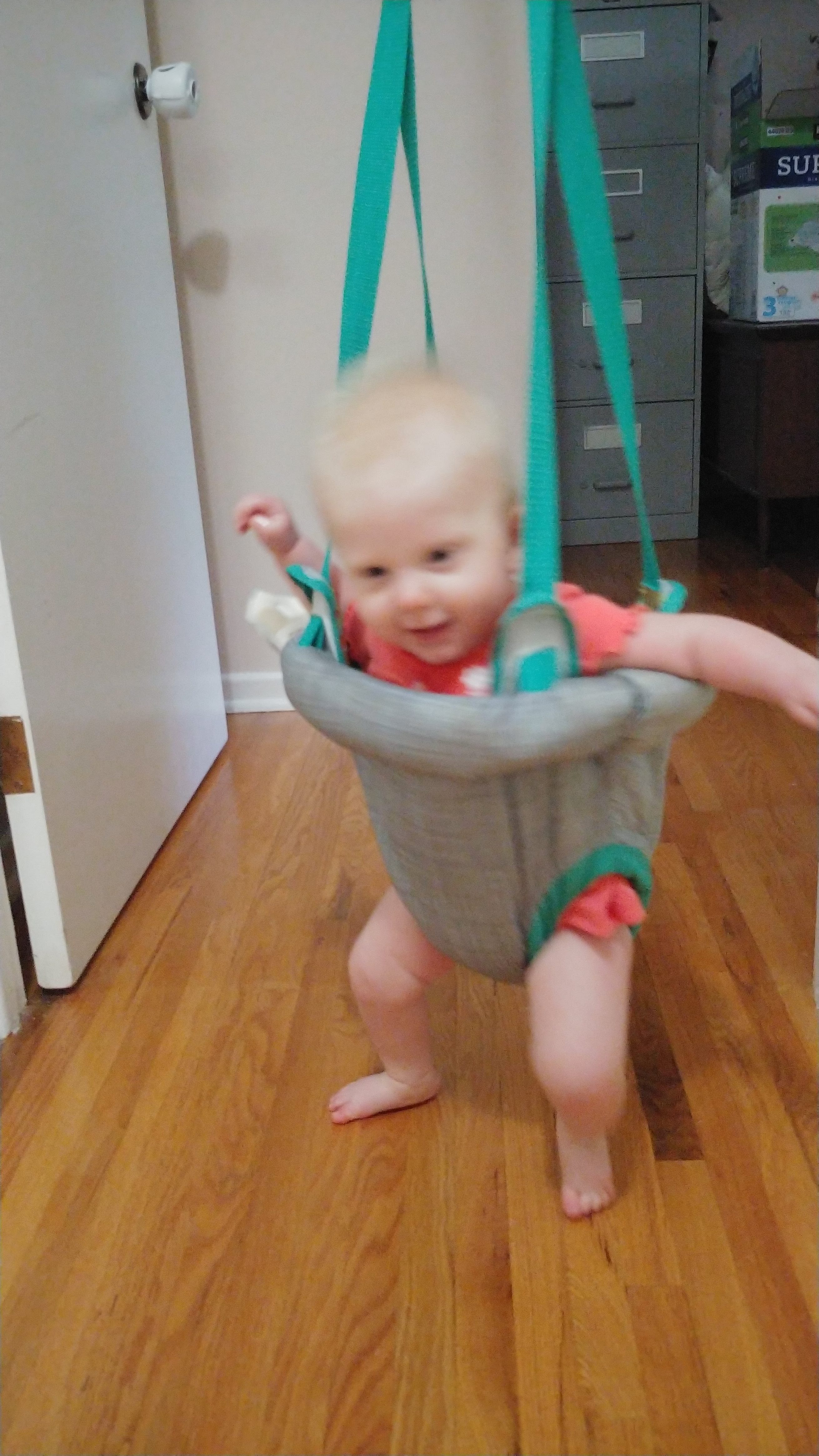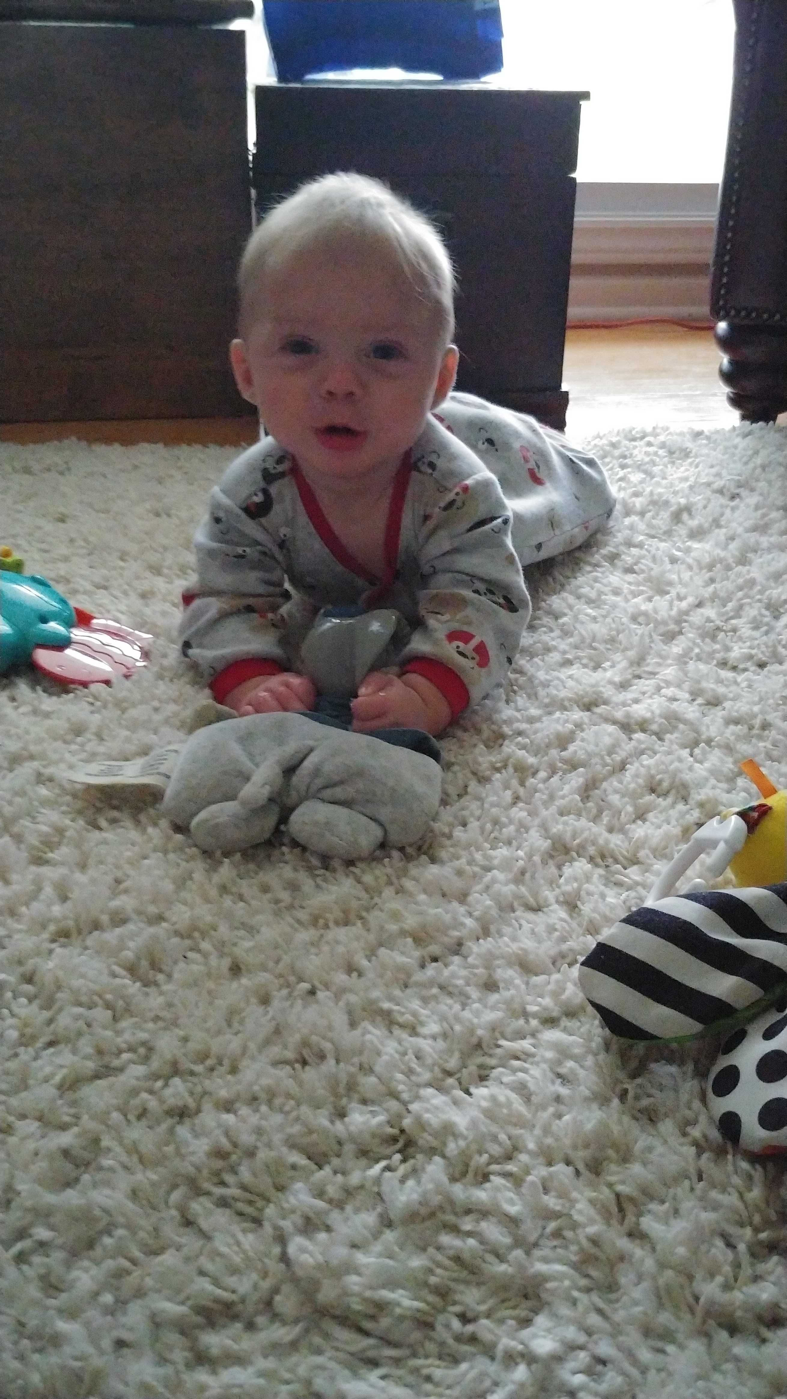 The babies are sitting up on their own and moving around. Asher can cover some ground now, although very slowly and in an unconventional way. He is also starting to walk when holding onto someone’s hands, instinctively putting one foot in front of the other. We’ve started giving them some food too, and they sit with us at the table in their highchairs. They both chatter-scream quite a bit now, and Jon and Lindy are having a hard time with the noise of three shouting kids at dinnertime.