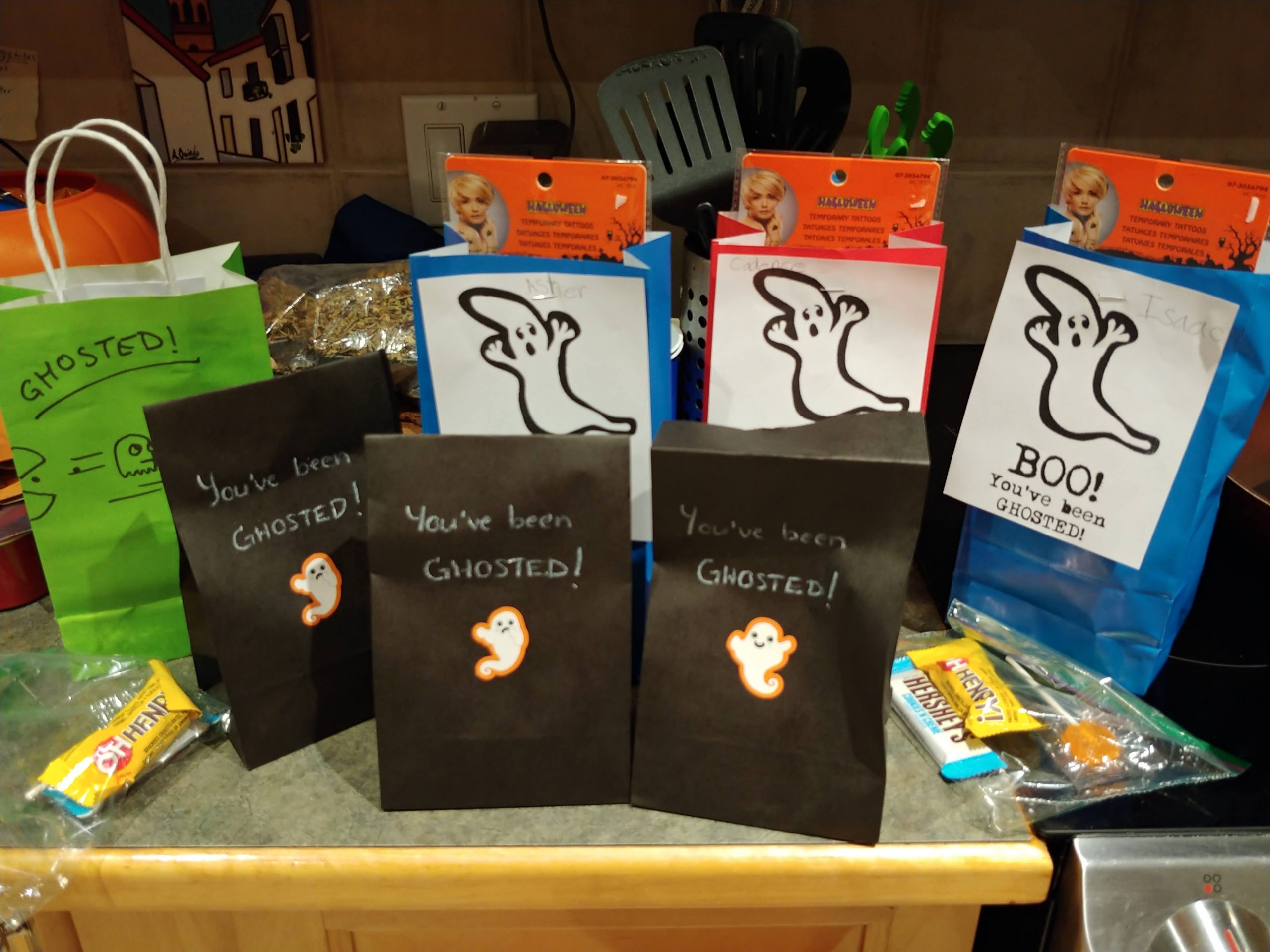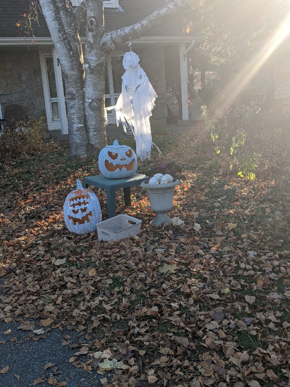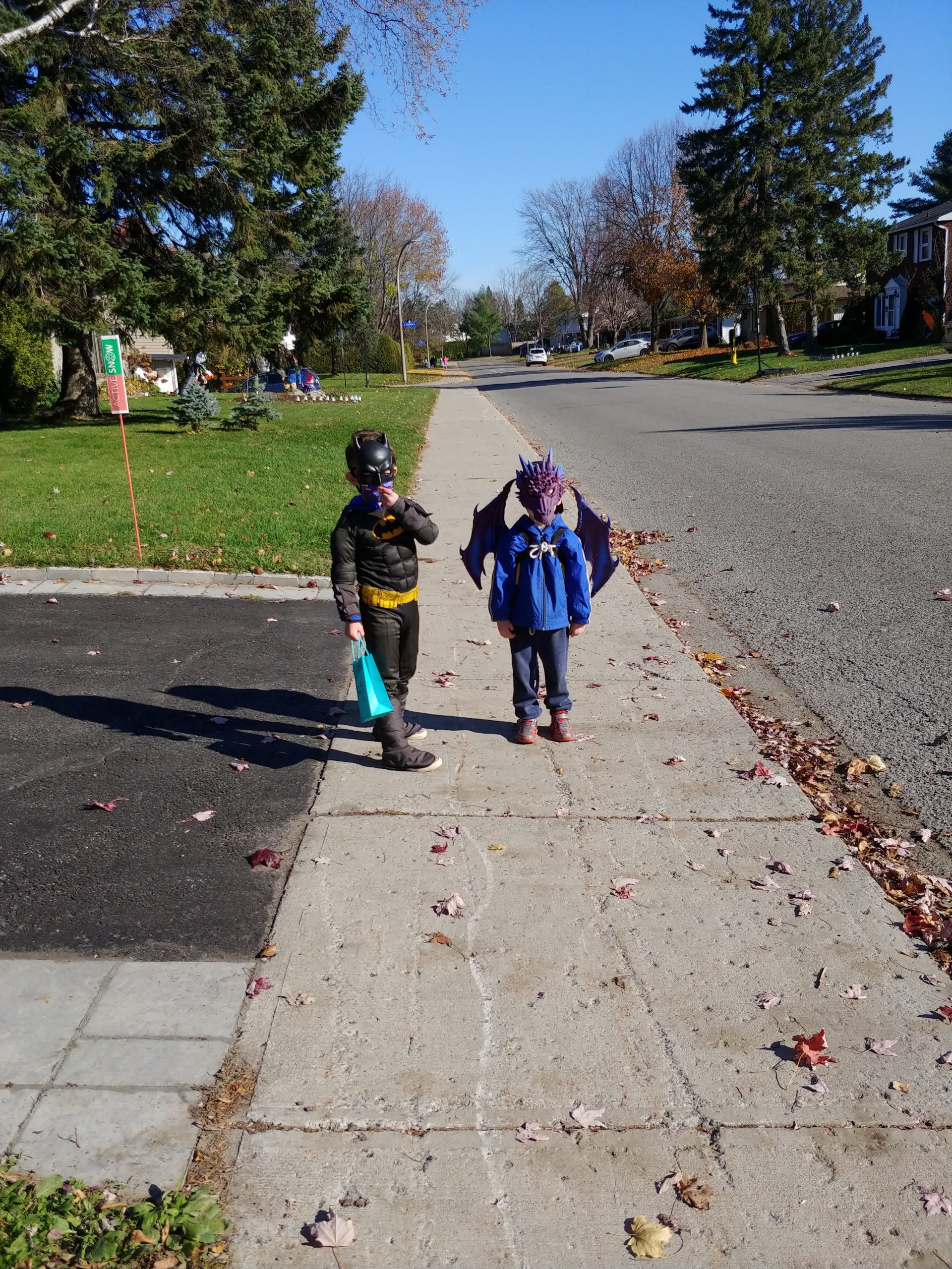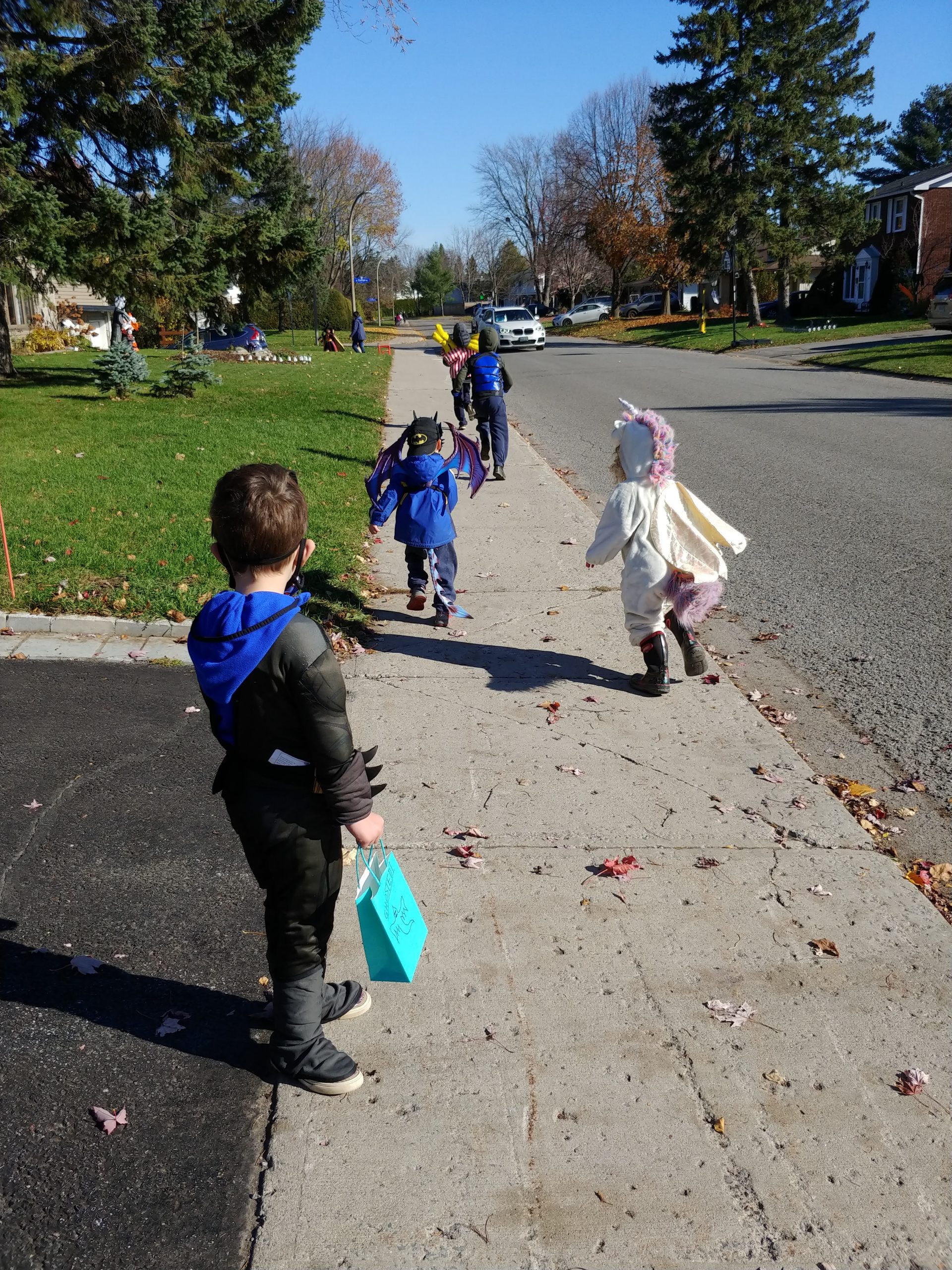 We have such great neighbours! When Halloween Trick or Treating was officially cancelled, we started receiving ghost packages at the door from anonymous friends. “Boo -You’ve been ghosted!!” Of course the kids loved ghosting other kids too, and helped put the individualized packages together and going out in the dark evening to drop them off at people’s front doors. This of course dragged Halloween on for over a week.,, Then our neighbourhood association put together a scavenger hunt from all the yard decorations and planned a walk around the neighbourhood on Halloween as a sort of unorganized costume parade. And of course people started putting candy out at the bottom of their driveway (all wrapped individually again) and it turned into Trick or Treating! We ended up with more candy than normal after a week of ghosting as well… The adults all agreed that the afternoon stroll was the perfect way to celebrate, although very contrary to the intentions of cancelling Halloween, it was still socially distant and a beautiful day for a walk! We even had surprise trick or treaters to our house when Opa and Oma appeared in costume (well Oma anyway!)