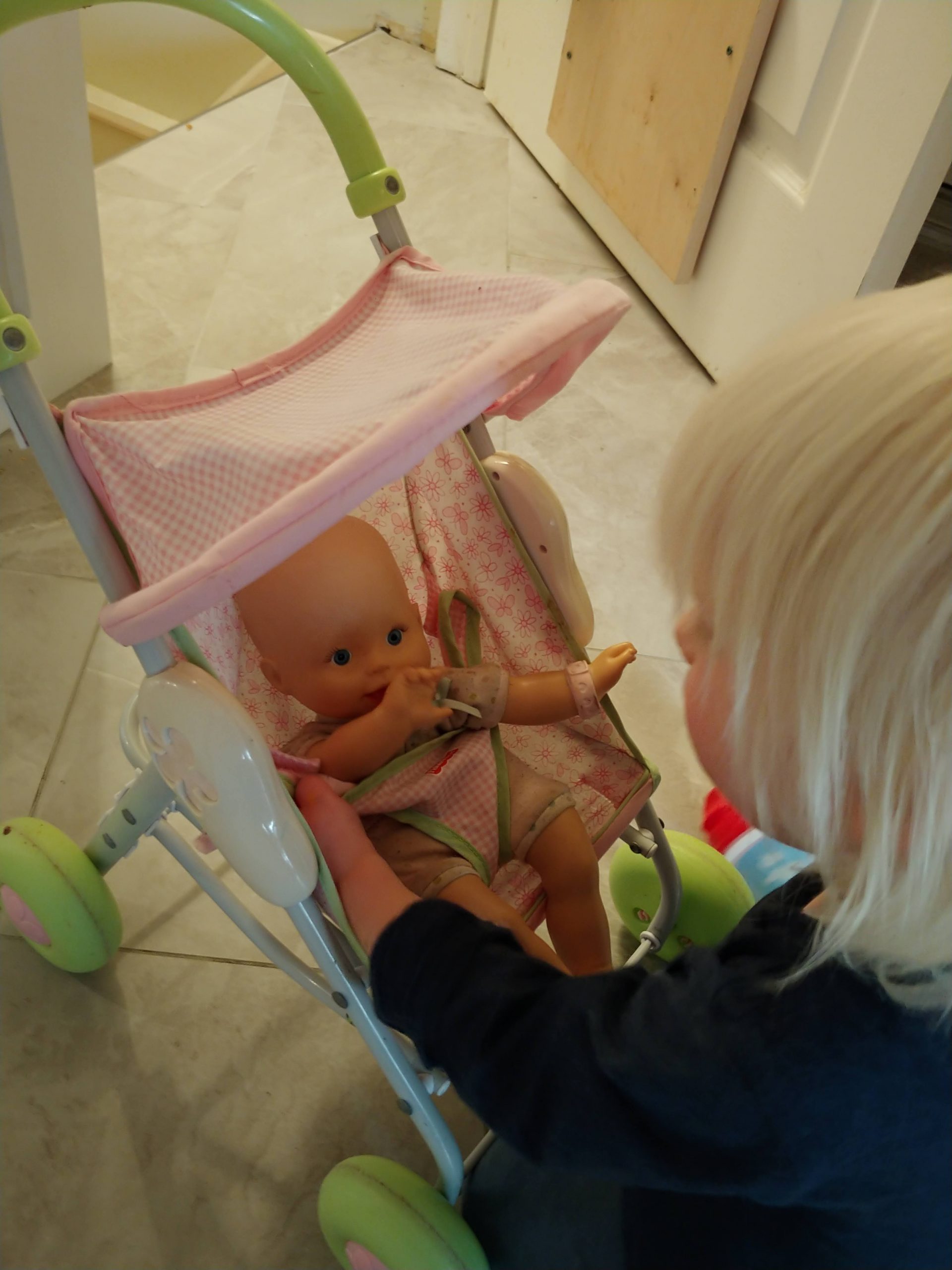 Cadence is still very much interested in potty training but hasn’t quite been successful yet. She does often go by herself to get out her change pad and diapers and wipes and will get undressed and lie herself down to be changed. She now also likes changing her baby doll. We acquired a baby stroller that then became the fought over toy…until a new toy lawnmower showed up as well.