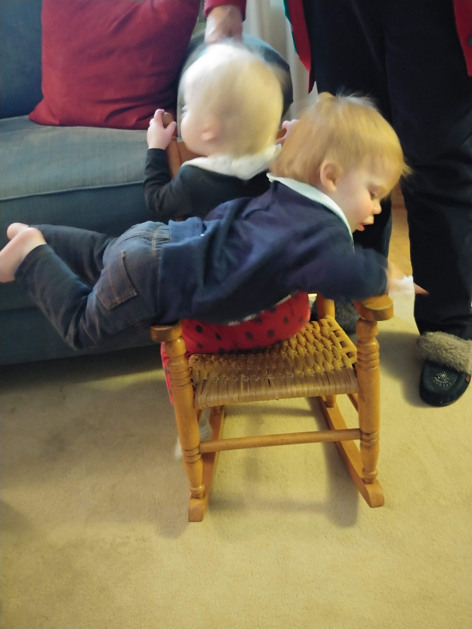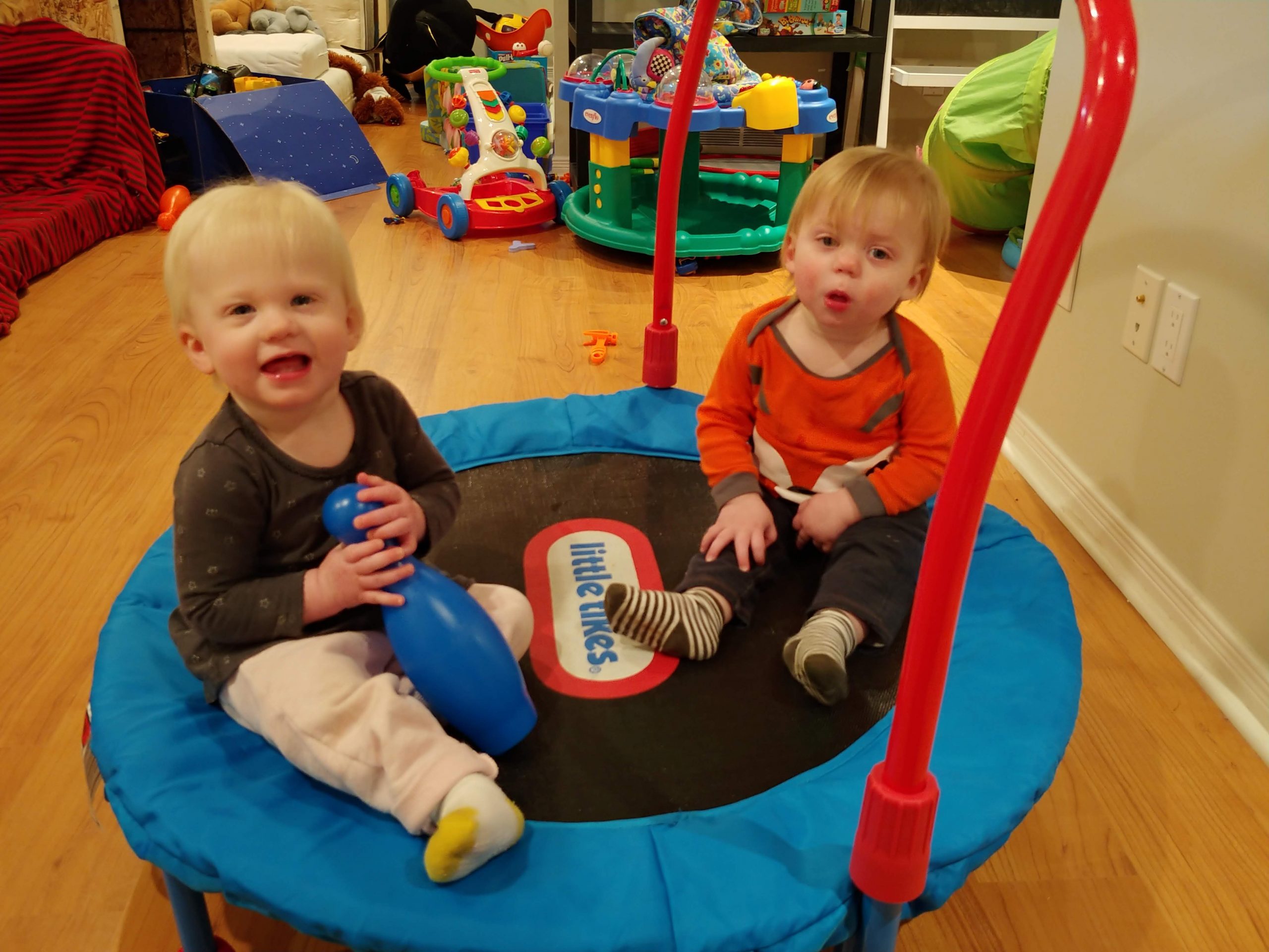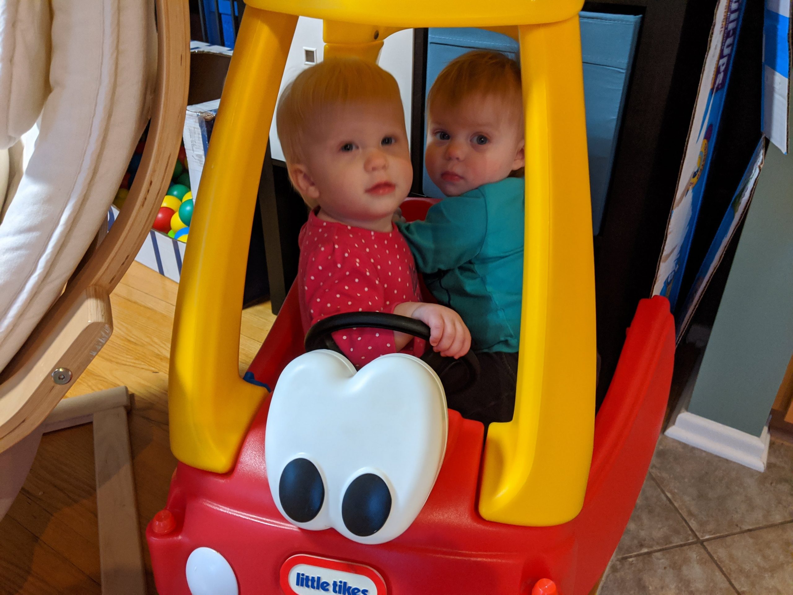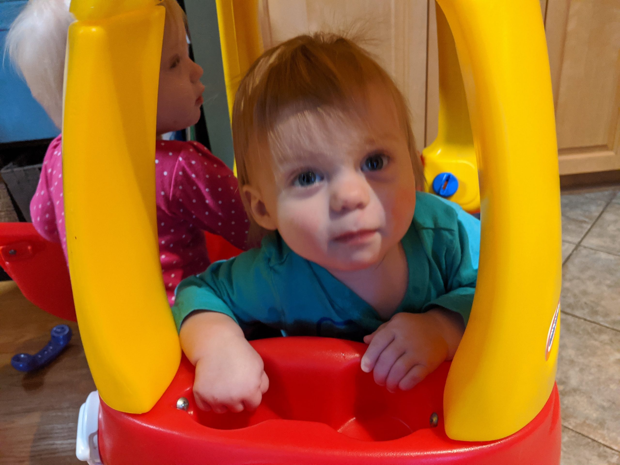 The year mark has brought many changes with the babies, as they are turning into little toddlers. Already in sight are the toddlers’ strong opinions and likely tantrums! Cadence and Asher both walk as their main form of transportation now, but are luckily still in slow motion, though they do tend to go in opposite directions. As their personalities develop, we continue to see more differences between all three kids. Cadence is focused on fine motor skills, trying to eat with utensils, do puzzles, and waving whenever we say hi. Asher has learned to push his ride-on toys up to other furniture to climb up higher, and is constantly surprising us with his escape routes and newest conquests. He never uses the door to get into his new car, and climbs over it instead. Asher plays pretty well independently, while Cadence spends more time pointing to everything over head and wanting to be held up to see. She will sit for long periods to turn pages in books, and will bring us book after book to be read to her. They both hate when doors or gates are closed and they are left behind. They can’t be left out of sight for even a minute, with the latest example when Lindy turned around to find Asher in the bathroom sink! Unfortunately the fighting has started already too – but it is mainly Cadence who keeps walking up to Asher and bonking him on the head or pushing him out of the way!