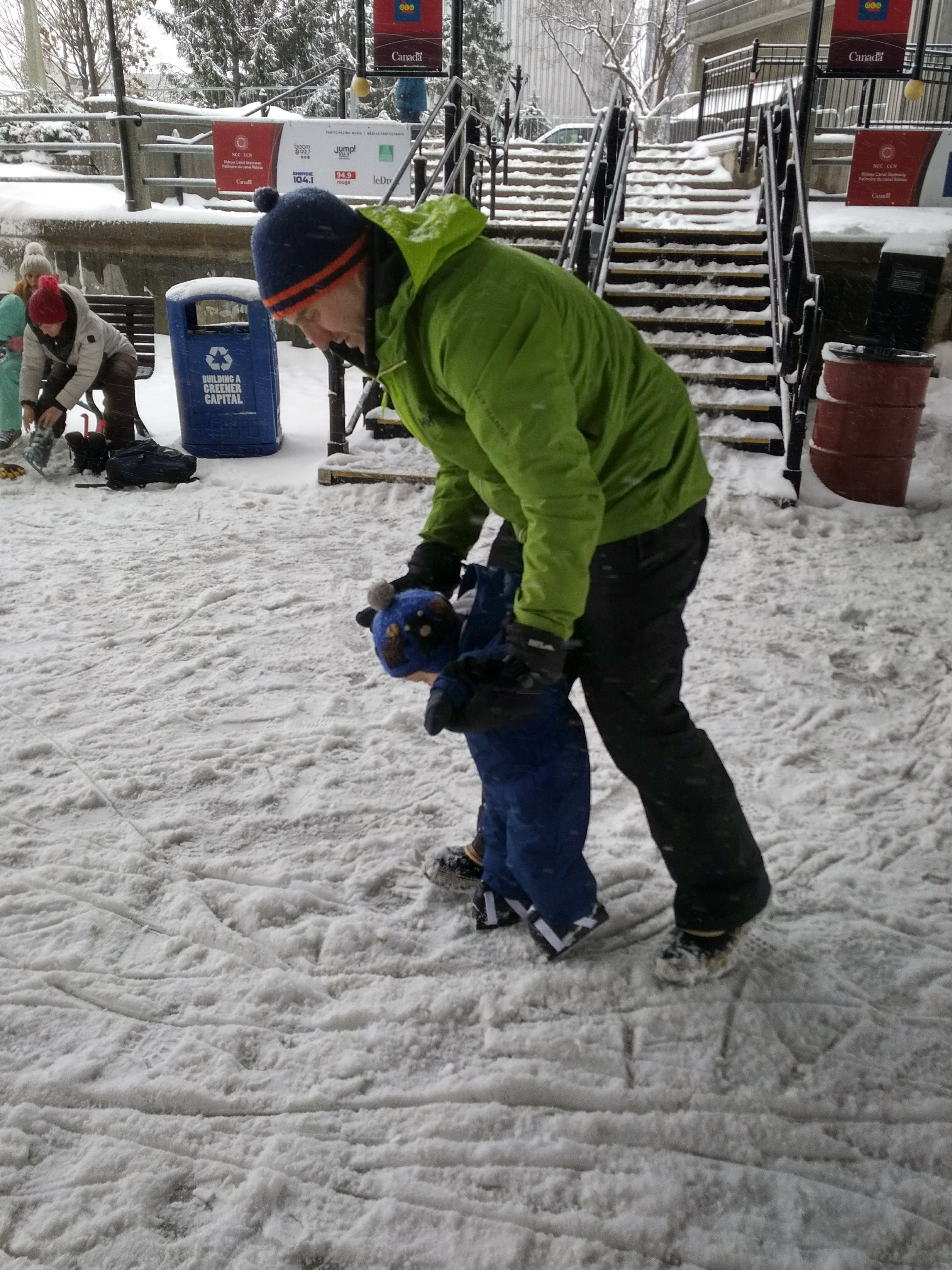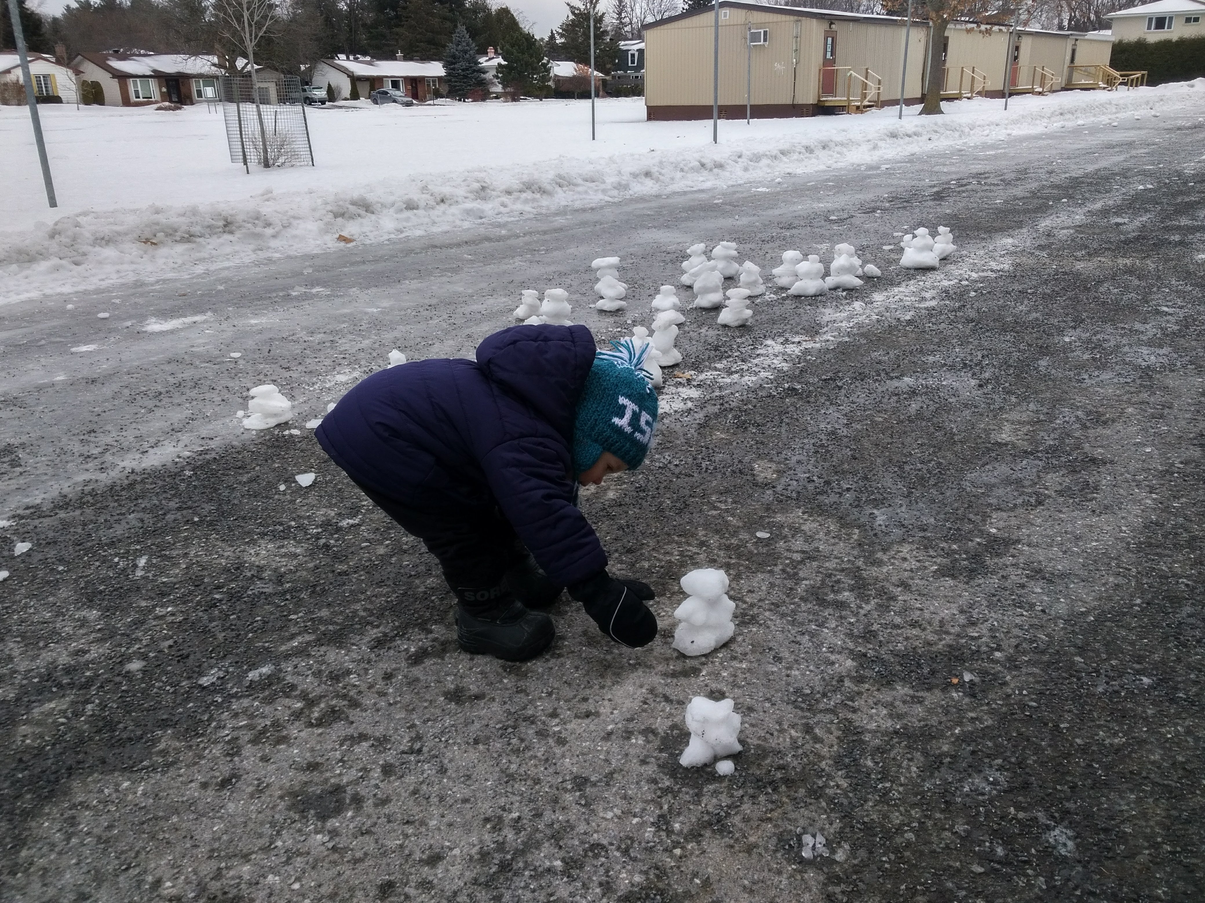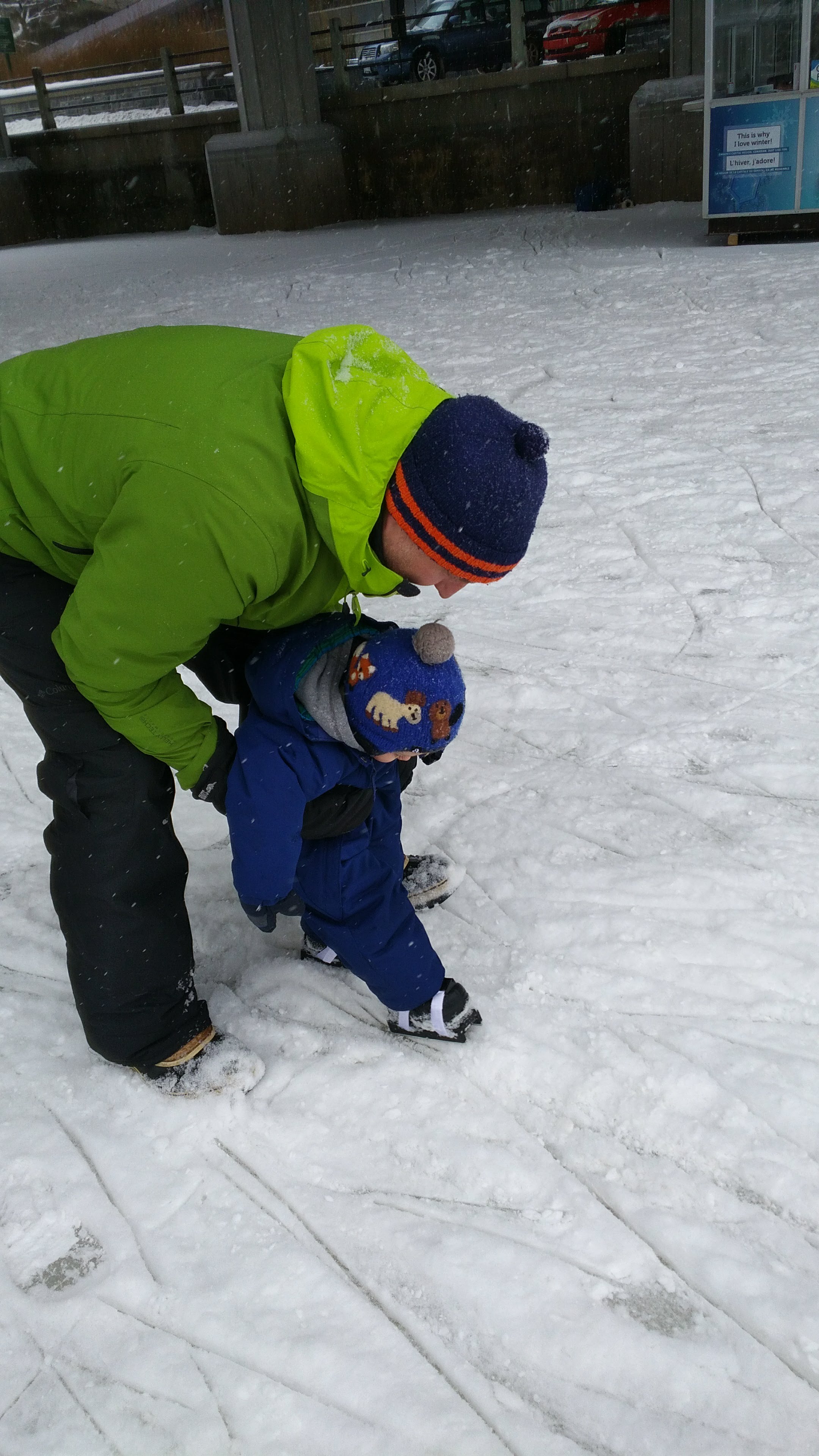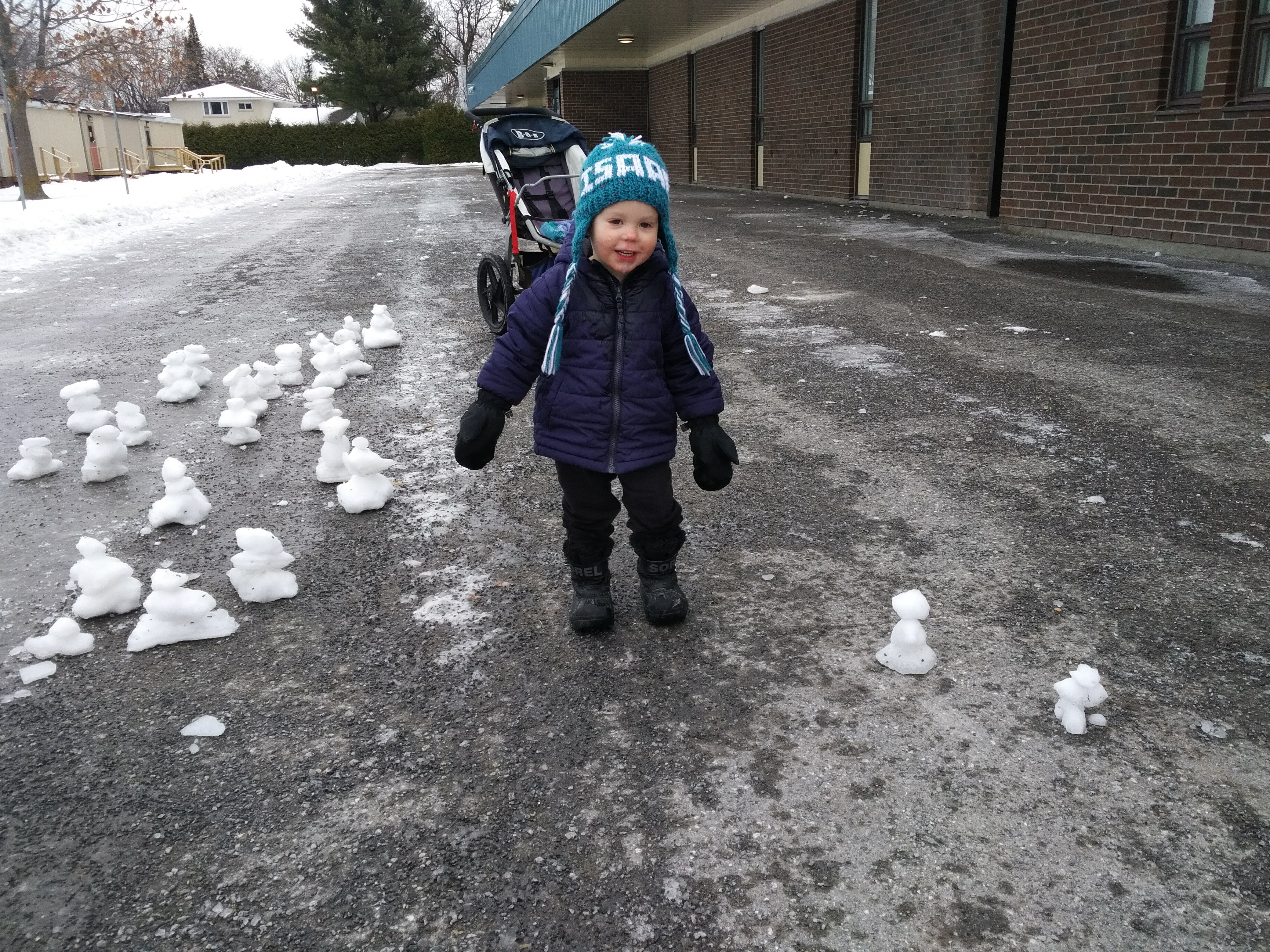 So there aren’t as many photos in this post as usual…due to censorship. Now that Isaac is potty training, it is almost impossible to get him to put pants on. The few times that we were able to get him dressed and out of the house, we went tobogganing, tried skiing and skating. Isaac also really enjoys rebuilding the melting snowmen left behind in the schoolyard – or building his own tiny snowmen.